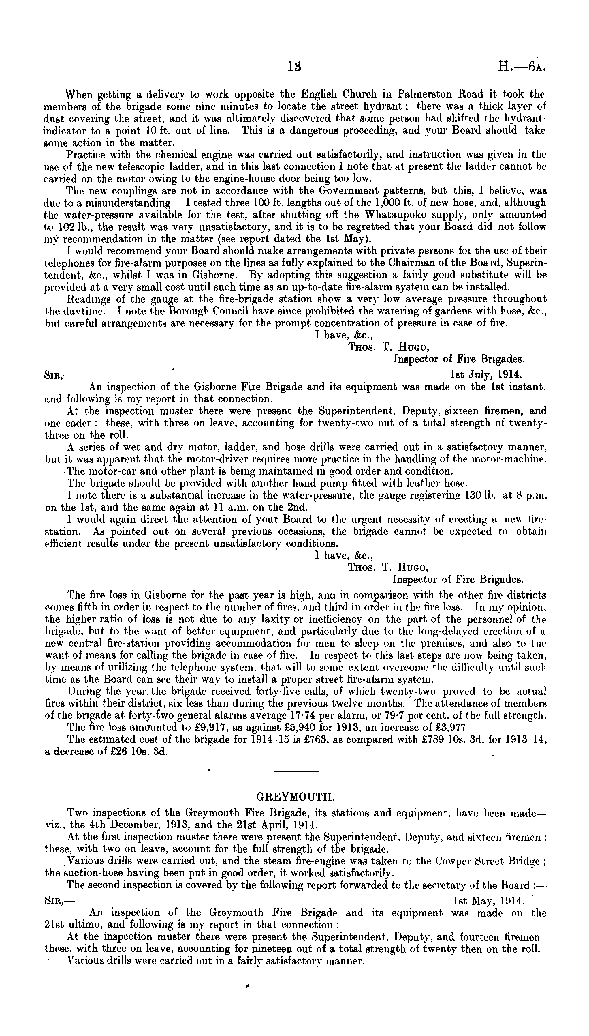 When getting a delivery to work opposite the English Church in Palmerston Road it took the members of the brigade some nine minutes to locate the street hydrant ; there was a thick layer of dust covering the street, and it was ultimately discovered that some person had shifted the hydrantindicator to a point 10 ft. out of line. This is a dangerous proceeding, and your Board should take some action in the matter. Practice with the chemical engine was carried out satisfactorily, and instruction was given in the use of the new telescopic ladder, and in this last connection I note that at present the ladder cannot be eaiiicd on the motor owing to the engine-house door being too low. The new couplings are not in accordance with the Government patterns, but this, 1 believe, was due to a misunderstanding I tested three 100 ft. lengths out of the 1,000 ft. of new hose, and, although the water-pressure available for the test, after shutting off the Whataupoko supply, only amounted to 102 lb., the result was very unsatisfactory, and it is to be regretted that your Board did not follow my recommendation in the matter (see report dated the Ist May). I would recommend your Board should make arrangements with private persons for the use of their telephones for fire-alarm purposes on the lines as fully explained to the Chairman of the Board, Superintendent, &c, whilst I was in Gisborne. By adopting this suggestion a fairly good substitute will be provided at a very small cost until such time as an up-to-date fire-alarm system can be installed. Readings of the gauge at the fire-brigade station show a very low average pressure throughout the daytime. I note the Borough Council have since prohibited the watering of gardens with hose, &c, but careful arrangements are necessary for the prompt concentration of pressure in case of fire. I have, &c, Thos. T. Hugo, Inspector of Fire Brigades. Sir,— Ist July, 1914. An inspection of the Gisborne Fire Brigade and its equipment was made on the Ist instant, and following is my report in that connection. A 1 the inspection muster there were present the Superintendent, Deputy, sixteen firemen, and one cadet: these, with three on leave, accounting for twenty-two out of a total strength of twentythree on the roll. A series of wet and dry motor, ladder, and hose drills were carried out in a satisfactory manner, but it was apparent that the motor-driver requires more practice in the handling of the motor-machine. • The motor-car and other plant is being maintained in good order and condition. The brigade should be provided with another hand-pump fitted with leather hose. I note there is a substantial increase in the water-pressure, the gauge registering 130 lb. at 8 p.m. on the Ist, and the same again at 11 a.m. on the 2nd. I would again direct the attention of your Board to the urgent necessity of erecting a new (irestation. As pointed out on several previous occasions, the brigade cannot be expected to obtain efficient results under the present unsatisfactory conditions. I have, &c, Thos. T. Hugo, Inspector of Fire Brigades. The fire loss in Gisborne for the past year is high, and in comparison with the other fire districts comes fifth in order in respect to the number of fires, and third in order in the fire loss. In my opinion, the higher ratio of loss is not due to any laxity or inefficiency on the part of the personnel of the brigade, but to the want of better equipment, and particularly due to the long-delayed erection of a new central fire-station providing accommodation for men to sleep on the premises, and also to the want of means for calling the brigade in case of fire. In respect to this last steps are now being taken, by means of utilizing the telephone system, that will to some extent overcome the difficulty until such time as the Board can see their way to install a proper street fire-alarm system. During the year, the brigade received forty-five calls, of which twenty-two proved to be actual fires within their district, six less than during the previous twelve months. The attendance of members of the brigade at forty-two general alarms average 17-74 per alarm, or 79*7 per cent, of the full strength. The fire loss amounted to £9,917, as against £5,940 for 1913, an increase of £3,977. The estimated cost of the brigade for 1914-15 is £763, as compared with £789 10s. 3d. for 1913-14, a decrease of £26 10s. 3d. • GREYMOUTH. Two inspections of the Greymouth Fire Brigade, its stations and equipment, have been made— viz., the 4th December. 1913. and the 21st April, 1914. At the first inspection muster there were present the Superintendent, Deputy, and sixteen firemen : these, with two on leave, account for the full strength of the brigade. Various drills were carried out, and the steam fire-engine was taken to the Cowper Street Bridge ; the suction-hose having been put in good order, it worked satisfactorily. The second inspection is covered by the following report forwarded to the secretary of the Board :— Sir,— Ist May, 1914. An inspection of the Greymouth Fire Brigade and its equipment was made on the 21st ultimo, and following is my report in that connection :— At the inspection muster there were present the Superintendent, Deputy, and fourteen firemen these, with three on leave, accounting for nineteen out of a total strength of twenty then on the roll. Various drills were carried out in a fairly satisfactory manner. 0