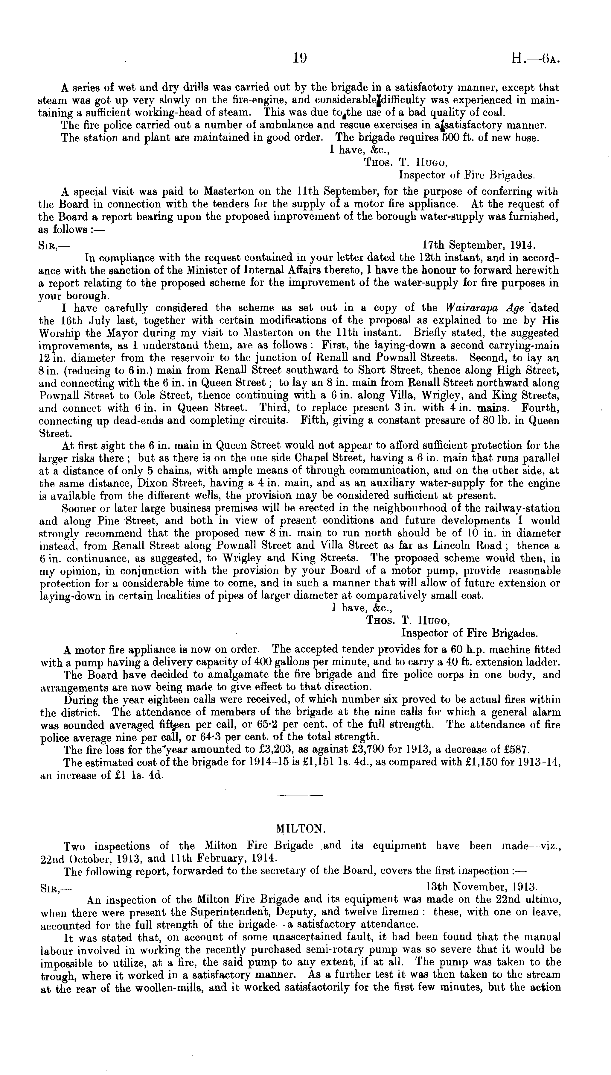 A series of wet and dry drills was carried out by the brigade in a satisfactory manner, except that steam was got up very slowly on the fire-engine, and considerable|difficulty was experienced in maintaining a sufficient working-head of steam. This was due use of a bad quality of coal. The fire police carried out a number of ambulance and rescue exercises in ajsatisfactory manner. The station and plant are maintained in good order. The brigade requires 500 ft. of new hose. 1 have, &c, Thos. T. Huuu, Inspector of Fire Brigades. A special visit was paid to Masterton on the 11th September, for the purpose of conferring with the Board in connection with the tenders for the supply of a motor fire appliance. At the request of the Board a report bearing upon the proposed improvement of the borough water-supply was furnished, as follows :— Sir, — 17th September, 1914. In compliance with the request contained in your letter dated the 12th instant, and in accordant , with the sanction of the Minister of Internal Affairs thereto, 1 have the honour to forward herewith a report relating to the proposed scheme for the improvement of the water-supply for fire purposes in your borough. I have carefully considered the scheme as set out in a copy of the Wairarapa Age dated the 16th July last, together with certain modifications of the proposal as explained to me by His Worship the Mayor during my visit to Masterton on the 11th instant. Briefly stated, the suggested improvements, as I understand them, are as follows : First, the laying-down a second carrying-main 12 in. diameter from the reservoir to the junction of Renall and Pownall Streets. Second, to lay an 8 in. (reducing to 6 in.) main from Renall Street southward to Short Street, thence along High Street, and connecting with the 6 in. in Queen Street; to lay an 8 in. main from Renall Street northward along Pownall Street to Cole Street, thence continuing with a 6 in. along Villa, Wrigley, and King Streets, and connect with 6 in. in Queen Street. Third, to replace present 3 in. with 4 in. mains. Fourth, connecting up dead-ends and completing circuits. Fifth, giving a constant pressure of 801b. in Queen Street. At first sight the 6 in. main in Queen Street would not appeal to afford sufficient protection for the larger risks there ; but as there is on the one side Chapel Street, having a 6 in. main that runs parallel at a distance of only 5 chains, with ample means of through communication, and on the other side, at the same distance, Dixon Street, having a 4 in. main, and as an auxiliary water-supply for the engine is available from the different wells, the provision may lie considered sufficient at present. Sooner or later large business premises will be erected in the neighbourhood of the railway-station and along Pine Street, and both in view of present conditions and future developments I would strongly recommend that the proposed new 8 in. main to run north should be of 10 in. in diameter instead, from Renal! Street along Pownall Street and Villa Street as far as Lincoln Road ; thence a 6 in. continuance, as suggested, to Wrigley and King Streets. The proposed scheme would then, in my opinion, in conjunction with the provision by your Board of a motor pump, provide reasonable protection for a considerable time to come, and in such a manner that will allow of future extension or laying-down in certain localities of pipes of larger diameter at comparatively small cost. 1 have, &c, Thos. T. Hugo, Inspector of Fire Brigades. A motor fire appliance is now on older. The accepted tender provides for a6O h.p. machine fitted with a pump having a delivery capacity of 400 gallons per minute, and to carry a 40 ft. extension ladder. The Board have decided to amalgamate the fire brigade and fire police corps in one body, and arrangements are now being made to give effect to that direction. During the year eighteen calls were received, of which number six proved to be actual fires within tin , district. The attendance of members of the brigade at the nine calls for which a general alarm was sounded averaged fifteen per call, or 65-2 per cent, of the full strength. The attendance of fire police average nine per call, or 64-3 per cent, of the total strength. The fire loss for the"year amounted to £3,203, as against £3,790 for HI 13, a decrease of £587. The estimated cost of the brigade for 1914 15 is £1,151 Is. 4d., as compared with £1,150 for 1913-14, an increase of £1 Is. 4d. MILTON. Two inspections of the Milton Fire Brigade .and its equipment have been made viz., 22nd October, 1913, and 11th February, 1914. The following report, forwarded to the secretary of the Board, covers the first inspection : Sμ:. 13th November, 1913. An inspection of the .Milton Fire Brigade and its equipment was made on the 22nd ultimo, when there were present the Superintendent, Deputy, and twelve firemen : these, with one on leave, accounted for the full strength of the satisfactory attendance. It was stated that, on account of sonic unascertained fault, it had been found that the manual labour involved in working the recently purchased semi-rotary pump was so severe that it would be impossible to utilize, at a fire, the said pump to any extent, if at all. The pump was taken to the trough, where it worked in a satisfactory manner. As a further test it was then taken to the stream at the rear of the woollen-mills, and it worked satisfactorily for the first few minutes, but the action