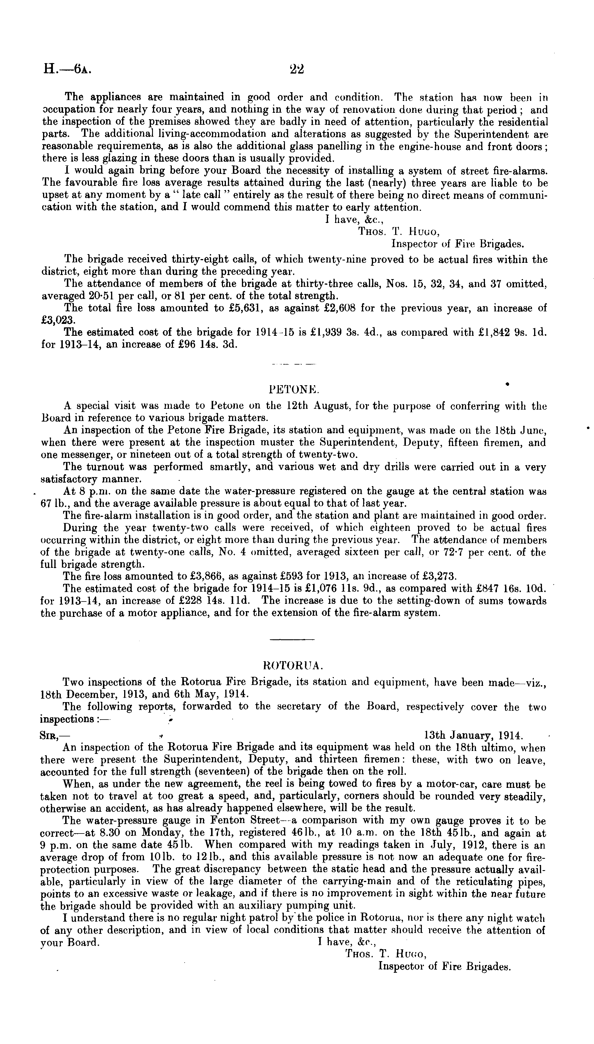 The appliances are maintained in good order and condition. The station has now been in occupation for nearly four years, and nothing in the way of renovation done daring I imi period ; and the inspection of the premises showed they are badly in need of attention, particularly the residential parts. The additional living-accommodation and alterations as suggested l>v the Superintendent are reasonable requirements, as is also the additional glass panelling in the engine-house and front doors; there is less glazing in these doors than is usually provided. I would again bring before your Board the necessity of installing a system of street fire-alarms. The favourable fire loss average results attained during the last (nearly) three years are liable to be upset at any moment by a " late call " entirely as the result of there being no direct means of communication with the station, and I would commend this matter to early attention. I have, Arc. Thos. T. Hugo, Inspector of Fire Brigades. The brigade received thirty-eight calls, of which twenty-nine proved to be actual fires within the district, eight more than during the preceding year. The attendance of members of the brigade at thirty-three calls, Nos. 15, 32, 34. and :>7 omitted. averaged 20-51 per call, or 81 per cent, of the total strength. The total fire loss amounted to £5,631, as against £2,608 for the previous year, an increase of £3,023. The estimated cost of the brigade for 1914 15 is £1,939 3s. 4d., as compared with £1,842 '.)s. Id. for 1913-14, an increase of £96 14s. 3d. PETONE. A special visit was made to I , clone on the 12th August, for the purpose of conferring with the Board in reference to various brigade matters. An inspection of the Petone Fire Brigade, its station and equipment, was made on the 18th June. when there were present at the inspection muster the Superintendent, Deputy, fifteen firemen, and one messenger, or nineteen out of a total strength of twenty-two. The turnout was performed smartly, and various wet and dry drills were carried out in a very satisfactory manner. At 8 p.m. on the same date the water-pressure registered on the gauge at the central station was l>7 lb., and the average available pressure is about equal to that of last year. The fire-alarm installation is in good order, and the station and plani are maintained in good order. During the year twenty-two calls were received, of which eighteen proved to he actual fires occurring within the district, or eight more than during the previous year. The attendance of members of the brigade at twenty-one calls, No. 4 omitted, averaged sixteen per call, or 72-7 per cent, of the full brigade strength. The fire loss amounted to £3,866, as against £593 for 1913, an increase of £3,273. The estimated cost of the brigade for 1914-15 is £1,076 11s. '.Id., as compared with £847 16s. 10d. for 1913 11, an increase of £228 14s. lid. The increase is due to the setting-down of sums towards the purchase of a motor appliance, and for the extension of the fire-alarm system. HOTORUA. Two inspections of the Rotorua Fire Brigade, its station and equipment, have been made- viz., 18th December, 1913, and 6th May, 1914. The following reports, forwarded to the secretary of the Board, respectively cover the two inspections: — Sib,— - 13th January, 1914. An inspection of the Rotorua Fire Brigade and its equipment was held on the 18th ultimo, when there were present the Superintendent, Deputy, and thirteen firemen: these, with two on leave, accounted for the full strength (seventeen) of the brigade then on the roll. When, as under the new agreement, the reel is being towed to fires by a motor-car, care must be taken not to travel at too great a speed, and, particularly, corners should be rounded very steadily, otherwise an accident, as has already happened elsewhere, will be the result. The water-pressure gauge in Fenton Street a comparison with my own gauge proves it to be correct —at 8.30 on Monday, the 17th, registered 461b., at 10 a.m. on the 18th 451b., and again at 9 p.m. on the same date 451b. When compared with my readings taken in July, 1912, there is an average drop of from 10 lb. to J 2 lb., and this available pressure is not now an adequate one for fireprotection purposes. The great discrepancy between the static head and the pressure actually available, particularly in view of the large diameter of the carrying-main and of the reticulating pipes, points to an excessive waste or leakage, and if there is no improvement in sight within the near future the brigade should be provided with an auxiliary pumping unit. I understand there is no regular night patrol by the police in Rotorua, nor is there any night watch of any other description, and in view of local conditions that matter should receive the attention of your Board. 1 have, &c, Thos. T. Hugo, Inspector of Fire Brigades.
