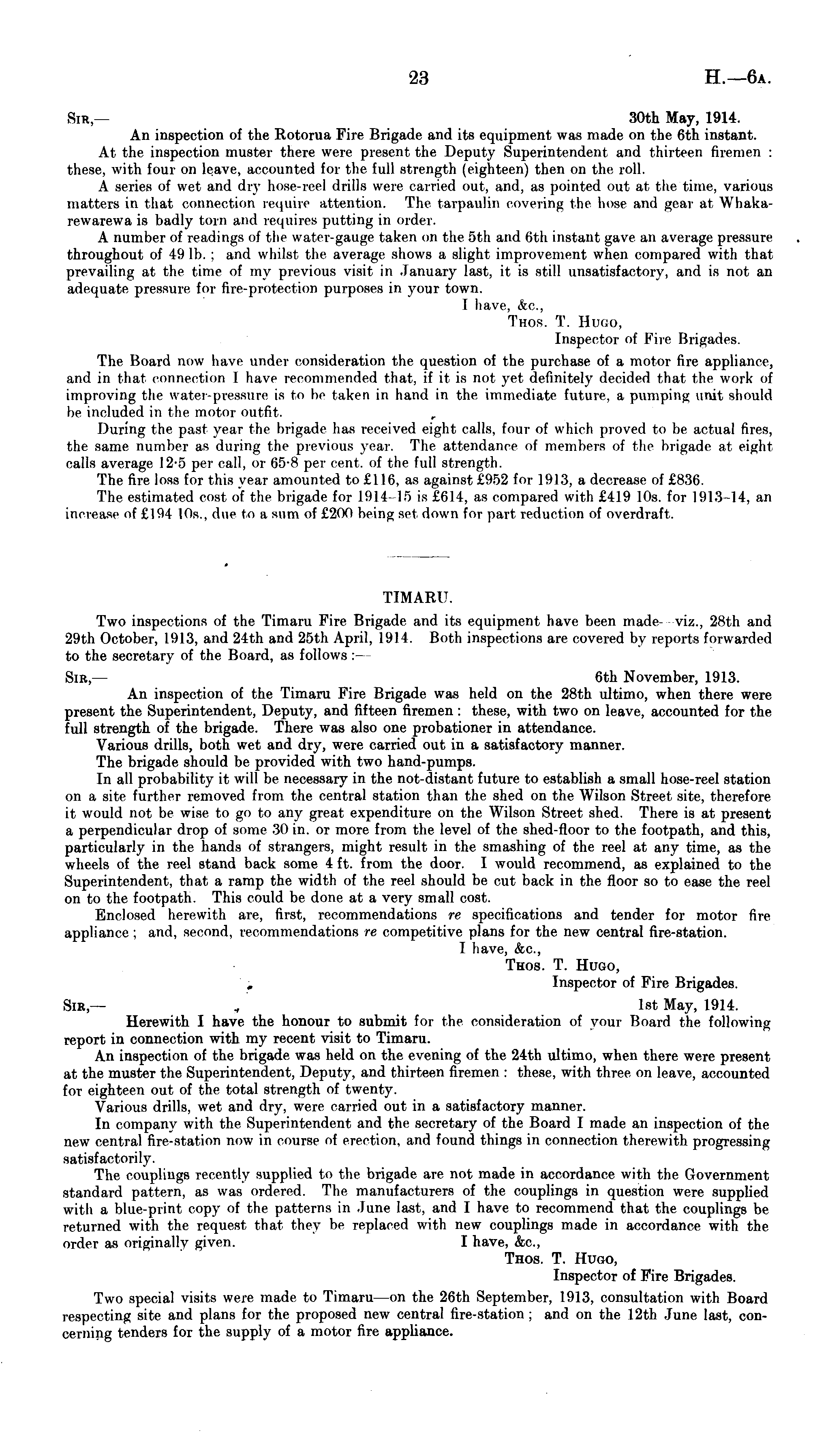 Sir,— 30th May, 1914. An inspection of the Rotovua Fire Brigade and its equipment was made on the 6th instant. At the inspection muster there were present the Deputy Superintendent and thirteen firemen : these, with four OH leave, accounted for tlie lull strength (eighteen) then on the roll. A series of wet and dry hose-reel drills were carried out. and. as pointed out at (lie time, various matters in that connection require attention. The tarpaulin covering the hose and gear at Wliakarewarewa is badly torn and requires putting in order. A number of readings of the water-gauge taken on the sth and 6th instant gave an average pressure throughout of 49 II). ; and whilst the average shows a slight improvement when compared with thatprevailing at the time of my previous visit in January last, it is still unsatisfactory, and is not an adequate pressure for fire-protection purposes in your town. I have, &c, Thos. T. Hugo, Inspector vi Fire Brigades. The Board now have under consideration the question of the purchase of a motor fire appliance, and in that connection I have recommended that, if it is not yet definitely decided that the work of improving the water-pressure is to he taken in hand in the immediate future, a pumping unit should be included in t he motor outfit. During the past year the brigade has received eight calls, four of which proved to be actual fires, the same number as during the previous year. The attendance of members of the brigade at eight calls average 12-5 per call, or 05-8 per cent, of the full strength. The fire loss for this year amounted to £116, as against £952 for 1913, a decrease of £836. The estimated cost of the brigade for I'M I 15 is £614, as compared with £419 10s. for 191314, an increase of £ 194 lOs., due to a sum of E2OO being set down for part reduction of overdraft. TIMARU. Two inspections of the Timaru Fire Brigade and its equipment have been made viz., 28th and 29th October, 1913, and 24th and 25th April, 1911. Both inspections are covered by reports forwarded to the secretary of the Board, as follows : Sir,— 6th November, 1913. An inspection of the Timaru Fire Brigade was held on the 28th ultimo, when there were present the Superintendent, Deputy, and fifteen firemen : these, with two on leave, accounted for the full strength of the brigade. There was also one probationer in attendance. Various drills, both wet and dry, were carried out in a satisfactory manner. The brigade should be provided with two hand-pumps. In all probability it will be necessary in the not-distant future to establish a small hose-reel station on a site further removed from the central station than the shed on the Wilson Street site, therefore it would not be wise to go to any great expenditure on the Wilson Street shed. There is at present a perpendicular drop of some 30 in. or more from the level of the shed-floor to the footpath, and this, particularly in the hands of strangers, might result in the smashing of the reel at any time, as the wheels of the reel stand back some 4 ft. from the door. I would recommend, as explained to the Superintendent, that a ramp the width of the reel should be cut back in the floor so to ease the reel on to the footpath. This could be done at a very small cost. Enclosed herewith are, first, recommendations re specifications and tender for motor fire appliance ; and, second, recommendations re competitive plans for the new central fire-station. I have, &c, Thos. T. Hugo, Inspector of Fire Brigades. Sir— , Ist May, 1914. Herewith I have the honour to submit for the consideration of your Board the following report in connection with my recent visit to Timaru. An inspection of the brigade was held on the evening of the 24th ultimo, when there were present at the muster the Superintendent, Deputy, and thirteen firemen : these, with three on leave, accounted for eighteen out of the total strength of twenty. Various drills, wet and dry, were carried out in a satisfactory manner. In company with the Superintendent and the secretary of the Board I made an inspection of the new central fire-station now in course of erection, and found things in connection therewith progressing satisfactorily. The couplings recently supplied to the brigade are not made in accordance with the Government standard pattern, as was ordered. The manufacturers of the couplings in question were supplied with a blue-print copy of the patterns in June last, and I have to recommend that the couplings be returned with the request that they be replaced with new couplings made in accordance with the older as originally given. I have, &c, Thos. T. Hugo, Inspector of Fire Brigades. Two special visits were made to Timaru—on the 26th September, 1913, consultation with Board respecting site and plans for the proposed new central fire-station; and on the 12th June last, concerning tenders for the supply of a motor fire appliance.