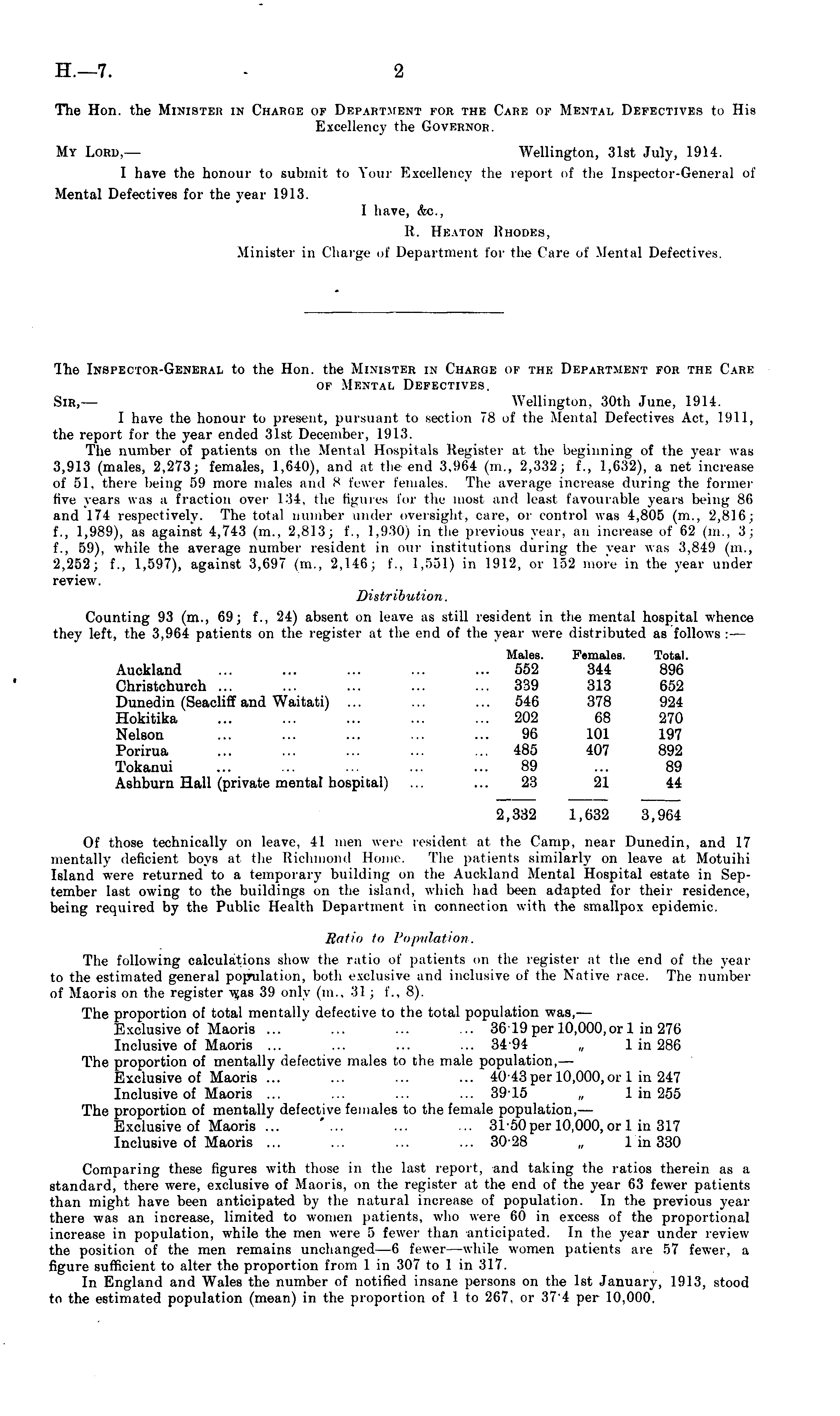 The Hon. the Minister in Charge of Department for the Cake of Mental Defectives to His Excellency the Governor. My Lord, — Wellington, 31st July, 1914. I have the honour to submit to Your Excellency the report of the Inspector-General of Mental Defectives for the year 1913. 1 have, &c, R. Heaton Rhodes, Minister in Charge of Department for the Care of Mental Defectives.
