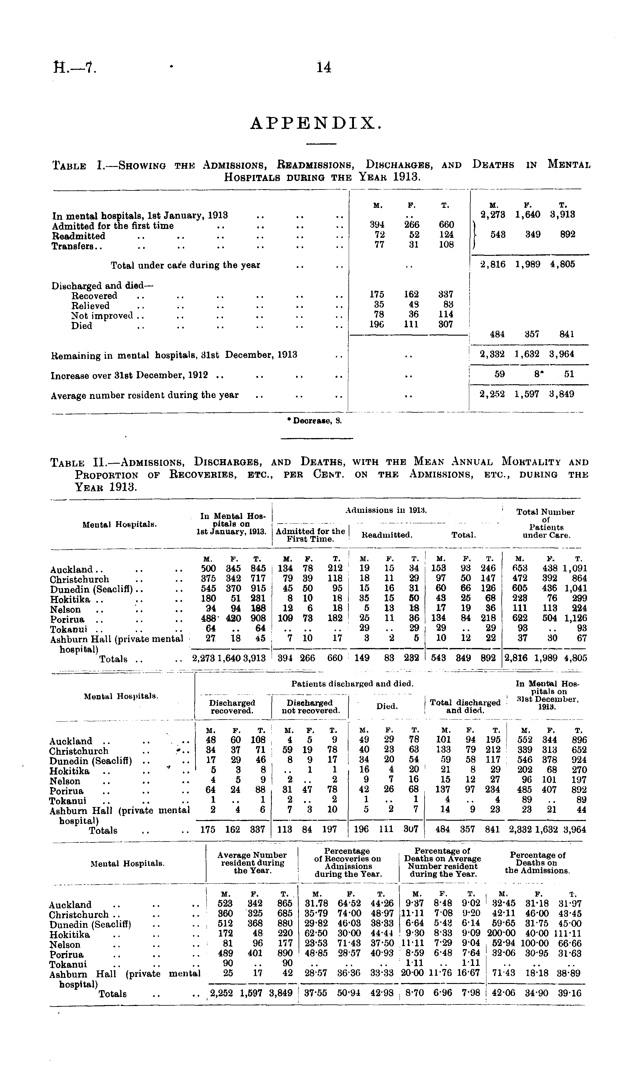 Admissions in 1913. Total Number of Patients under Care. Mental Hospitals. In Mental Hospitals on 1st January, 1913. A,1 Fh^Thr 1,u I *»*>.»«. Total. M. F. T. Auckland.. .. .. 500 345 845 Christchurch .. .. 375 342 717 Dunedin (Seacliff).. .. 545 370 915 Hokitika 180 51 231 Nelson .. .. .. 94 94 188 Porirua .. .. .. 488 420 908 Tokanui .. .. ■. 64 .. 64 Ashburn Hall (private mental 27 18 45 hospital) Totals .. .. 2,273 1,640 3,913 M. P. 134 78 79 39 45 50 8 10 12 6 109 73 i io T. M. 212 19 118 18 95 15 18 35 18 5 182 25 29 17 3 F. 15 11 16 15 13 11 2 T. 34 29 31 50 18 36 29 5 M. 153 97 60 43 17 134 29 10 p. T. 93 246 50 147 66 126 25 68 19 36 84 218 .. 29 12 22 M. 053 472 605 2-23 111 622 93 37 P. T. 438 1,091 392 864 436 1,041 76 299 113 224 504 1,126 93 30 67 394 260 660 149 83 232 543 349 892 2,816 1,989 4,805 Patients disci larfjed and died. In Mental Hospitals on 1)k .,, Total discharged 1,11 ''• and died. 19 "- Mental Hospitals. Discharged recovered. Discharged not recovered. Auckland .. .. .... Christchurch .. Dunedin (Seaclifl) Hokitika Nelson Porirua Tokanui Ashburn Hall (private mental hoepital) Totals M. F. T. M. P. 48 60 108 4 5 34 37 71 59 19 17 29 46 8 9 5 3 8 .. 1 4 5 9 2 .. 64 24 88 31 47 1 .. 1 2 .. 2 4 6 7 3 175 162 337 113 84 T. 9 78 17 1 2 78 2 10 197 M. P. T. 51. P. T. ' M. P. T. 49 29 78 101 94 195 552 344 896 40 23 63 133 79 212 339 313 652 34 20 54 59 58 117 546 378 924 16 4 20 21 8 29 202 68 270 9 7 16 15 12 27 96 101 197 42 26 68 137 97 234 485 407 892 1 .. 1 4 .. 4 89 .. 89 5 2 7 14 9 23 23 21 44 113 84 197 196 111 307 484 357 841 2,332 1,632 3,964 Mental Hospitals. Average Number resident during the Year. Percei of Kecoy Admii during tl itage eries on isions tie Year. jgggfi '"^Zns. If. P. T. M. P. T. M. P. T. , H. P. T. Auckland .. .. .. 523 342 865 31.78 6452 44-26 9-37 8-48 9-02 32-45 31-18 3197 Christchurch.. .. .. 360 325 685 35-79 7400 4897 11-11 708 <J-20 42-11 46-00 43-45 Dunedin (Seacliff) .. .. 512 368 880 2982 46-03 38-33 664 543 614 5965 3175 4500 Hokitika .. .. •• 172 48 220 62-50 30-00 44-44 9-30 833 909 20000 4000 111-11 Nelson .. .. ■• 81 96 177 23-53 71-43 37-50 1111 729 904 52-94 10000 6666 Porirua .. .. •■ 489 401 890 4885 2857 4093 8-59 6-48 764 32-00 30-95 31-63 Tokanui 90 .. 90 Ill .. Ill , Ashburn Hall (private mental 25 17 42 2857 3636 33-33 20-00 11-76 1667 7143 18-18 3889 hospital) Totals .. .. 2,252 1,597 3,849 37-55 50-94 42-98 870 696 7-98 4206 3490 3916 M. F. T. , H. P. T. 9-37 8-48 9-02 ' 32-45 31-18 31-97 11-11 708 <J-20 42-11 46-00 43-45 6-64 5-43 614 5965 3175 4500 9-30 8-33 9'09 200-00 40-00 111-11 11-11 7-29 904 52-94 10000 6666 8-59 6-48 7-64 32-00 30-95 31-63 111 .. Ill 2000 11-76 16-67 7143 18-18 38-89