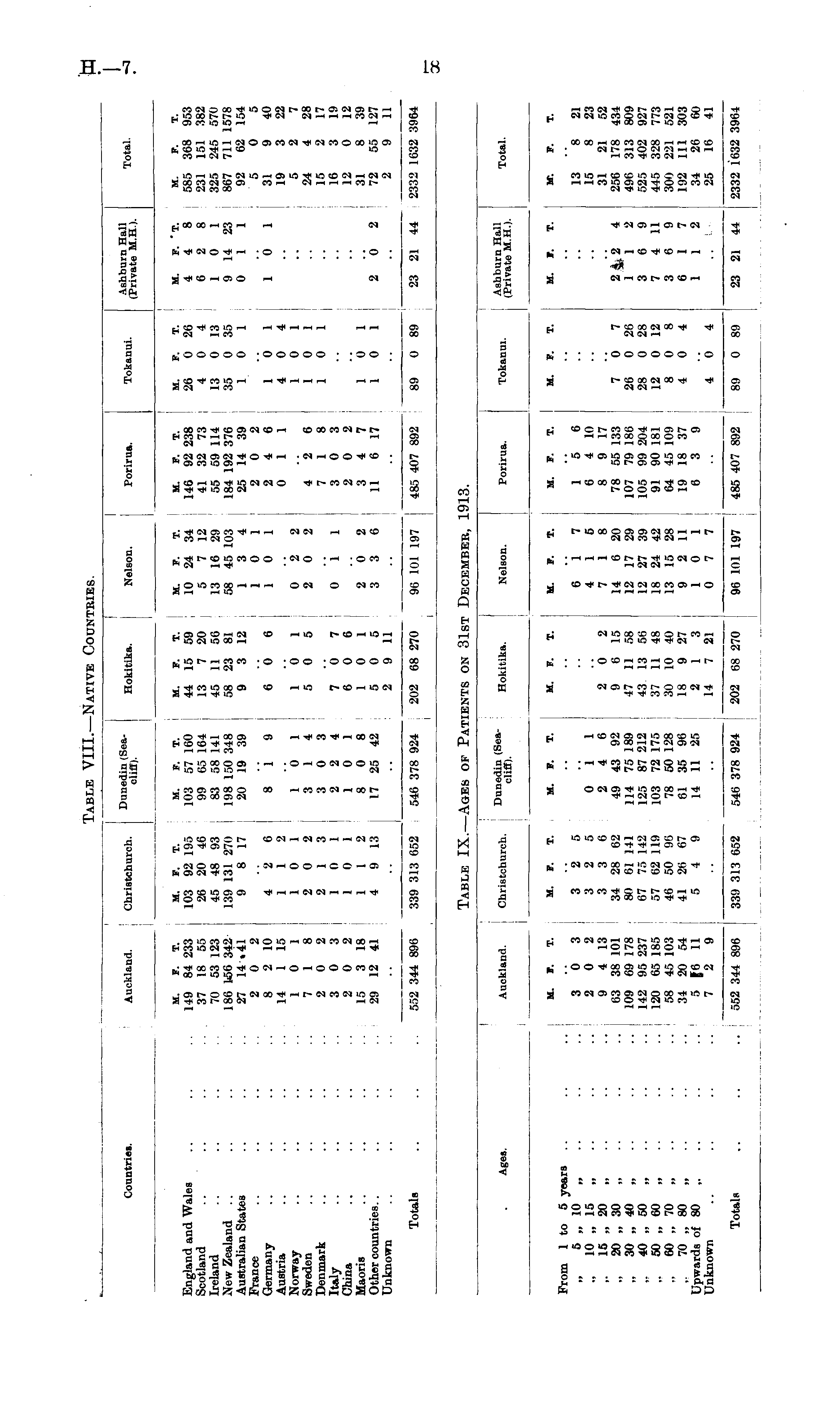 Countries. Auckland. Christchurch. Dun^|£ ) ! Sea - Hokitika. Nelson. Porirua. Tokanui. Ashburn Hall (Private M.H.). Total. England and Wales Scotland Ireland New Zealand .. Australian States France Germany Austria Norway Sweden Denmark Italy China Maoris Other countries.. Unknown M. F. T. 149 84 233 37 18 55 70 53 123 186 l<56 342 27 14.41 2 0 2 8 2 10 14 1 15 1 0 1 7 1 8 2 0 2 3 0 3 2 0 2 15 3 18 29 12 41 103 92 195 26 20 46 45 48 93 130 131 270 I 9 8 17 4 2 6 1 1 2 1 0 1 2 0 2 2 1 3 1 0 1 I 0 1 1 1 2 4 9 13 103 57 160 99 65 164 83 58 141 198 150 348 20 19 39 8 19 1 0 1 3 1 4 3 0 3 2 2 4 1 0 1 8 0 8 17 25 42 M. F. T. 44 15 59 13 7 20 45 11 56 58 23 81 9 3 12 6 0 6 1 6 1 5 0 5 7 0 7 6 0 6 10 1 5 0 5 2 9 11 10 24 34 146 92 238 5 7 12 i 41 32 73 13 16 29 55 59 114 j 58 45 103 184 192 376 13 4 25 14 39 10 1 2 0 2 10 1 2 4 6 0 11 0 2 2 2 0 2 4 2 6 7 18 011 303 2 0 2 2 0 2 3 4 7 3 3 6 11 6 17 M. 26 4 13 35 1 1 4 1 1 1 1 1 F. T. 0 26 0 4 0 13 0 35 0 1 0 1 0 4 0 1 0 1 0 1 0 1 0 1 M. F. 'T. M. P. T. 4 4 8 585 368 953 6 2 8 231 151 382 10 1 325 245 570 9 14 23 867 711 1578 0 11 92 62 154 5 0 5 10 1 31 9 40 19 3 22 5 2 7 24 4 28 15 2 17 16 3 19 12 0 12 31 8 39 2 0 2 72 55 127 2 9 11 " Totals 552 344 896 552 344 896 339 313 652 339 313 652 546 378 924 546 378 924 202 68 270 202 68 270 96 101 197 485 407 892 96 101 197 485 407 892 89 89 0 89 0 89 23 21 44 2332 1632 3964 23 21 44 2332 1632 3964