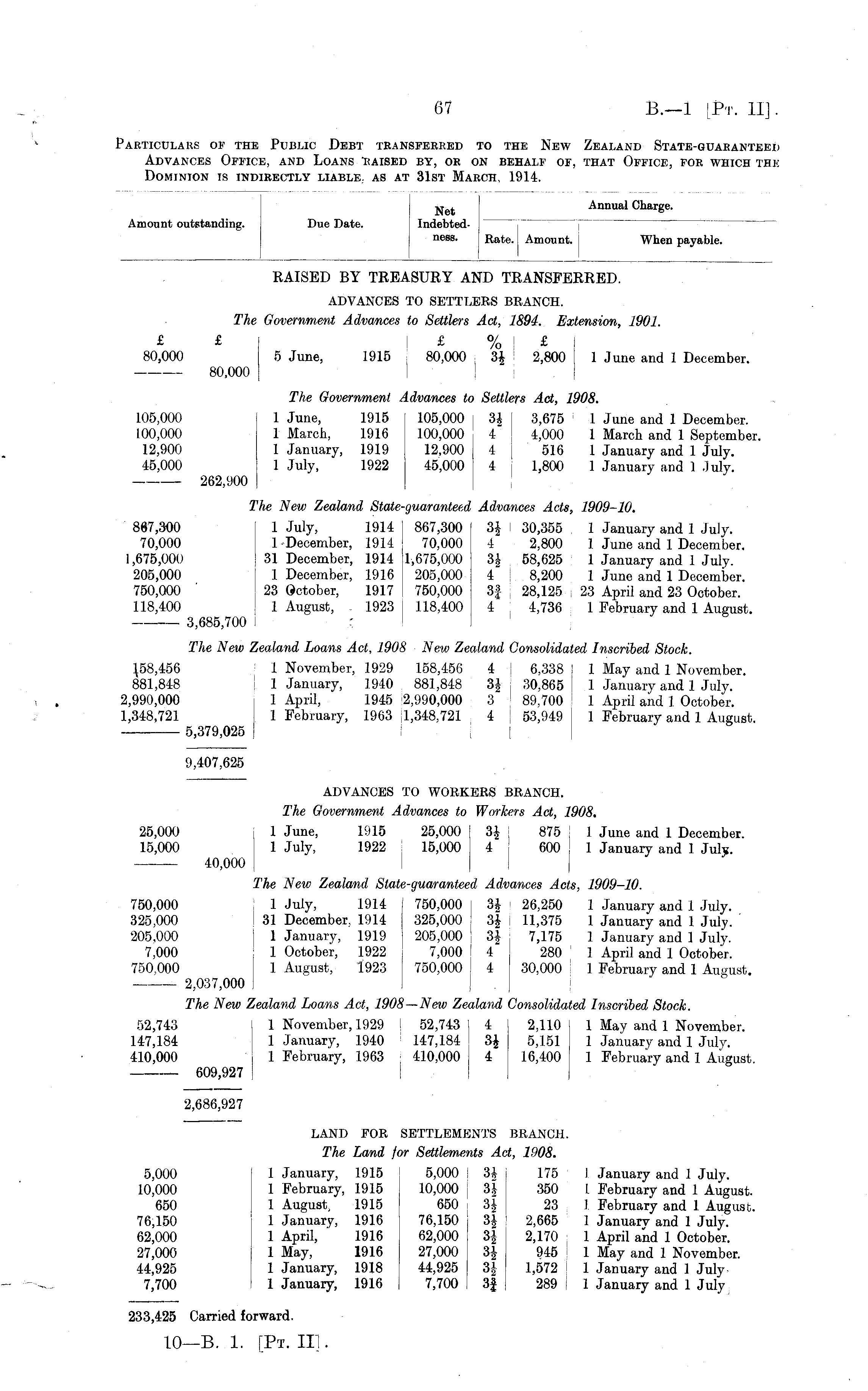 Due Date. Net Indebtedness. nnual large. Amount outstanding. Rate. Amount. When payable. RAISED BY TREASURY AND TRANSFERRED. ADVANCES TO SETTLERS BRANCH. The Government Advances to Settlers Act, 1894. Extension, 1901. £ £ £ % £ I 80,000 5 June, 1915 80,000 Z\ 2,800 1 June and 1 December. 80,000 The Government Advances to Settlers Act, 1908. 105,000 1 June, 1915 105,000 3£ | 3,675 1 June and 1 December. 100,000 1 March., 1916 100,000 4 4,000 1 March and 1 September. 12,900 1 January, 1919 12,900 4 516 1 January and 1 July. 45,000 1 July, 1922 45,000 4 1,800 1 January and 1 July. 262,900 I The New Zealand State-guaranteed Advances Acts, 1909-10. 867,300 1 July, 1914 ! 867,300 3| ' 30,355 1 January and 1 July. 70,000 1 December, 1914 ' 70,000 4 2,800 1 June and 1 December. 1,675,000 31 December, 1914 1,675,000 3| 58,625 1 January and 1 July. 205,000 1 December, 1916 i 205,000 4 8,200 1 June and 1 December. 750,000 23 October, 1917 I 750,000 3f 28,125 23 April and 23 October. 118,400 1 August, 1923 I 118,400 4 4,736 1 February and 1 August. 3,685,700 ! The New Zealand Loans Act, 1908 New Zealand Consolidated Inscribed Stock. 1.58,456 1 November, 1929 158,456 4 6,338 I 1 May and 1 November. 881,848 1 January, 1940 881,848 3| ; 30,865 I 1 January and 1 July. 2,990,000 1 April, 1945 '2,990,000 3 ! 89,700 ! 1 April and 1 October. 1,348,721 1 February, 1963 1,348,721 4 53,949 1 February and 1 August. 5,379,025 9,407,625 ADVANCES TO WORKERS BRANCH. The Government Advances to Workers Act, 1908. 25,000 1 June, 1915 25,000 3| 875 1 June and 1 December. 15,000 1 July, 1922 15,000 4 600 1 January and 1 July. 40,000 I The New Zealand State-guaranteed Advances Acts, 1909-10. 750,000 1 July, 1914 I 750,000 ! 3J 26,250 1 January and 1 July. 325,000 31 December, 1914 j 325,000 3| 11,375 1 January and 1 July. 205,000 1 January, 1919 ! 205,000 3J 7,175 1 January and 1 July. 7,000 1 October, 1922 7,000 I 4 280 1 April and 1 October. 750,000 1 August, 1923 750,000 j 4 30,000 ' 1 February and 1 August. 2,037,000 j . The New Zealand Loans Act, 1908—New Zealand Consolidated Inscribed Stock. 52,743 1 November, 1929 52,743 4 2,110 1 May and 1 November. 147,184 1 January, 1940 147,184 3£ 5,151 1 January and 1 Julv. 410,000 1 February, 1963 410,000 4 16,400 1 February and 1 August. 609,927 2,686,927 LAND FOR SETTLEMENTS BRANCH. The Land for Settlements Act, 1908. 5,000 1 January, 1915 j 5,000 ! 3* 175 1 January and 1 July. 10,000 1 February, 1915 10,000 j 3| 350 1 February and 1 August. 650 1 August, 1915 650 i 3J 23 1 February and 1 August. 76,150 1 January, 1916 76,150 3| 2,665 1 Januarv and 1 July. 62,000 1 April, 1916 62,000 3J 2,170 1 April and 1 October. 27,000 1 May, 1916 27,000 3| 945 1 May and 1 November. 44,925 1 January, 1918 44,925 3| 1,572 ! 1 January and 1 July 7,700 1 January, 1916 7,700 3f 289 | 1 January and 1 July 233,425 Carried forward.