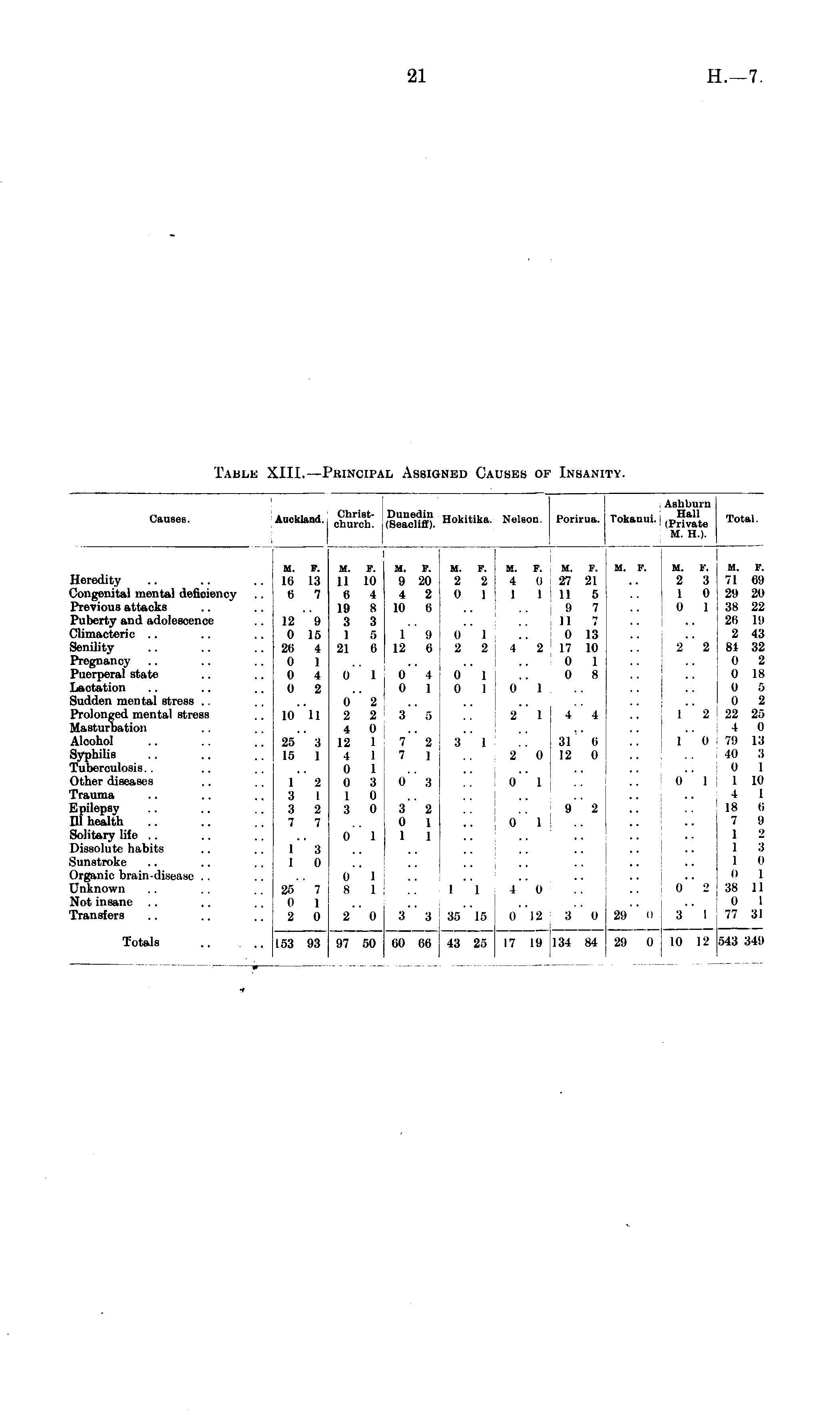 Causes. Auckland. Christchurch. Aehburn (SeacHff) Hokitika. Nelson. Porirua. Tokauui. (P 2?"te M. H.). Total. Heredity Congenital mental deficiency Previous attacks Puberty and adolescence Climacteric Senility Pregnancy Puerperal state Lactation Sudden mental stress .. Prolonged mental stress Masturbation Alcohol Syphilis Tuberculosis Other diseases Trauma Epilepsy 111 health Solitary life Dissolute habits Sunstroke Organic brain-diseaee . Unknown Not insane Transfers M. F. hi 13 li 7 12 9 0 15 20 4 0 1 0 4 0 2 M. F. 11 10 (i 4 19 8 3 3 1 5 21 (i M. F. 9 20 4 2 10 6 10 12 6 M. F. M. F. M. P. 2 2 4 0 27 21 0 1 1 1 11 5 9 7 II 7 0 1 .. 0 13 2 2 4 2 17 10 ..0 1 0 1.. 0 8 0 10 1 M. F. M. F. 2 3 1 0 0 1 2" 2 M. F. 71 69 29 20 i 38 22 2(i lit 2 43 84 32 0 2 0 18 0 r> 0 2 22 25 4 0 7!) 13 40 3 0 1 1 10 4 1 18 ti 7 9 1 i 1 3 1 0 0 1 38 11 0 I 7; :)i 0 1 0 4 0 1 10 11 25" 3 15 1 0 2 2 2 4 0 12 1 4 1 0 1 0 3 1 0 3 0 3" 5 7" 2 7 1 2 14 4 3 1 . . 31 t> 2 0 12 0 1 2 ] 0 1 2 3 I 3 2 7 7 0" 3 0 1 0" 1 3 2 0 1 1 1 !! !! 9" 2 0 1.. •■ •■ 0 1 1 3 1 0 25 7 0 1 2 0 0" 1 8 1 11 4 0 35 15 0 12 3 0 43 25 17 19 134 84 0" 2 2" 0 3" 3 2!» II 3" 1 Totals %) 0 10 12 543 34<> 153 93 97 50 GO (SO f