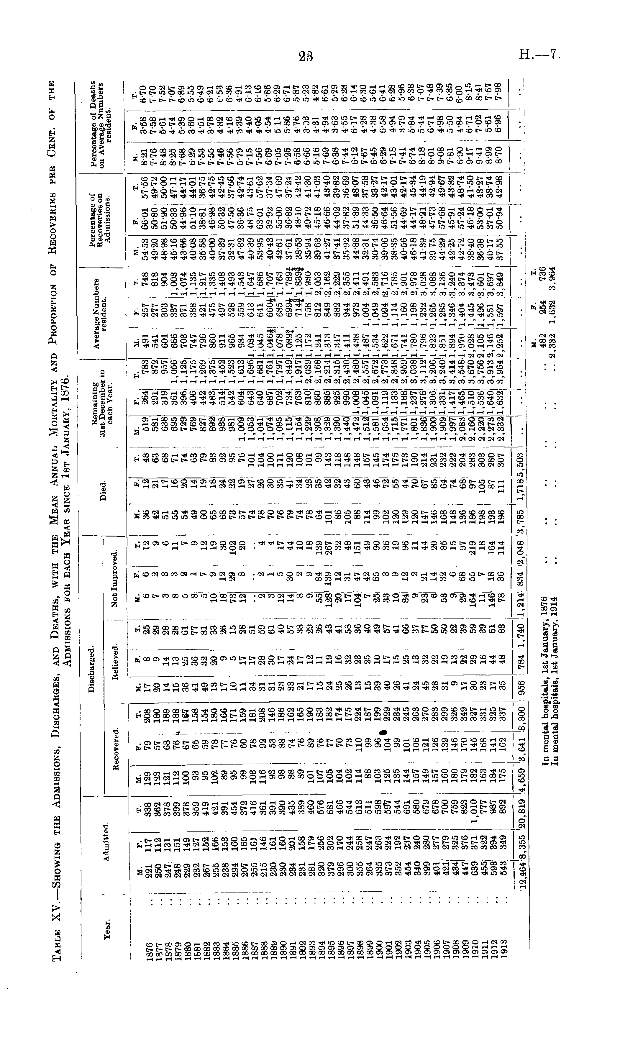 Year. Admitted. Discharged. Not Improved. J Died. Remaining Average Numbers 31st December 111 resident. each Year. Percentage of Recoveries on Admissions. Percentage of on Average Nu resident Deaths lnibers Recovered. Relieved. 1876 1877 1878 1879 1880 1S81 1882 1883 1884 1885 1886 1887 1888 1889 1890 1891 1892 1893 1894 1895 1896 1897 1898 1899 1900 1901 1902 1903 1904 1905 1906 1907 1908 1909 1910 1911 1912 1913 M. F. T. 221 117 338 250 112 362 247 131 378 248 151 399 229 149 378 232 127 359 267 152 419 255 166 421 238 153 391 294 160 ! 454 207 165 372 255 161 : 416 215 146 ! 361 230 161 391 230 160 390 234 201 435 231 158 389 281 179 460 320 256 576 379 302 681 296 170 466 300 244 544 355 258 613 264 247 511 335 263 598 373 224 597 352 192 ! 544 454 237 691 340 240 580 399 280 679 401 277 678 421 279 700 434 325 759 447 376 823 639 371 1,010 455 322 777 593 394 987 543 349 892 M. F. T. 129 79 208 123 57 180 121 68 189 112 76 * 188 100 67 167 93 65 158 95 59 154 102 78 180 S'J 77 166 95 76 171 99 60 159 103 78 181 116 92 208 93 53 H6 98 88 186 88 74 162 89 76 160 101 89 190 107 76 183 105 77 182 104 70 174 102 73 175 114 110 224 88 J 99 187 103 96. 199 125 104 • 229 135 99 234 144 101 245 157 106 263 149 121 270 157 126 283 160 139 299 180 146 326 179 170 349 182 145 327 163 ' 168 331 184 141 325 I 175 162 337 1 M 7 20 14 15 36 41 49 13 17 10 11 34 31 31 23 i 33 21 17 15 24 25 26 13 15 39 ! 40 26 41 24 45 28 31 9 17 30 23 17 35 F. T. M. F. 8 25 6 6 9 29 7 2 14 28 3 3 13 28 ' 8 3 25 61 5 2 36 77 8 1 32 81 5 7 20 33 10 9 9 26 18: 12 5 15 73 29 17 28 12 8 17 51 .. .. 28 59 2 2 30 61 3 1 17 40 12 5 24 i 57 14 30 17 38 8 2 12 29 • 9 9 11 26 55 84 19 43 128 139 16 41 20 12 32 53 17 31 23 36 104 47 25 40 7 42 10 49 25 65 17 57 33 3 15 41 10 9 25 66 84 12 13 37 9 2 32 77 23 21 22 50 i 6 14 19 50 53 32 13 22 9 6 2-2 39 29 68 29 59 164 55 16 39 11 7 44 61 146 18 48 83 78 36 T. 12 9 6 11 7 9 12 19 30 102 20 4 4 17 44 10 18 139 267 32 48 151 49 90 36 19 96 11 44 20 85 15 97 219 18 164 114 M. 36 42 51 55 54 49 60 65 68 73 57 74 78 70 76 79 74 78 64 101 86 105 88 114 99 102 120 129 120 147 146 168 148 136 186 198 193 196 F. T. M. 12 48 519 21 63 581 17 68 638 16 71 695 20 74 729 14 63 709 19 79 827 18 83 892 24 92 938 22 95 981 19 76 1,009 27 101 1,053 26 104 1,041 30 100 1,074 35 111 1,095 41 120 1,115 34 108 1,154 23 101 1,229 35 99 1,308 42 143 1,329 32 118 1,390 43 148 1,440 60 148 1,472 43 157 1,512 46 145 1,581 72l 174 1,654 55 175 1,715 44 173 1,771 70 190 1,801 67 214 1,836 85 231 1,900 64 232 1,909 74 222 1,997 68 204 2,083 97 283 2,160 105 303 2,220 87 280 2,273 111 307 2,332 1,718 5,503 F. 264 291 319 361 396 406J 442 483 514 542 604 643 640 687 702 734 763 810 860 885 925 990 1,008 1,045 1,091 1,119 1,133' 1,188 1,237 1,276 1,306 1,331 1,417 1,465 1,510 1,536 1,640 1,632 T. 783 872 957 1,056 1,125 1,175 1,269 1,375 1,452 1,523 1,613 1,696 1,681 1,761 1,797 1,849 1,917 2,03'J 2,168 2,214 2,315 2,430 2,480 2,557 2,672 2,773 2,848 2,959 3,038 3,112 3,206 3,240 3,414 3,548 3,670 3,756 3,913 3,964 M. 491 541 601 666 703 747 796 860 911 965 984 1,034 1,045 l,046£ 1,078 1,089} 1,125 1,172 1,241 1,313 1,347 1,411 1,438 1,487 1,534 1,622 1,071 1,741 1,780 1,796 1,823 1,851 1,894 1,970 2,028 2,105 2,146 12,252 F. T. II. 257 748 54-53 277 818 49-20 303 904 4898 337 1,003 4516 371 1,074 43-66 388 1,135 4008 421 1,217 35-58 475 1,335 40-00 497 1,408 37-39 528 1,493 32-31 559 1,543 4782 613 1,647 40-39 641 1,686 53-95 000J1,707 40-43 685 1,763 42-61 699Jl,789i 37-61 714}i,839} 38-53 758 1,930 35-y4 812 2,053 39 63 849 2,162 41-27 882 ,2,229 37-41 944 2,355 3592 973 2,411 44-88 1,004 2,491 32-31 1,049 2,583 30-74 1,094 2,716 3906 1,114 2,785 38-35 1,160 2,901 40-56 1,198 2,978 46-18 1,232 3,028 41-39 1,265 3,088 39 75 1,285 3,136 44-29 1,346 3,240 42-25 1,404 3,374 42-72 1 1,445 3,473 38-40, 1,496 3,601 36-38 1 1,551 3,697 4017 1,597 3,849 37 55 F. T. 6601 57-56 50-80 49-72 51-90 5000 50-33 4711 44-96 44-17 5110! 4401 38-81 : 36-70 46-98 42-75 50-32 42-45 47-50 3766 36-36 42-74 4870 43-61 63-01 57-62 82-92 37-34 5500 47-69 36-82 37-24 48-10 42-42 49-72 41-30 4518 41-03 46-66 43-40 44-02 39-82 37-82 36-69 5189 48-07 44-33! 37-58 36-50 33-27 46-64 4217 51-56 4301 44-69 4217 44-17 45-34 4S-21 44-19 47-73 42-94 57-68 49-67 45-91 43-82 57-24 48-74 4618 41-50 53-00 43-27 3701 38-74 50-94 42-98 M. 8-21 7-76 8-48 8-25 7-68 B-29 7-53 7-55 7-46 7-56 5-79 715 7-56 669 7-05 7-25 6-58 6-66 516 7-69 638 7-44 6-12 7-67 6-45 6-29 718 7-41 6-74 8-18 8-01 9-08 7-81 6-90 9-17 9-41 8-99 8-70 F. 3-58 7-58 5-61 4-74 5-39 3-60 4-51 3-78 4-82 416 3-39 4-40 405 4-54 511 5-86 4-76 303 4-31 4-94 3-63 455 6-17 4-28 4-38 6-58 4-94 3-79 5-84 5-44 6-71 4-98 550 4-84 6-71 7-02 5-61 6-96 T. 6-70 7-70 7-52 707 6-89 5-55 6-49 6-21 t-53 6-36 4-91 613 6-16 5-86 6-29 6-71 5-87 5-23 4-82 661 5-29 628 614 6-30 5-61 6-41 6-28 5-96 6-38 7 07 7-48 7-39 6-85 6-00 8-15 8-41 757 7-98 12,4648,355 20,819 4,659 3,641 '8,300 : 956 ' ' 784 1,740 1,214' 834 2,048 3,785 I I .. I I .. I .. I In mental hospitals, 1st January, 1876 In mental hospitals, 1st January, 1914 M. F. T. 482 254 736 .. 2,332 1,632 3,964