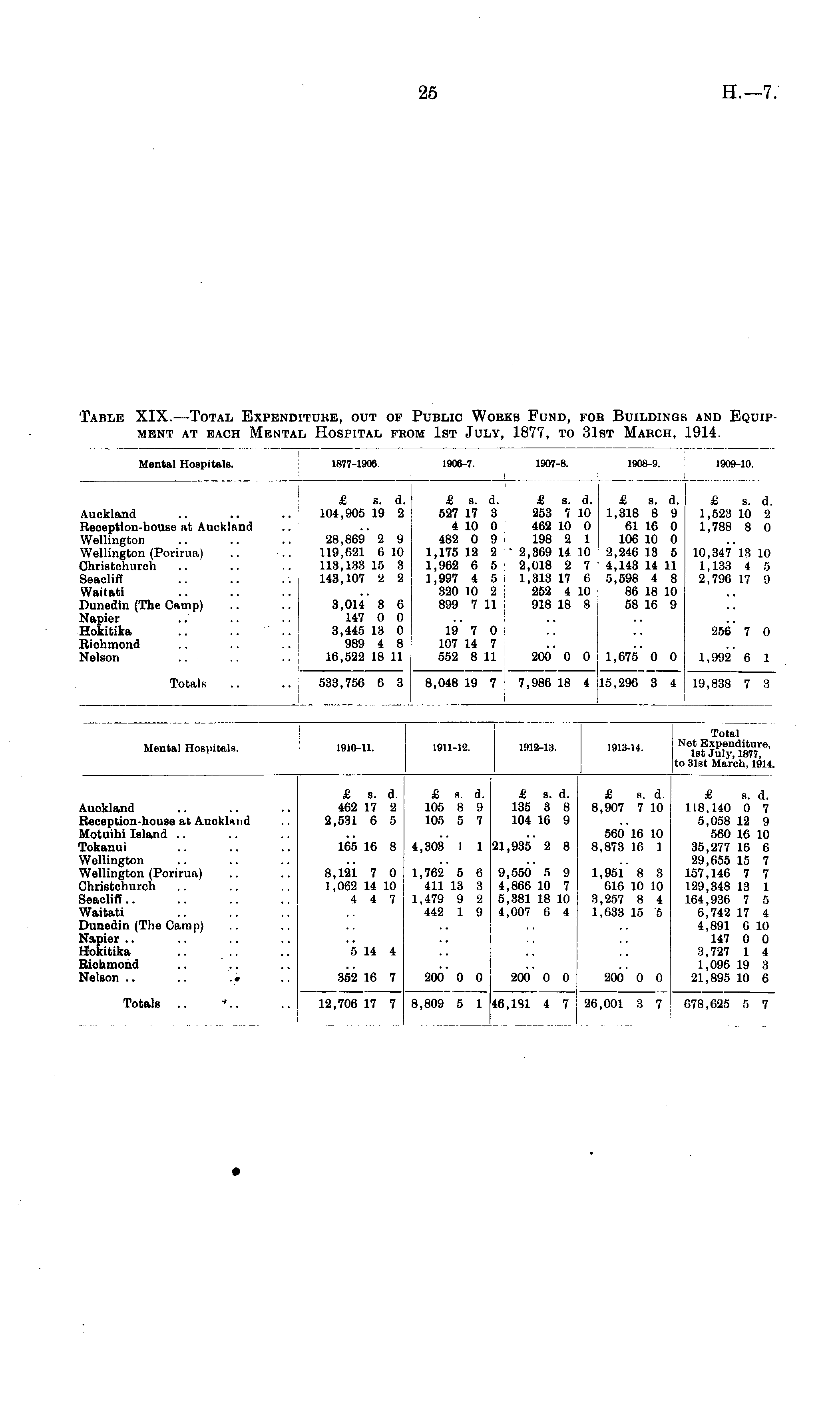 Table XIX. —Total Expenditure, out of Public Works Fund, for Buildings and Equipment at each Mental Hospital from 1st July, 1877, to 31st March, 1914.