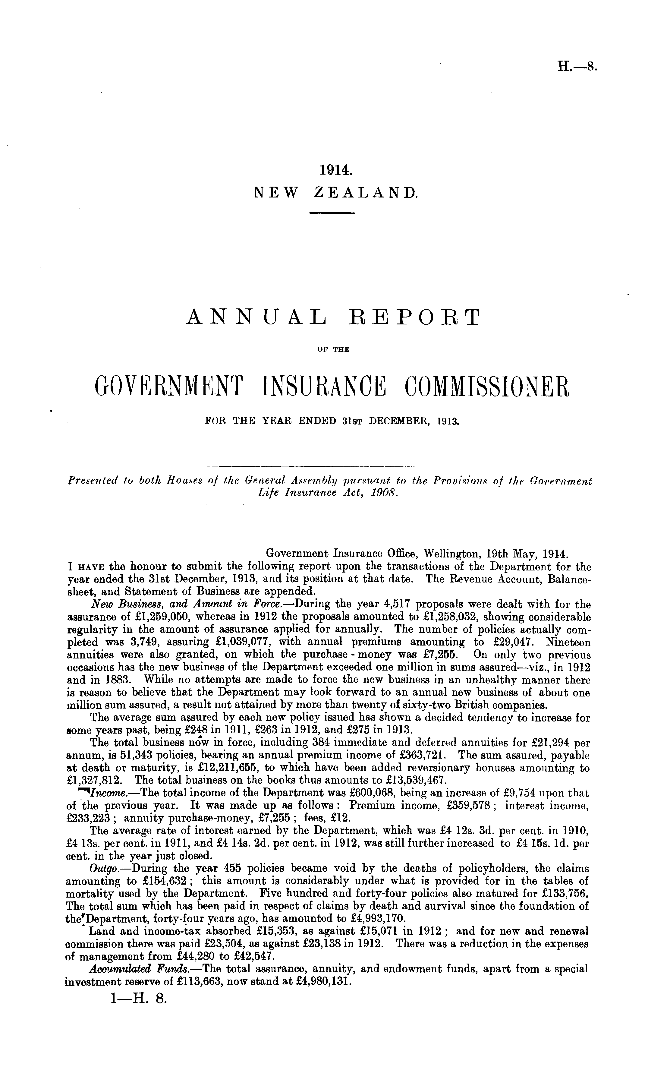 Government Insurance Office, Wellington, 19th May, 1914. I have the honour to submit the following report upon the transactions of the Department for the year ended the 31st December, 1913, and its position at that date. The Kevenue Account, Balancesheet, and Statement of Business are appended. New Business, and Amount in Force. —'During the year 4,517 proposals were dealt with for the assurance of £1,259,050, whereas in 1912 the proposals amounted to £1,258,032, showing considerable regularity in the amount of assurance applied for annually. The number of policies actually completed was 3,749, assuring £1,039,077, with annual premiums amounting to £29,047. Nineteen annuities were also granted, on which the purchase - money was £7,255. On only two previous occasions has the new business of the Department exceeded one million in sums assured—viz., in 1912 and in 1883. While no attempts are made to force the new business in an unhealthy manner there is reason to believe that the Department may look forward to an annual new business of about one million sum assured, a result not attained by more than twenty of sixty-two British companies. The average sum assured by each new policy issued has shown a decided tendency to increase for some years past, being £248 in 1911, £263 in 1912, and £275 in 1913. The total business now in force, including 384 immediate and deferred annuities for £21,294 per annum, is 51,343 policies, bearing an annual premium income of £363,721. The sum assured, payable at death or maturity, is £12,211,655, to which have been added reversionary bonuses amounting to £1,327,812. The total business on the books thus amounts to £13,539,467. "^lncome.- —-The total income of the Department was £600,068, being an increase of £9,754 upon that of the previous year. It was made up as follows : Premium income, £359,578 ; interest income, £233,223 ; annuity purchase-money, £7,255 ; fees, £12. The average rate of interest earned by the Department, which was £4 12s. 3d. per cent, in 1910, £4 13s. per cent, in 1911, and £4 14s. 2d. per cent, in 1912, was still further increased to £4 15s. Id. per cent, in the year just closed. Outgo. —During the year 455 policies became void by the deaths of policyholders, the claims amounting to £154,632 ; this amount is considerably under what is provided for in the tables of mortality used by the Department. Five hundred and forty-four policies also matured for £133,756. The total sum which has been paid in respect of claims by death and survival since the foundation of the r Department, forty-four years ago, has amounted to £4,993,170. Land and income-tax absorbed £15,353, as against £15,071 in 1912 ; and for new and renewal commission there was paid £23,504, as against £23,138 in 1912. There was a reduction in the expenses of management from £44,280 to £42,547. Accumulated Funds. —-The total assurance, annuity, and endowment funds, apart from a special investment reserve of £113,663, now stand at £4,980,131.