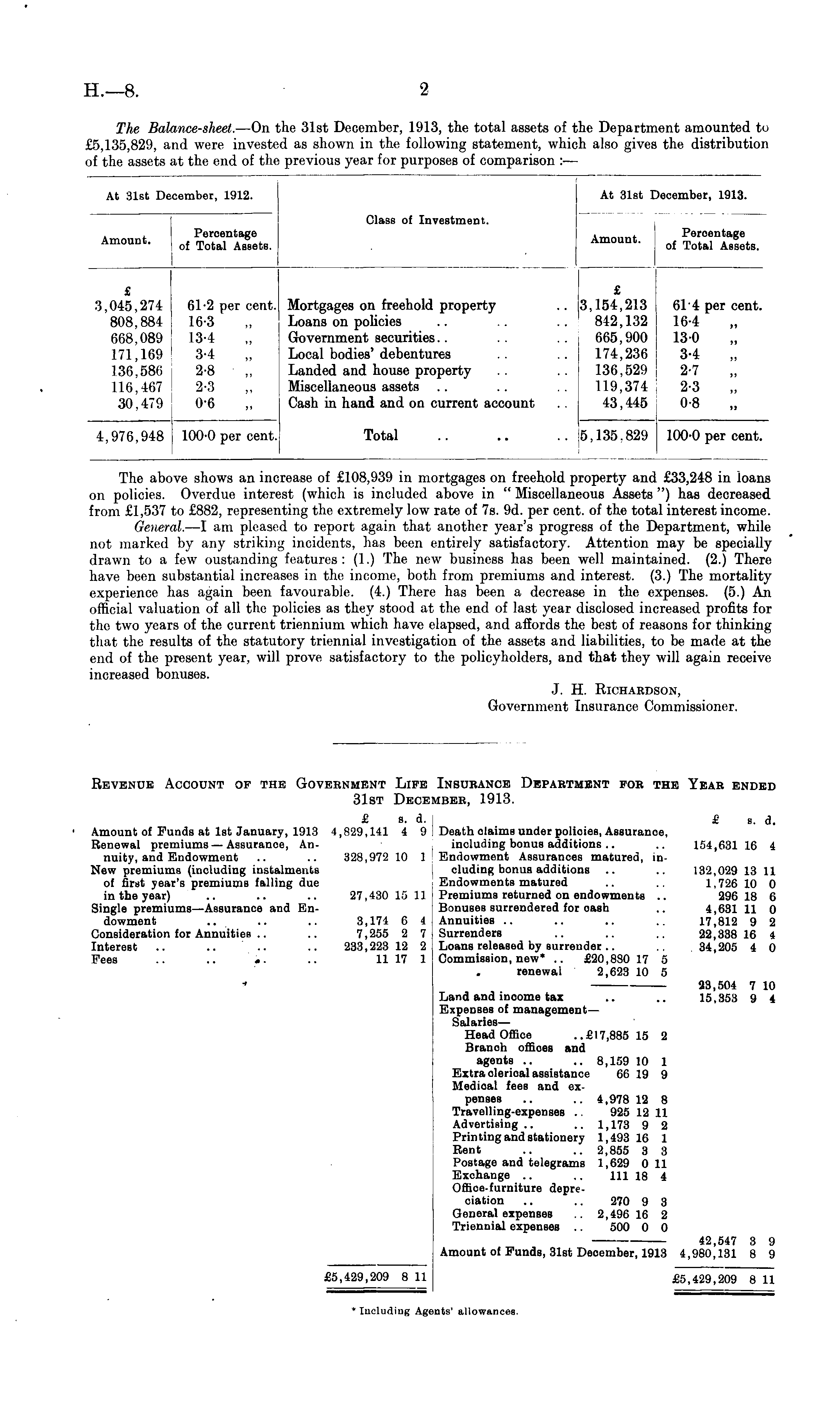The Balance-sheet. —On the 31st December, 1913, the total assets of the Department amounted to £5,135,829, and were invested as shown in the following statement, which also gives the distribution of the assets at the end of the previous year for purposes of comparison : —