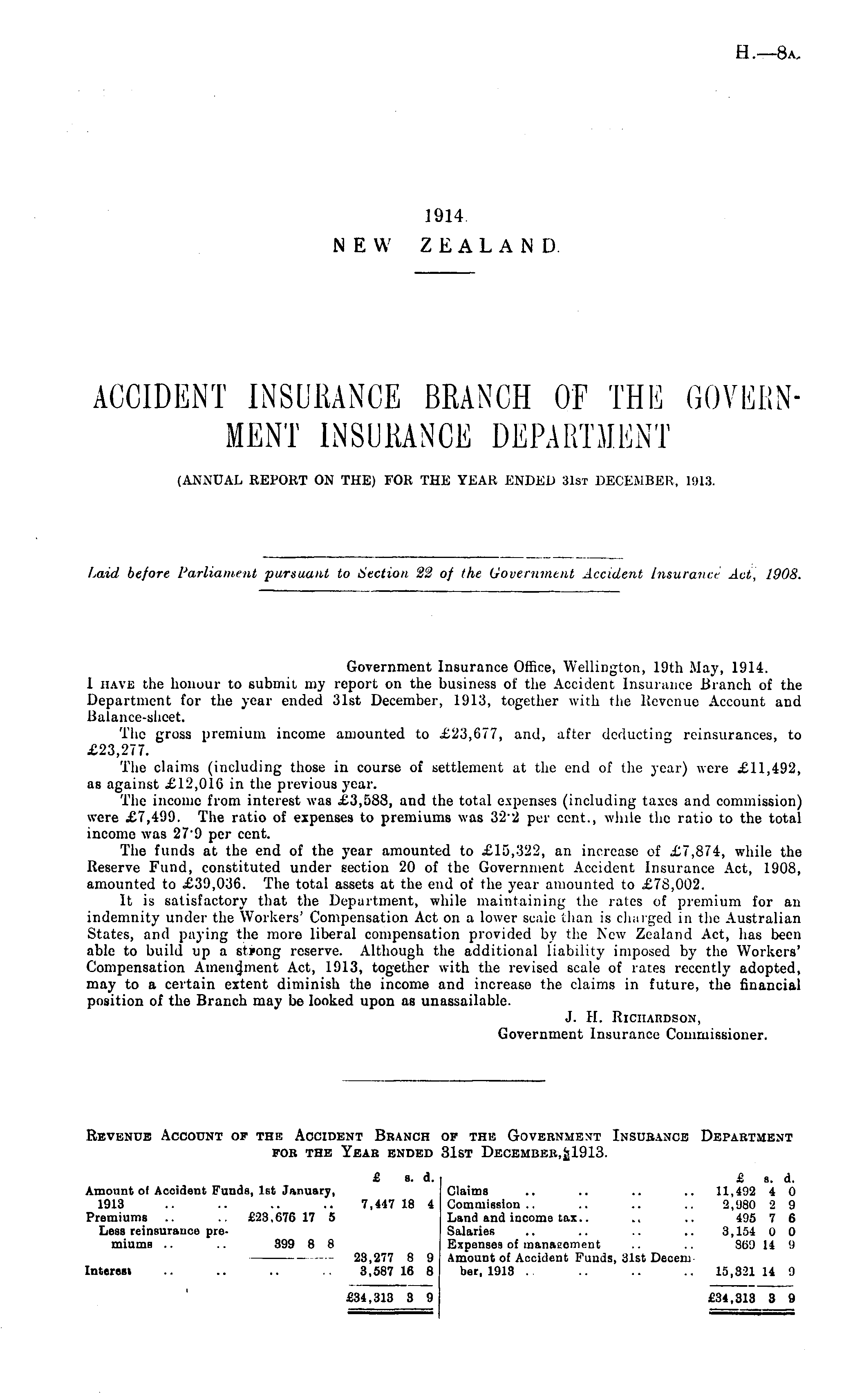 Government Insurance Office, Wellington, 19th May, 1914. 1 have the honour to submit my report on the business of the Accident Insurance Branch of the Department for the year ended 31st December, 1913, together with the Revenue Account and Balance-sheet. The gross premium income amounted to £23,677, and, after deducting reinsurances, to £23,277. The claims (including those in course of settlement at the end of the year) were £11,492, as against £12,016 in the previous year. The income from interest was £3,588, and the total expenses (including taxes and commission) were £7,499. The ratio of expenses to premiums was 32 - 2 per cent., while the ratio to the total income was 27"9 per cent. The funds at the end of the year amounted to £15,322, an increase of £7,874, while the Reserve Fund, constituted under Eection 20 of the Government Accident Insurance Act, 1908, amounted to £39,036. The total assets at the end of the year amounted to £78,002. It is satisfactory that the Department, while maintaining the rates of premium for an indemnity under the Workers' Compensation Act on a lower scale than is charged in the Australian States, and paying the more liberal compensation provided by the New Zealand Act, has been able to build up a strong reserve. Although the additional liability imposed by the Workers' Compensation Amendment Act, 1913, together with the revised scale of rates recently adopted, may to a certain extent diminish the income and increase the claims in future, the financial position of the Branch may be looked upon as unassailable. J. H. Richardson, Government Insurance Commissioner.