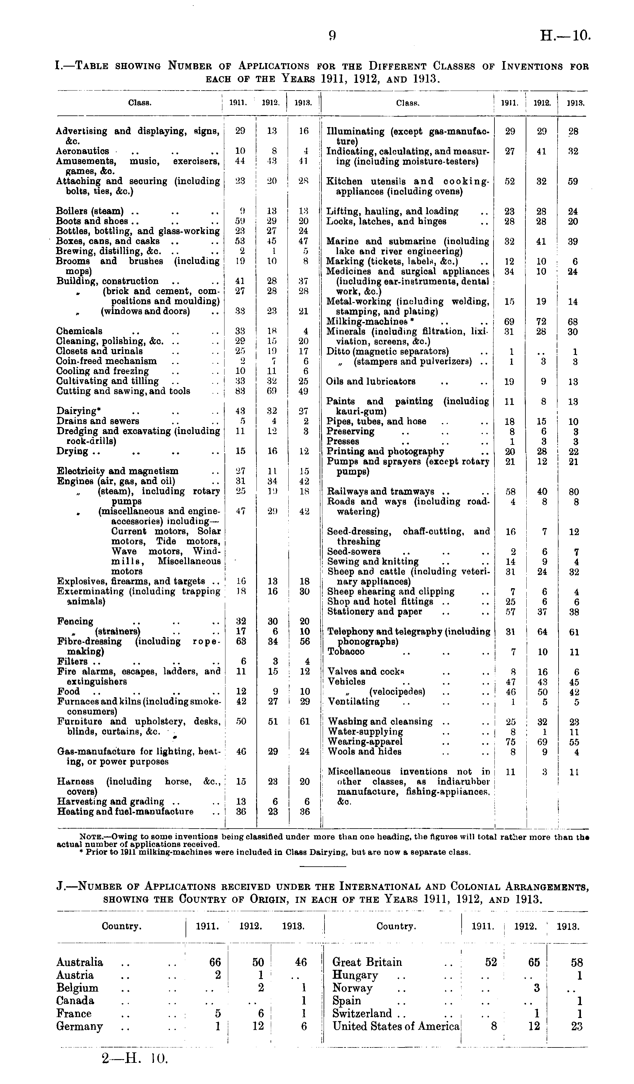 I. —Table showing Number of Applications for the Different Classes of Inventions for each of the Years 1911, 1912, and 1913.