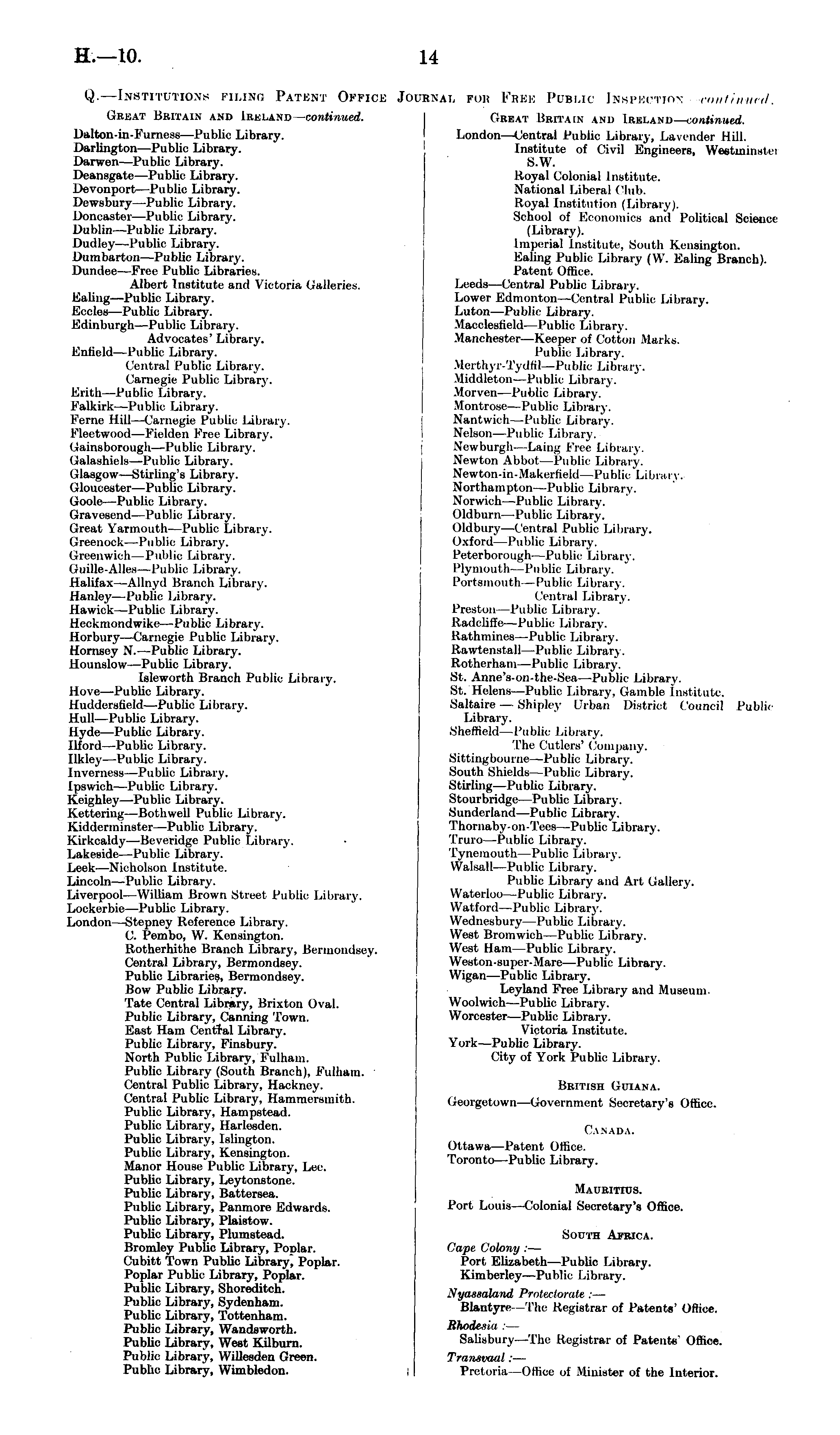 Q. —Institutions filing Patent Office Journal pop Free Public [nspbotios continued. Great Britain and Ireland -continued. Ghbat Brh-ain and Ireland— continued. Dalton-in-Furness—Public Library. London—Central Public Library, Lavender Hill. Darlington—Public Library. Institute of Civil Engineers, Weetininstei Darwen—Public Library. S.W. Deansgate—Public Library. Royal Colonial Institute. Devonport—Public Library. National Liberal dub. Dewsbury—Public Library. Royal Institution (Library). Doncaster —Public Library. School of Eo mioe and Political Science Dublin—Public Library. (Library). Dudley—Public Library. Imperial Institute, South Kensington. Dumbarton—Public Library. Baling Public Library (W. Ealing Branch). Dundee—Free Public Libraries. Patent Offioe. Albert Institute and Victoria Galleries. Leeds —Central Public Library. Baling —Public Library. Lower Edmonton—Centra] Public Library. Eccles—Public Library. Luton—Public Library. Edinburgh—Public Library. Macclesh'eld —Public Library. Advocates' Library. Manchester—Keeper of Cotton Marks. Enfield—Public Library. Public Library. Central Public Library. Merthyr-Tvdfil—Public Library. Carnegie Public Library. .Vliddleton—Public Library . Erith—Public Library. Morvcn — Public Library. Falkirk —Public Library. Montros* —Public Library. Feme Hill— Carnegie Public Library. Nantwich —Public Library. Kleetwood— Fielden Free Library. Nelson—Public Library. Gainsborough—Public Library. Xewburgh—Laing Free Library. Galashicls —Public Library. Newton Abbot —Public Library, Glasgow—Stirling's Library. Newton-in-Makerfield —Public Library. Gloucester—Public Library. Northampton—Public Library. Goole—Public Library. Norwich—Public Library. Gravesend—Public Library. Oldburn—Public Library. Great Yarmouth —Public Library. Oldbury—Central Public Library. Qreenook —Public Library. Oxford — Public Library. Greenwich—Public Library. Peterborough—Public Library. Guille-Alles —Public Library. Plymouth —Public Library. Halifax—Allnyd Branch Library. Portsmouth—Public Library. Hanley—Public Library. Central Library. Hawick —Public Library. Preston—Public Library. Heckmondwiki —Public Library. Radcliffe—Public Library. Horbury— Carnegie Public Library. Rathmines—Public Library. Hornsey N. —Public Library. Rawtenstall —Public Library. Hounslow —Public Library. Rotherham—Public Library. Isleworth Branch Public Library. St. Anne's-on-the-Sea—Public Library. Hove—Public Library. St. Helens —Public Library. Gamble Institute. Huddersfield—Public Library. Saltaire — Shipley Urban District Council PublicHull—Public Library. Library. Hyde—Public Library. Sheffield—Public Library. llford —Public Library. The Cutlers' Company. Ilkley—Public Library. Sittingbourne—Public Library. Inverness—Public Library. South Shields—Public Library. Ipswich—Public Library. Stirling —Public Library. Keighley—Public Library. Stourbridge—Public Library. Kettering—Bothwell Public Library. Sunderland—Public Library. Kidderminster —Public Library. Thornaby-on-Tees—Public Library. Kirkcaldy—Beveridge Public Library. ■ Truro -Public Library. Lakeside —Public Library. Tynemouth—Public Library. Leek —Nicholson Institute. Walsall—Public Library. Lincoln —Public Library. Public Library and Art Gallery. Liverpool—William Brown Street Public Library. Waterloo—Public Library. Lockerbie —Public Library. Watford—Public Library. London—Stepney Reference Library. Wednesbury—Public Library. C. Pembo, W. Kensington. West Bromwich —Public Library. Rotherhithe Branch Library-, Bermonclsey. West Ham —Public Library. Central Library, Bermondsey. Weston-super-Mare—Public Library. Public Libraries, Bermondsey. Wigan—Public Library. Bow Public Library. Leyland Free Library and .Museum Tate Central Library, Brixton Oval. Woolwich—Public Library. Public Library, Canning Town. Worcester—Public Library. East Ham Central Library. Victoria Institute. Public Library, Finsbury. York—Public Library. North Public- Library, Fulhani. City of York Public Library. Public Library (South Branch), Kulham. Central Public Library, Hackney. British Guiana. Central Public Library, Hammersmith. Georgetown—Government Secretary's Office. Public Library, Hampstead. Public Library, Harlesden. r • N V|M Public Library, Islington. ~,, ~ . . ~~, Public Library, Kensington. Ottawa-Patent Office. Manor House Public Library, Lee. Toronto-Public Library. Public Library, Leytonstone. Public Library, Battersea. Mauritius. Public Library, Panmore Edwards. ort Louie —Colonial Secretary's Office. Public Library, Plaistow. Public Library, Plumstead. South Africa. Bromley Public Library, Poplar. Cape Colony : — Cubitt Town Public Library, Poplar. Port Elizabeth—Public Library. Poplar Public Library, Poplar. Kimberley—Public- Library. Public Library, Shoreditch. Nyassaland Protectorate :- Pub he Library, Sydenham. Blantyre -The Registrar of Patents' Office. Public Library, Tottenham. . Public Library, Wandsworth. Rhodesia : — Public Library, West Kilburn. Salisbury—The Registrar of Patents' Office. Public Library, Willesden Green. Transvaal: — Public Library, Wimbledon. I Pretoria—<(Dice ol Minister of the Interior.