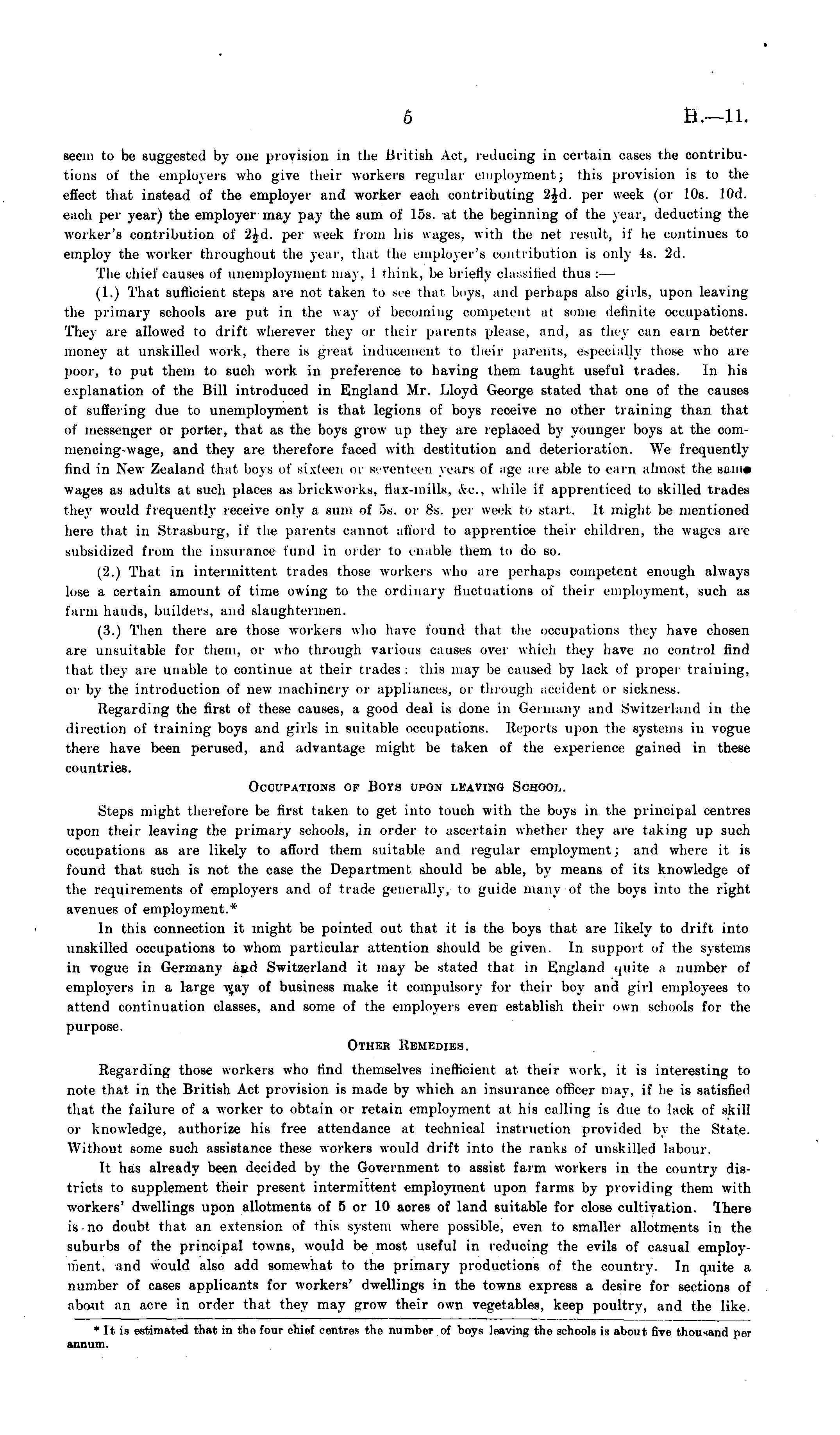 seem to be suggested by one provision in the British Act, reducing in certain cases the contributions of the employers who give their workers regular employment; this provision is to the effect that instead of the employer and worker each contributing 2Jd. per week (or 10s. lOd. each per year) the employer may pay the sum of 15s. at the beginning of the year, deducting the worker's contribution of per week from his wages, with the net result, if he continues to employ the worker throughout the year, that the employer's contribution is only 4s. 2d. The chief causes of unemployment may, I think, be brieflj clai itied thus:— (1.) That sufficient steps are not taken to see that hoys, and perhaps also girls, upon leaving the primary schools are put in the way of becoming competent at some definite occupations. They are allowed to drift wherever they or their parents please, and, as they can earn better money at unskilled work, there is great inducement to their parents, especially those who are poor, to put them to such work in preference to having them taught useful trades. In his explanation of the Bill introduced in England Mr. Lloyd George stated that one of the causes of suffering due to unemployment is that legions of boys receive no other training than that of messenger or porter, that as the boys grow up they are replaced by younger boys at the com-mencing-wage, and they are therefore faced with destitution and deterioration. We frequently find in New Zealand that boys of sixteen or seventeen years of age arc able to earn almost the same wages as adults at such places as brickworks, flax-mills, &c., while if apprenticed to skilled trades they would frequently receive only a sum of ."is. or Bs. per week to start. It might be mentioned here that in Strasburg, if the parents cannot afford to apprentice their children, the wages are subsidized from the insurance fund in order to enable them to do so. (2.) That in intermittent trades those workers who are perhaps competent enough always lose a certain amount of time owing to the ordinary fluctuations of their employment, such as farm hands, builders, and slaughtermen. (3.) Then there are those workers who have found that the occupations they have chosen are unsuitable for them, or who through various causes over which they have no control find that they are unable to continue at their trades: this may he caused by lack of proper training, or by the introduction of new machinery or appliances, or through accident or sickness. Regarding the first of these causes, a good deal is done in Germany ami Switzerland in the direction of training boys and girls in suitable occupations. Reports upon the systems in vogue there have been perused, and advantage might be taken of the experience gained in these countries. Occupations of Boys upon leaving School. Steps might therefore be first taken to get into touch with the boys in the principal centres upon their leaving the primary schools, in order to ascertain whether they are taking up such occupations as are likely to afford them suitable and regular employment; and where it is found that such is not the case the Department should be able, by means of its knowledge of the requirements of employers and of trade generally, to guide many of the boys into the right avenues of employment.* In this connection it might be pointed out that it is the boys that are likely to drift into unskilled occupations to whom particular attention should be given. In support of the systems in vogue in Germany and Switzerland it may be stated that in England quite a number of employers in a large yjay of business make it compulsory for their boy and girl employees to attend continuation classes, and some of the employers even establish their own schools for the purpose. Other Remedies. Regarding those workers who find themselves inefficient at their work, it is interesting to note that in the British Act provision is made by which an insurance officer may, if he is satisfied that the failure of a worker to obtain or retain employment at his calling is due to lack of skill or knowledge, authorize his free attendance at technical instruction provided by the State. Without some such assistance these workers would drift into the ranks of unskilled labour. It has already been decided by the Government to assist farm workers in the country districts to supplement their present intermittent employment upon farms by providing them with workers' dwellings upon allotments of sor 10 acres of land suitable for close cultivation. There is no doubt that an extension of this system where possible, even to smaller allotments in the suburbs of the principal towns, would be most useful in reducing the evils of casual employment, and would also add somewhat to the primary productions of the country. In q.uite a number of cases applicants for workers' dwellings in the towns express a desire for sections of about an acre in order that they may grow their own vegetables, keep poultry, and the like.