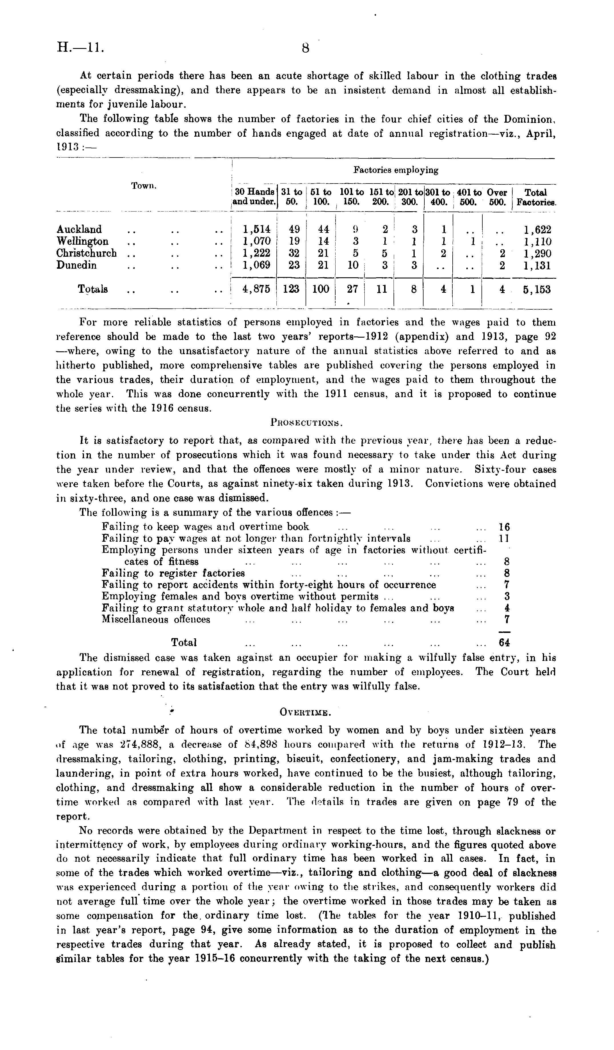 For more reliable statistics of persons employed in factories and the wages paid to them reference should be made to the last two years' reports —1912 (appendix) and 1913, page 92 —where, owing to the unsatisfactory nature of the annual statistics above referred to and as hitherto published, more comprehensive tables are published covering the persons employed in the various trades, their duration of employment, and the wages paid to them throughout the whole year. This was done concurrently with the 1911 census, and it is proposed to continue the series with the 1916 census. Prosecutions. It is satisfactory to report that, as compared with the previous year, there has been a reduction in the number of prosecutions which it was found necessary to take under this Act during the year under review, and that the offences were mostly of a minor nature. Sixty-four cases were taken before the Courts, as against ninety-six taken during 1913. Convictions were obtained in sixty-three, and one case was dismissed. The following is a summary of the various offences : — Failing to keep wages and overtime book ... ... ... ... 16 Failing to pay wages at not longer than fortnightly intervals ... ... 11 Employing persons under sixteen years of age in factories without certificates of fitness ... ... ... ... ... ... 8 Failing to register factories ... ... ... ... ... 8 Failing to report accidents within forty-eight hours of occurrence ... 7 Emphrying females and boys overtime without permits . . ... ... 3 Failing to grant statutory whole and half holiday to females and boys ... 4 Miscellaneous offences ... ... ... ... ... ... 7 Total ... ... ... ... ... ... 64 The dismissed case was taken against an occupier for making a wilfully false entry, in his application for renewal of registration, regarding the number of employees. The Court held that it was not proved to its satisfaction that the entry was wilfully false. Overtime. The total number of hours of overtime worked by women and by boys under sixteen years of asje was 274,888, a decrease of 84,898 hours compared with the returns of 1912-13. The dressmaking, tailoring, clothing, printing, biscuit, confectionery, and jam-making trades and laundering, in point of extra hours worked, have continued to be the busiest, although tailoring, clothing, and dressmaking all show a considerable reduction in the number of hours of overtime worked as compared with last year. The details in trades are given on page 79 of the report. No records were obtained by the Department in respect to the time lost, through slackness or intermittency of work, by employees during ordinary working-hours, and the figures quoted above do not necessarily indicate that full ordinary time has been worked in all cases. In fact, in some of the trades which worked overtime —viz., tailoring and clothing—a good deal of slackness was experienced during a portion of the year owing to the strikes, and consequently workers did not average full time over the whole year; the overtime worked in those trades may be taken as some compensation for the ordinary time lost. (The tables for the year 1910-11, published in last year's report, page 94, give some information as to the duration of employment in the respective trades during that year. As already stated, it is proposed to collect and publish similar tables for the year 1915-16 concurrently with the taking of the next census.)