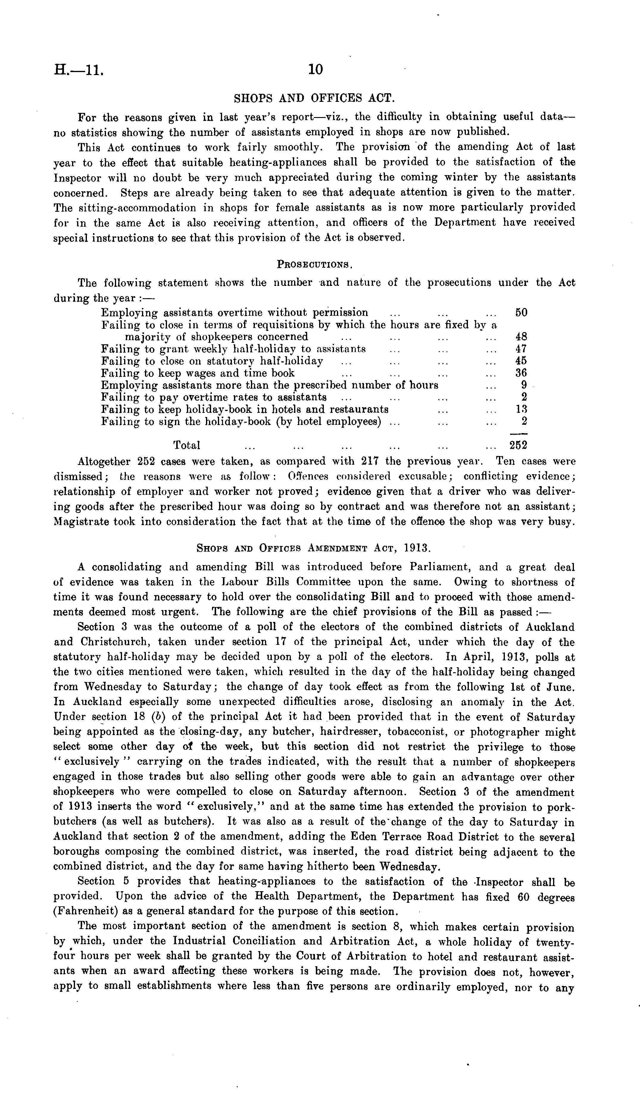 SHOPS AND OFFICES ACT. For the reasons given in last year's report—viz., the difficulty in obtaining useful data — no statistics showing the number of assistants employed in shops are now published. This Act continues to work fairly smoothly. The provision of the amending Act of last year to the effect that suitable heating-appliances shall be provided to the satisfaction of the Inspector will no doubt be very much appreciated during the coming winter by the assistants concerned. Steps are already being taken to see that adequate attention is given to the matter. The sitting-accommodation in shops for female assistants as is now more particularly provided for in the same Act is also receiving attention, and officers of the Department have received special instructions to see that this provision of the Act is observed. Prosecutions. The following statement shows the number and nature of the prosecutions under the Act during the year : — Employing assistants overtime without permission ... ... ... 50 Failing to close in terms of requisitions by which the hours are fixed by a majority of shopkeepers concerned ... ... ... ... 48 Failing to grant weekly half-holiday to assistants ... ... ... 47 Failing to close on statutory half-holiday ... ... ... ... 45 Failing to keep wages and time book ... ... ... ... 36 Employing assistants more than the prescribed number of hours ... 9 Failing to pay overtime rates to assistants ... ... ... ... 2 Failing to keep holiday-book in hotels and restaurants ... ... 13 Failing to sign the holiday-book (by hotel employees) ... ... ... 2 Total ... ... ... ... ... ... 252 Altogether 252 cases were taken, as compared with 217 the previous year. Ten cases were dismissed; the reasons were as follow: Offences considered excusable; conflicting evidence; relationship of employer and worker not proved; evidence given that a driver who was delivering goods after the prescribed hour was doing so by contract and was therefore not an assistant; Magistrate took into consideration the fact that at the time of the offence the shop was very busy. Shops and Offices Amendment Act, 1913. A consolidating and amending Bill was introduced before Parliament, and a great deal of evidence was taken in the Labour Bills Committee upon the same. Owing to shortness of time it was found necessary to hold over the consolidating Bill and to proceed with those amendments deemed most urgent. The following are the chief provisions of the Bill as passed : — Section 3 was the outcome of a poll of the electors of the combined districts of Auckland and Christchurch, taken under section 17 of the principal Act, under which the day of the statutory half-holiday may be decided upon by a poll of the electors. In April, 1913, polls at the two cities mentioned were taken, which resulted in the day of the half-holiday being changed from Wednesday to Saturday; the change of day took effect as from the following Ist of June. In Auckland especially some unexpected difficulties arose, disclosing an anomaly in the Act. Under section 18 (b) of the principal Act it had been provided that in the event of Saturday being appointed as the closing-day, any butcher, hairdresser, tobacconist, or photographer might select some other day of the week, but this section did not restrict the privilege to those "exclusively" carrying on the trades indicated, with the result that a number of shopkeepers engaged in those trades but also selling other goods were able to gain an advantage over other shopkeepers who were compelled to close on Saturday afternoon. Section 3 of the amendment of 1913 inserts the word "exclusively," and at the same time has extended the provision to porkbutchers (as well as butchers). It was also as a result of the "change of the day to Saturday in Auckland that section 2 of the amendment, adding the Eden Terrace Road District to the several boroughs composing the combined district, was inserted, the road district being adjacent to the combined district, and the day for same having hitherto been Wednesday. Section 5 provides that heating-appliances to the satisfaction of the Inspector shall be provided. Upon the advice of the Health Department, the Department has fixed 60 degrees (Fahrenheit) as a general standard for the purpose of this section. The most important section of the amendment is section 8, which makes certain provision by which, under the Industrial Conciliation and Arbitration Act, a whole holiday of twentyfour hours per week shall be granted by the Court of Arbitration to hotel and restaurant assistants when an award affecting these workers is being made. Ihe provision does not, however, apply to small establishments where less than five persons are ordinarily employed, nor to any