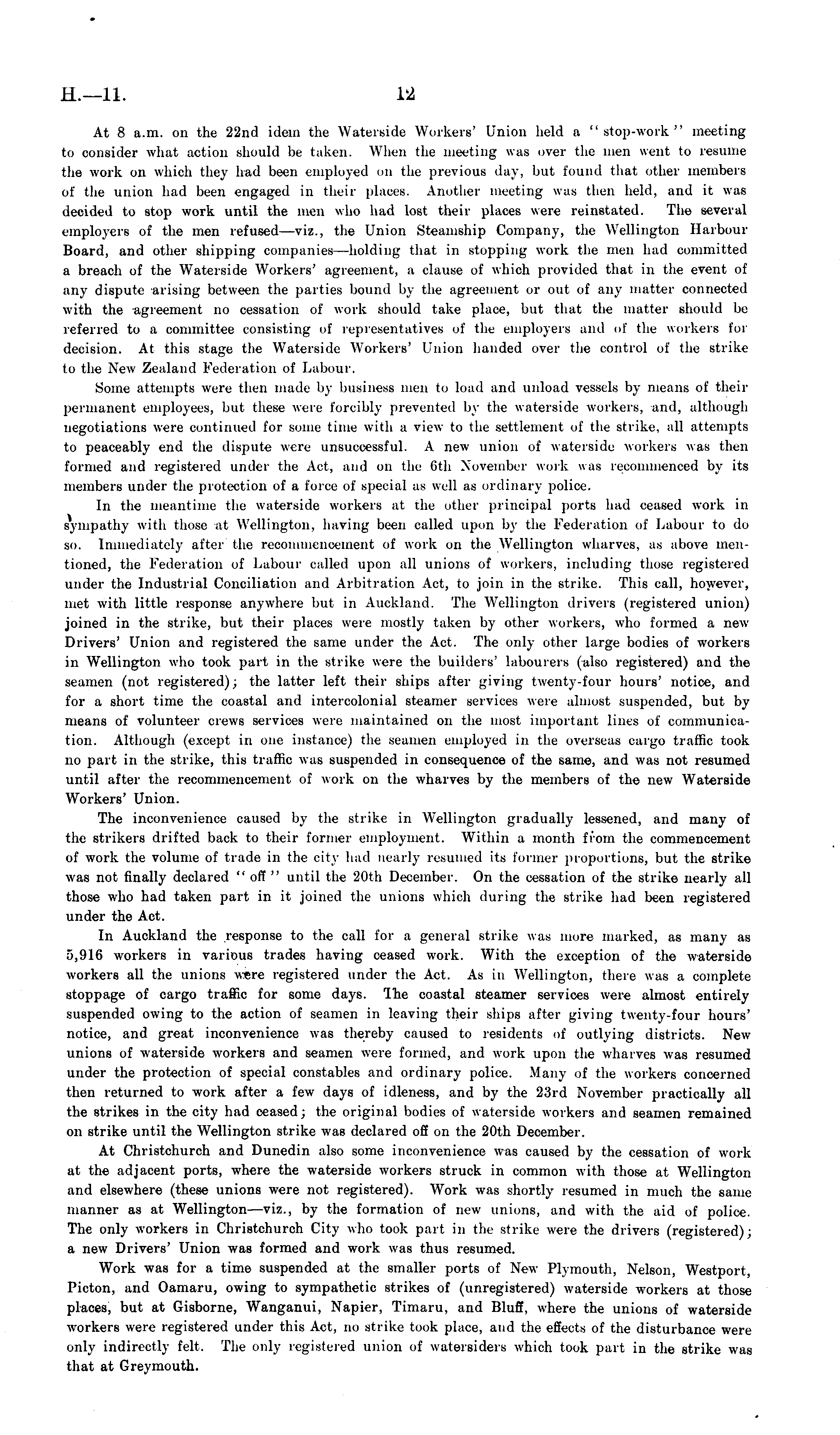 At 8 a.m. on the 22nd idem the Waterside Workers' Union held a "stop-work" meeting to consider what action should be taken. When the meeting was over the men went to resume the work on which they had been employed on the previous day, but found that other members of the union had been engaged in their places. Another meeting was then held, and it was decided to stop work until the men who had lost their places were reinstated. The several employers of the men refused —viz., the Union Steamship Company, the Wellington Harbour Board, and other shipping companies—holding that in stopping work the men had committed a breach of the Waterside Workers' agreement, a clause of which provided that in the event of any dispute arising between the parties bound by the agreement or out of any matter connected with the agreement no cessation of work should take place, but that the matter should be referred to a committee consisting of representatives of the employers and of the workers for decision. At this stage the Waterside Workers 1 Union handed over the control of the strike to the New Zealand Federation of Labour. Some attempts were then made by business men to load and unload vessels by means of their permanent employees, but these were forcibly prevented by the waterside winkers, and, although negotiations were continued for some time with a view to the settlement of the strike, all attempts to peaceably end the dispute were unsuccessful. A new union of waterside workers was then formed and registered under the Act, and on the 6th November work was recommenced by its members under the protection of a force of special as well as ordinary police. In the meantime the waterside workers at the other principal ports had ceased work in sympathy with those at Wellington, having been called upon by the Federation of Labour to do so. Immediately after the recommencement of work on the Wellington wharves, as above mentioned, the Federation of Labour called upon all unions of workers, including those registered under the Industrial Conciliation and Arbitration Act, to join in the strike. This call, however, met with little response anywhere but in Auckland. The Wellington drivers (registered union) joined in the strike, but their places were mostly taken by other workers, who formed a newDrivers' Union and registered the same under the Act. The only other large bodies of workers in Wellington who took part in the strike were the builders' labourers (also registered) and the seamen (not registered); the latter left their ships after giving twenty-four hours' notice, and for a short time the coastal and intercolonial steamer services were almost suspended, but by means of volunteer crews services were maintained on the most important lines of communication. Although (except in one instance) the seamen employed in the overseas cargo traffic took no part in the strike, this traffic was suspended in consequence of the same, and was not resumed until after the recommencement of work on the wharves by the members of the new Waterside Workers' Union. The inconvenience caused by the strike in Wellington gradually lessened, and many of the strikers drifted back to their former employment. Within a month from the commencement of work the volume of trade in the city had nearly resumed its former proportions, but the strike was not finally declared " off " until the 20th December. On the cessation of the strike nearly all those who had taken part in it joined the unions which during the strike had been registered under the Act. In Auckland the response to the call for a general strike was more marked, as many as 5,916 workers in various trades having ceased work. With the exception of the waterside workers all the unions w«re registered under the Act. As in Wellington, there was a complete stoppage of cargo traffic for some days. Ihe coastal steamer services were almost entirely suspended owing to the action of seamen in leaving their ships after giving twenty-four hours' notice, and great inconvenience was thereby caused to residents of outlying districts. New unions of waterside workers and seamen were formed, and work upon the wharves was resumed under the protection of special constables and ordinary police. Many of the workers concerned then returned to work after a few days of idleness, and by the 23rd November practically all the strikes in the city had ceased; the original bodies of waterside workers and seamen remained on strike until the Wellington strike was declared off on the 20th December. At Christchurch and Dunedin also some inconvenience was caused by the cessation of work at the adjacent ports, where the waterside workers struck in common with those at Wellington and elsewhere (these unions were not registered). Work was shortly resumed in much the same manner as at Wellington —viz., by the formation of new unions, and with the aid of police. The only workers in Christchurch City who took part in the strike were the drivers (registered); a new Drivers' Union was formed and work was thus resumed. Work was for a time suspended at the smaller ports of New- Plymouth, Nelson, Westport, Picton, and Oamaru, owing to sympathetic strikes of (unregistered) waterside workers at those places, but at Gisborne, Wanganui, Napier, Timaru, and Bluff, where the unions of waterside workers were registered under this Act, no strike took place, and the effects of the disturbance were only indirectly felt. The only registered union of watersiders which took part in the strike was that at Greymouth.