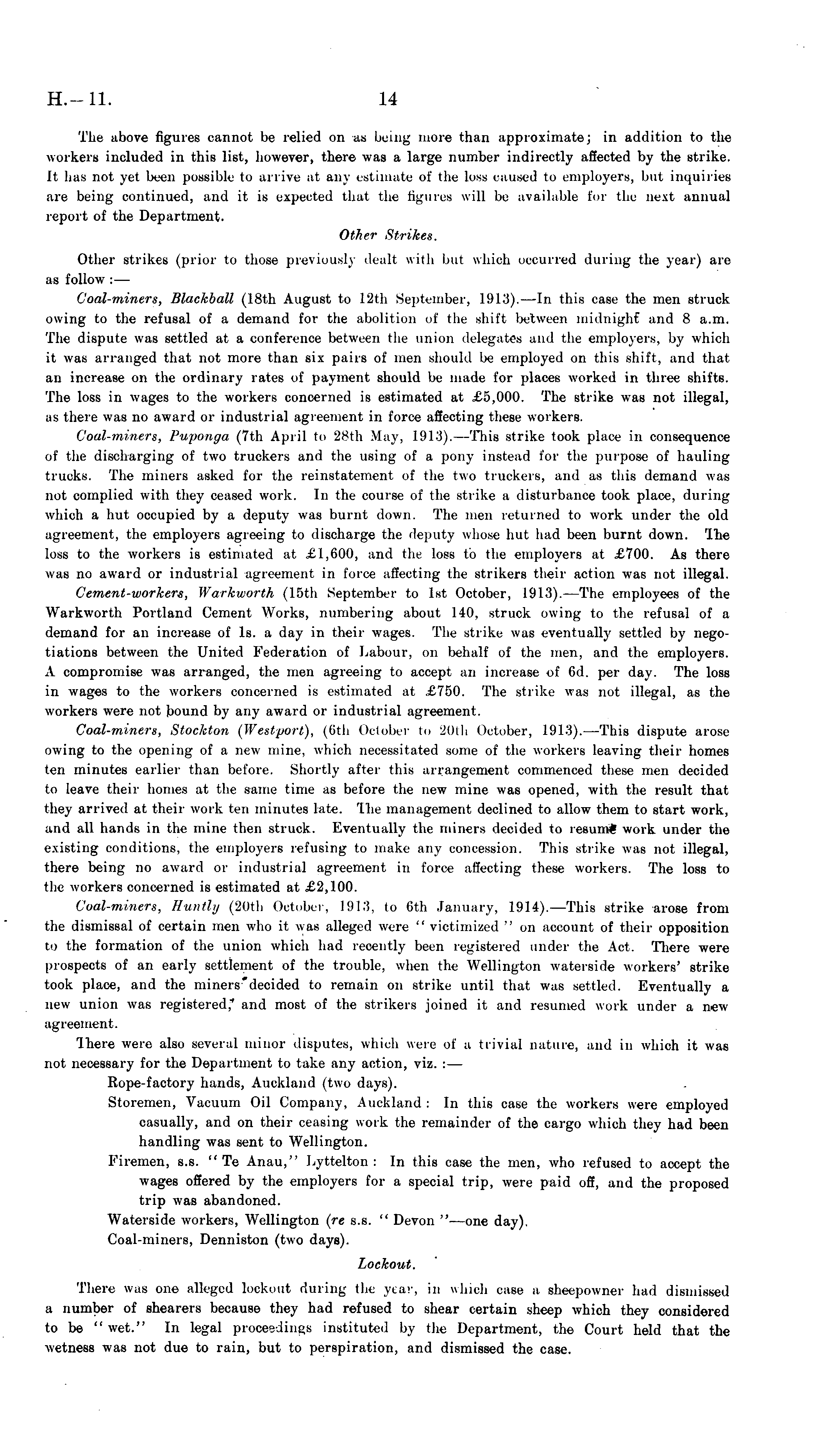 The above figures cannot be relied on as being more than approximate; in addition to the workers included in this list, however, there was a large number indirectly affected by the strike. It has not yet been possible to arrive at any estimate of the loss caused to employers, but inquiries are being continued, and it is expected that the figures will be available for the next annual report of the Department. Other Strikes. Other strikes (prior to those previously dealt with but which occurred during the year) are as follow :— Coal-miners, Blackball (18th August to 12th September, 1913). —In this case the men struck owing to the refusal of a demand for the abolition of the shift between midnight and 8 a.m. The dispute was settled at a conference between the union delegates and the employers, by which it was arranged that not more than six pairs of men should be employed on this shift, and that an increase on the ordinary rates of payment should be made for places worked in three shifts. The loss in wages to the workers concerned is estimated at .£5,000. The strike was not illegal, as there was no award or industrial agreement in force affecting these workers. Coal-miners, Puponga (7th April to 28th May, 1913). —litis strike took place in consequence of the discharging of two truckers and the using of a pony instead for the purpose of hauling trucks. The miners asked for the reinstatement of the two truckers, and as this demand was not complied with they ceased work. In the course of the strike a disturbance took place, during which a hut occupied by a deputy was burnt down. The men returned to work under the old agreement, the employers agreeing to discharge the deputy whose hut had been burnt down. Ihe loss to the workers is estimated at .£1,600, and the loss to the employers at £700. As there was no award or industrial agreement in force affecting the strikers their action was not illegal. Cement-workers, Warkworth (15th September to Ist October, 1913). —The employees of the Warkworth Portland Cement Works, numbering about 140, struck owing to the refusal of a demand for an increase of Is. a day in their wages. The strike was eventually settled by negotiations between the United Federation of Labour, on behalf of the men, and the employers. A compromise was arranged, the men agreeing to accept an increase of 6d. per day. The loss in wages to the workers concerned is estimated at £750. The strike was not illegal, as the workers were not bound by any award or industrial agreement. Coal-miners, Stockton (Westport), (6th October to 20th October, 1913). —This dispute arose owing to the opening of a new mine, which necessitated some of the workers leaving their homes ten minutes earlier than before. Shortly after this arrangement commenced these men decided to leave their homes at the same time as before the new mine was opened, with the result that they arrived at their work ten minutes late. The management declined to allow them to start work, and all hands in the mine then struck. Eventually the miners decided to resumf work under the existing conditions, the employers refusing to make any concession. This strike was not illegal, there being no award or industrial agreement in force affecting these workers. The loss to the workers concerned is estimated at £2,100. Coal-miners, Huntly (20th October. 1913, to 6th January, 1914). —This strike arose from the dismissal of certain men who it was alleged were " victimized " on account of their opposition to the formation of the union which had recently been registered under the Act. There were prospects of an early settlement of the trouble, when the Wellington waterside workers' strike took place, and the miners'decided to remain on strike until that was settled. Eventually a new union was registered,'* and most of the strikers joined it and resumed work under a new agreement. 'Ihere were also several minor disputes, which were of a trivial nature, and in which it was not necessary for the Department to take any action, viz. :— Rope-factory hands, Auckland (two days). Storemen, Vacuum Oil Company, Auckland : In this case the workers were employed casually, and on their ceasing work the remainder of the cargo which they had been handling was sent to Wellington. Firemen, s.s. "Te Anau," Lyttelton : In this case the men, who refused to accept the wages offered by the employers for a special trip, were paid off, and the proposed trip was abandoned. Waterside workers, Wellington (re s.s. " Devon " —one day). Coal-miners, Denniston (two days). Lockout. There was one alleged lockout during the year, in which case a sheepowner had dismissed a number of shearers because they had refused to shear certain sheep which they considered to be "wet." In legal proceedings instituted by the Department, the Court held that the wetness was not due to rain, but to perspiration, and dismissed the case.