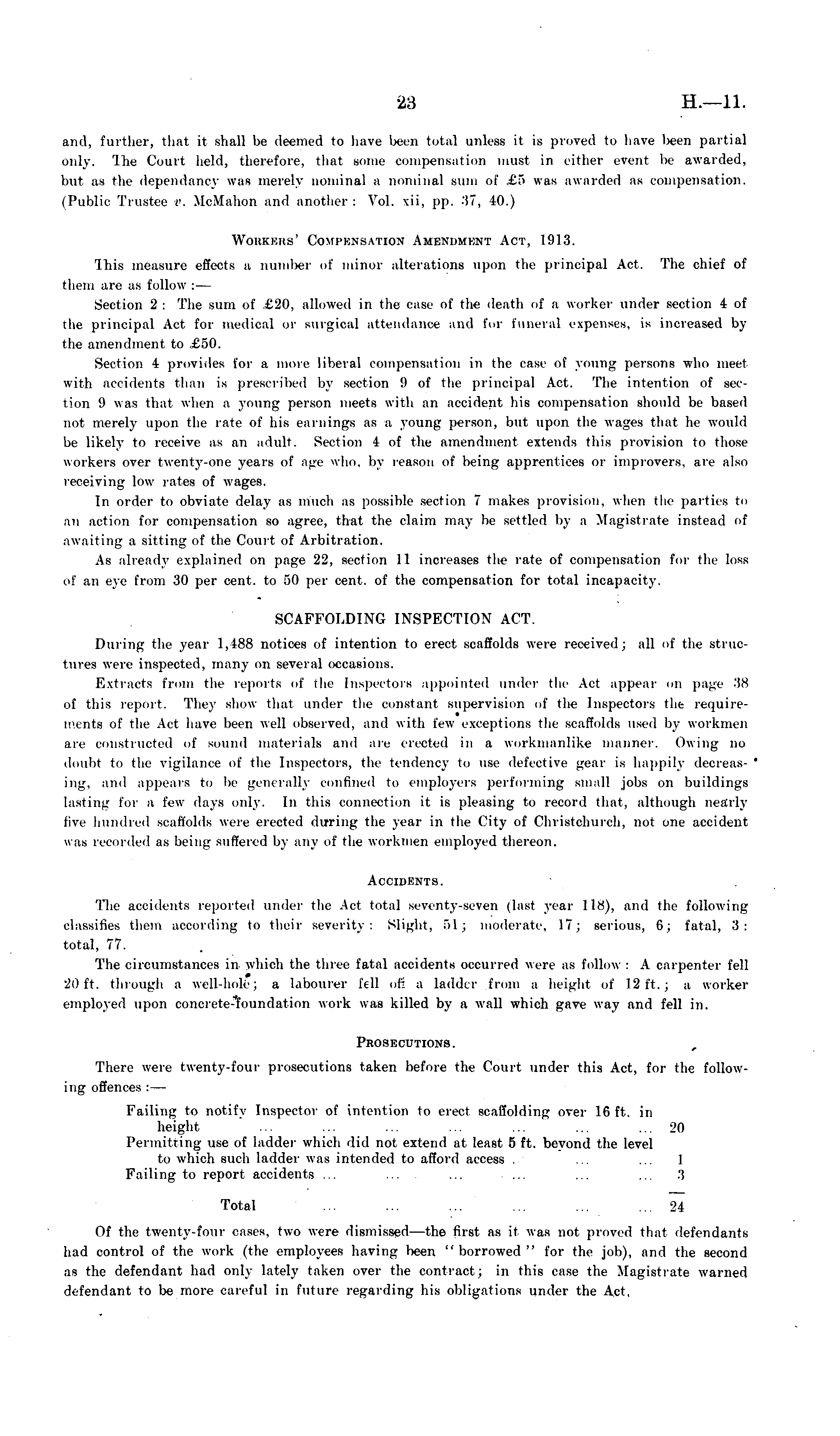 and. further, that it shall be deemed to have been total unless it is proved to have been partial only. 'Ihe Court held, therefore, that some compensation must in either event be awarded, but as the dependancy was merely nominal a nominal sum of £5 was awarded as compensation. (Public Trustee v. McMahon and another: Vol. xii, pp. 37, 10.) Workers' Compensation Amendment Aot, 1913. This measure effects a number of minor alterations upon the principal Act. The chief of them are as follow :— Section 2: The sum oi £2(1. allowed in the ease of the death of a worker under section 4 of the principal Act for medical or surgical attendance ami for funeral expenses, is increased by the amendment to £50. Section 4 provides for a more liberal compensation In the case of young persons who meet with accidents than is prescribed by section i) of the principal Act. The intention of sec tion !l was that when a young person meets with an accident his compensation should be based not merely upon tin 1 rate of his earnings as a young person, but upon the wages that he would be likely to receive as an adult. Section 4 of the amendment extends this provision to those workers over twenty-one years of age who. by reason of being apprentices or improvers, are also in living low rates of wages. In order to obviate delay as much as possible section 7 makes provision, when the parties to an action for compensation so agree, that the claim may be settled by a Magistrate instead of awaiting a sitting of the Court of Arbitration. As already explained on page 22, section 11 increases the rate of compensation for the loss of an eye from 30 per cent, to 50 per cent, of the compensation for total incapacity. SCAFFOLDING INSPECTION ACT. During the year 1,488 notices of intention to erect scaffolds were received; all of the structures were inspected, many on several occasions. Extracts from the reports of (he Inspectors appointed under the Act appear on page 38 of this report. They show thai under the constant supervision of the Inspectors the requirements of the Act have been well observed, and with few exceptions the scaffolds used by workmen are constructed of sound materials and are erected in a workmanlike manner. Owing no doubt to the vigilance of the Inspectors, the tendency to use defective gear is happily docreasing, and appears to be generally confined to employers performing small jobs on buildings lasting for a few days only. In this connection it is pleasing to record that, although nearly live hundred scaffolds were erected during the year in the City of Christchurch, not one accident was recorded as being suffered by any of the workmen employed thereon. Accidents. The accidents reported under the Act total seventy-seven (last year 118), and the following classifies them according to their severity: Slight, 51; moderate, 17: serious, (i ; fatal, 3: total, 77. The circumstances in which the three fatal accidents occurred were as follow: A carpenter fell 20ft. through a will hole; a labourer fill of- a Ladder from a height of 12ft.; a worker employed upon concrete-foundation work was killed by a wall which gave way and fell in. Prosecutions. There were twenty-four prosecutions taken before the Court under this Act, for the following offences : — Failing to notify Inspector of intention to erect scaffolding over 16 ft. in height ... ... ... ... ... ... ... 20 Permitting use of ladder which did not extend at least 5 ft. beyond the level to which such ladder was intended to afford access ... ... I Failing to report accidents ... ... ... ... ... ... 3 Total ... ... ... ... ... ... 24 Of the twenty-four eases, two were dismissed —the first as it was not proved that defendants had control of the work (the employees having lieen "borrowed " for the job), and the second as the defendant had only lately taken over the contract; in this case the Magistrate warned defendant to be more careful in future regarding his obligations under the Act,