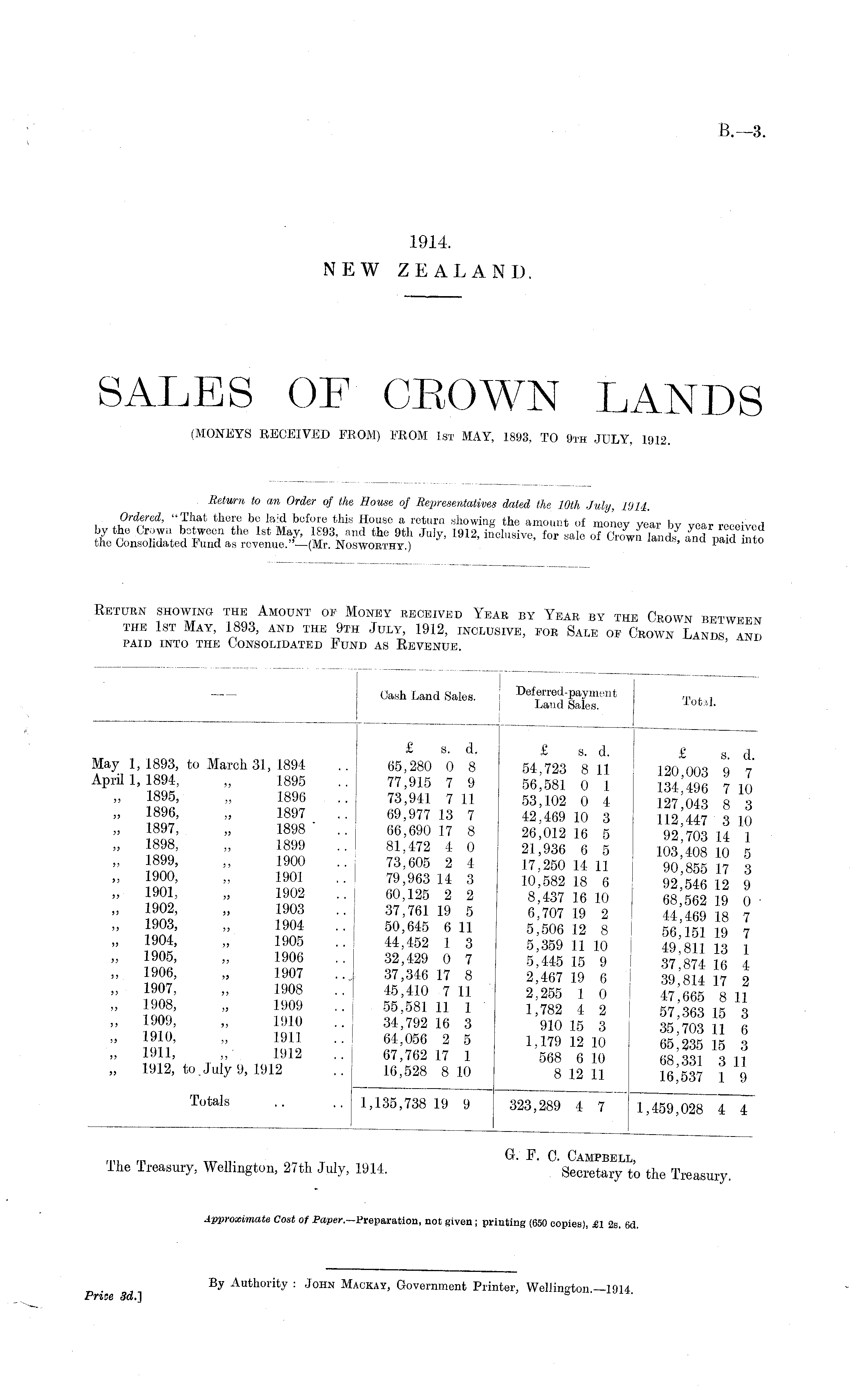 Return showing the Amount of Money received Year by Year by the Crown between the 1st May, 1893, and the 9th July, 1912, inclusive, For Sale of Crown Lands, and paid into the consolidated Fund as Revenue.