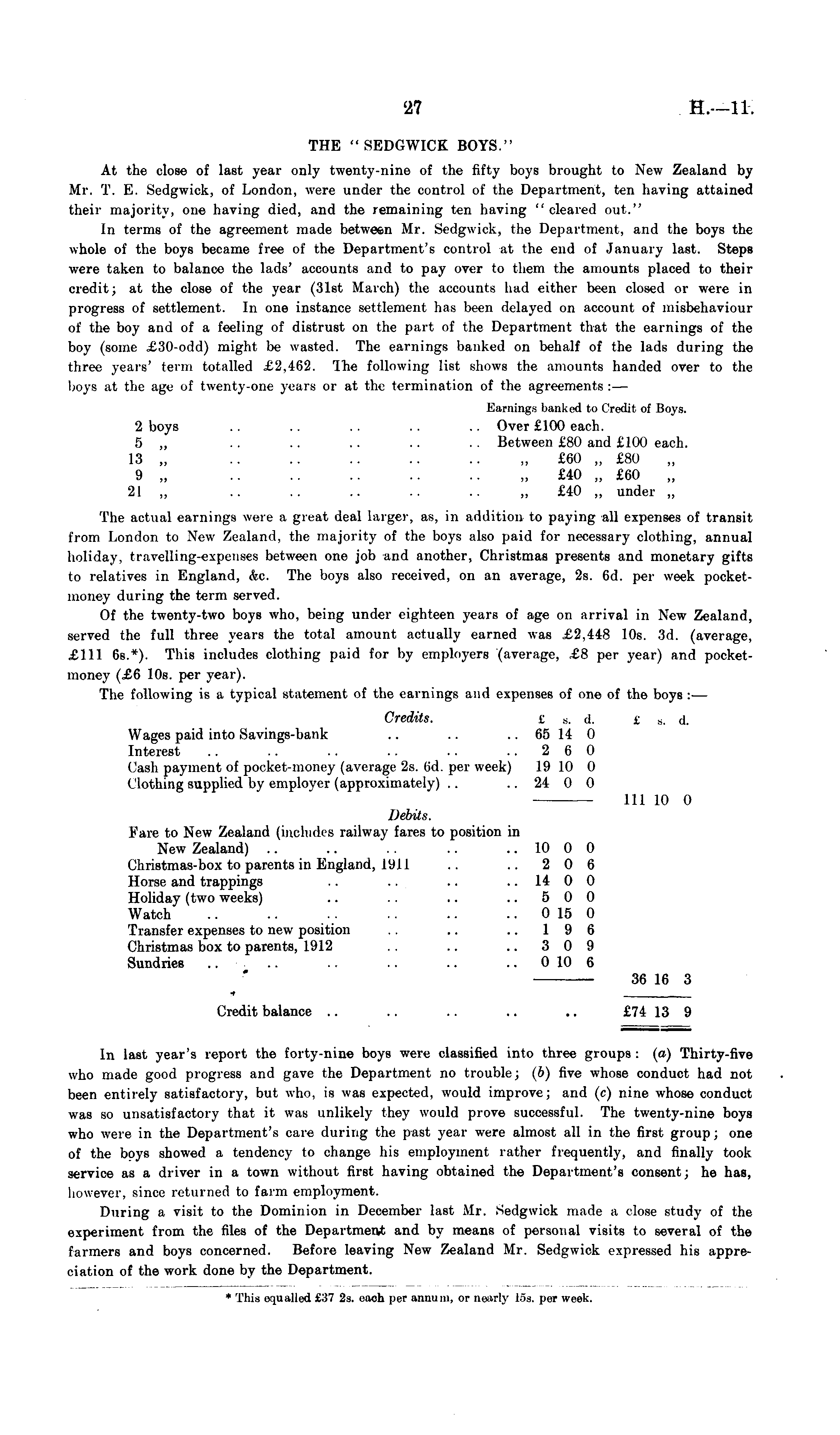 THE "SEDGWICK BOYS." At the close of last year only twenty-nine of the fifty boys brought to New Zealand by Mr. T. E. Sedgwick, of London, were under the control of the Department, ten having attained their majority, one having died, and the remaining ten having "cleared out." In terms of the agreement made between Mr. Sedgwick, the Department, and the boys the whole of the boys became free of the Department's control at the end of January last. Steps were taken to balance the lads' accounts and to pay over to them the amounts placed to their credit; at the close of the year (31st March) the accounts had either been closed or were in progress of settlement. In one instance settlement has been delayed on account of misbehaviour of the boy and of a feeling of distrust on the part of the Department that the earnings of the boy (some £30-odd) might lie wasted. The earnings banked on behalf of the lads during the three years' term totalled £2,462. r lhe following list shows the amounts handed over to the boys at the age of twenty-one years or at the termination of the agreements :— Earnings hanked to Credit of Boys. 2 boys .. .. .. .. .. Over £100 each. 5 „ . . .. .. .. . . Between £80 and £100 each. 13 „ .. .. .. .. .. £60 „ £80 9 „ „ £40 „ £60 „ 21 „ .. .. .. .. .. ~ £40 „ under „ The actual earnings were a great deal larger, as, in addition to paying all expenses of transit from London to New Zealand, the majority of the boys also paid for necessary clothing, annual holiday, travelling-expenses between one job and another, Christmas presents and monetary gifts to relatives in England, &o. The boys also received, on an average, 2s. 6d. per week pocketmoney during the term served. Of the twenty-two boys who, being under eighteen years of age on arrival in New Zealand, served the full three years the total amount actually earned was £2,448 10s. 3d. (average, £111 6s.*). This includes clothing paid for by employers (average, £8 per year) and pocketmoney (£6 10s. per year). The following is a typical statement of the earnings and expenses of one of the boys :— Credits. r. B . d. a .-. d. Wages paid into Savings-bank .. .. .. 65 14 0 Interest .. .. .. .. .. ..260 Cash payment of pocket-money (average 2s. 6d. per week) 19 10 0 Clothing supplied by employer (approximately) .. .. 24 0 0 11l 10 0 Debits. Fare to New Zealand (includes railway fares to position in New Zealand) .. .. .. .. 10 0 0 Christmas-box to parents in England, 1911 .. .. 2 0 6 Horse and trappings .. .. .. 14 0 0 Holiday (two weeks) .. .. .. ..500 Watch .. .. .. .. .. .. 0 15 0 Transfer expenses to new position .. .. .. 19 6 Christmas box to parents, 1912 .. .. .. 309 Sundries .. .. .. .. .. .. 010 6 36 16 3 Credit balance .. .. .. .. .. £74 13 9 In last year's report the forty-nine boys were classified into three groups : (a) Thirty-five who made good progress and gave the Department no trouble; (b) five whose conduct had not been entirely satisfactory, but who, is was expected, would improve; and (c) nine whose conduct was so unsatisfactory that it was unlikely they would prove successful. The twenty-nine boys who were in the Department's care during the past year were almost all in the first group; one of the boys showed a tendency to change his employment rather frequently, and finally took service as a driver in a town without first having obtained the Department's consent; he has, however, since returned to farm employment. During a visit to the Dominion in December last Mr. Sedgwick made a close study of the experiment from the files of the Department and by means of personal visits to several of the farmers and boys concerned. Before leaving New Zealand Mr. Sedgwdck expressed his appreciation of the work done by the Department.