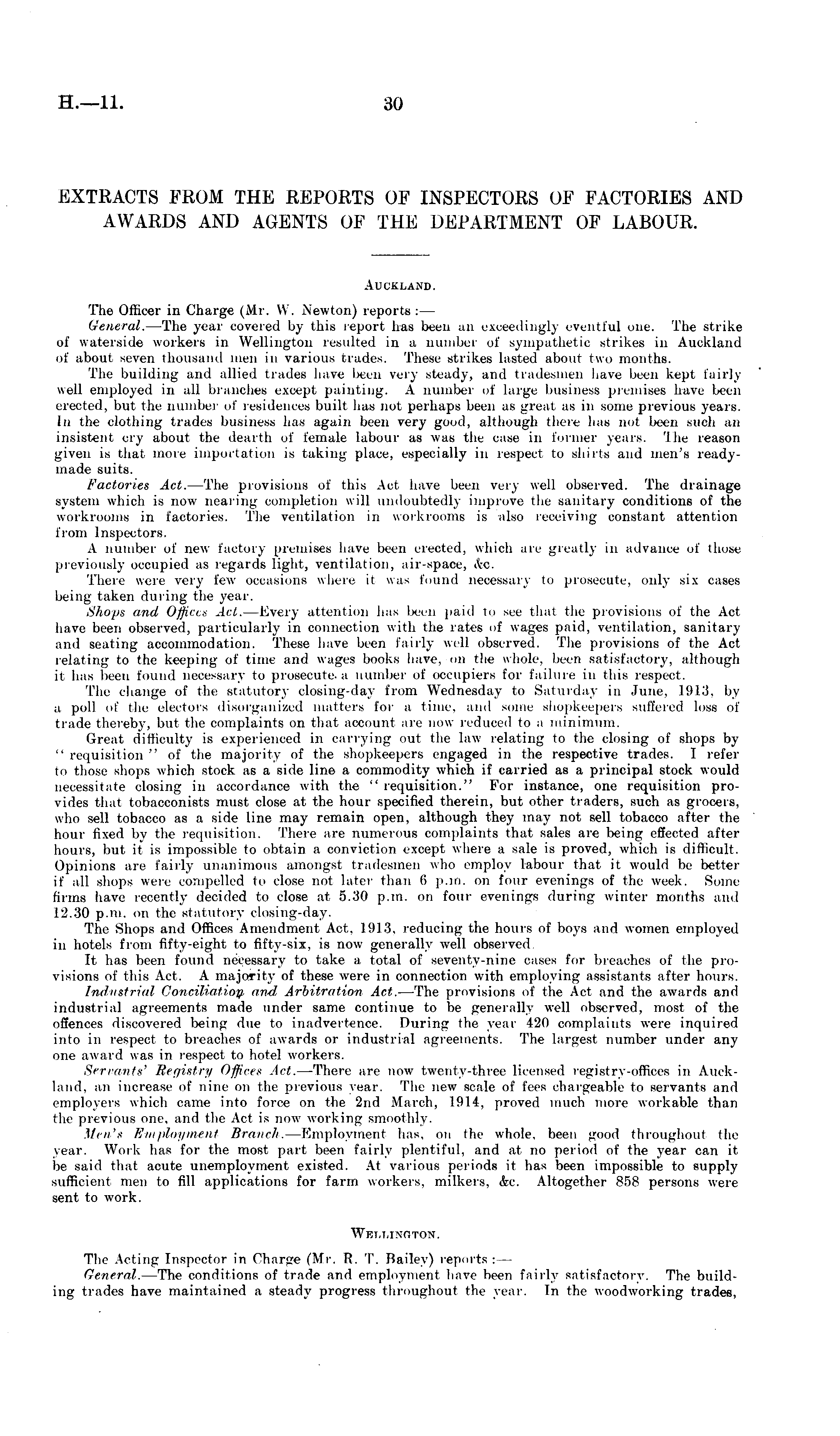 Auckland. The Officer in Charge (Mr. W. Newton) reports : — General. —The year covered by this report has been an exceedingly eventful one. The strike of waterside workers in Wellington resulted in a number of sympathetic strikes in Auckland of about seven thousand men in various trades. These strikes lasted about two months. The building and allied trades have been \tjix steady, and tradesmen have been kept fairly well employed in all branches except painting. A number of large business premises have been erected, but the number of residences built has not perhaps been as great as in some previous years. In the clothing trades business has again been very good, although there has not been such an insistent cry about the dearth of female labour as was the ease in former years. 'I he reason given is that more importation is taking place, especially in respect to shirts ami men's readymade suits. Factories Act. —The provisions of this Act have been very well observed. The drainage system which is now nearing completion will undoubtedly improve the sanitary conditions of the workrooms in factories. The ventilation in workrooms is also receiving constant attention from Inspectors. A number of new factory premises have been erected, which are greatly in advance of those previously occupied as regards light, ventilation, air-space, &C. There were very few occasions where it was found necessary to prosecute, only six eases being taken during the year. Shops and Offices Act. —Every attention has been paid to see that the provisions of the Act have been observed, particularly in connection with the rates of wages paid, ventilation, sanitary and seating accommodation. These have been fairly well observed. The provisions of the Act relating to the keeping of time and waves hooks have, on the whole, been satisfactory, although it has been found necessary to prosecute, a number of occupiers for failure in this respect. The change of the statutory closing-day from Wednesday to Saturday in June, 1913, by a poll of the electors disorganized matters for a time, and some shopkeepers suffered loss of trade thereby, but the complaints on that account are now reduced to a minimum. Great difficulty is experienced in carrying out the law relating to the closing of shops by " requisition " of the majority of the shopkeepers engaged in the respective trades. I refer to those shops which stock as a side line a commodity which if carried as a principal stock would necessitate closing in accordance with the " requisition." For instance, one requisition provides that tobacconists must close at the hour specified therein, but other traders, such as grocers, who sell tobacco as a side line may remain open, although they may not sell tobacco after the hour fixed by the requisition. There are numerous complaints that sales are being effected after hours, but it is impossible to obtain a conviction except where a sale is proved, which is difficult. Opinions are fairly unanimous amongst tradesmen who employ labour that it would be better if all shops were compelled to close not later than (i p.m. on four evenings of the week. Some firms have recently decided to close at 5.30 p.m. on four evenings during winter months and 12.30 p.m. on the statutory closing-day. The Shops and Offices Amendment Act, 1913, reducing the hours of boys and women employed in hotels from fifty-eight to fifty-six, is now generally well observed It has been found necessary to take a total of seventy-nine eases for breaches of the provisions of this Act. A majority of these were in connection with employing assistants after hours. I nil ust rial Conciliation and Arbitration Act. —The provisions of the Act and the awards and industrial agreements made under same continue to be generally well observed, most of the offences discovered being due to inadvertence. During the year 420 complaints were inquired into in respect to breaches of awards or industrial agreements. The largest number under any one award was in respect to hotel workers. Servants' Registry Offices Act. —There are now twenty-three licensed registry-offices in Auckland, an increase of nine on the previous year. The new scale of fees chargeable to servants ami employers which came into force on the 2nd March, 1914, proved much more workable than the previous one. and the Act is now working smoothly. Men's Employment Branch. —Employment has. on the whole, been good throughout the \ear. Work has for the most part been fairly plentiful, and at no period of the year can it be said that acute unemployment existed. At various periods it has been impossible to supply sufficient men to fill applications for farm workers, milkers, &c. Altogether 858 persons were sent to work. Wellington. The Acting Inspector in Charge (Mr. R. T. Bailey) reports: — General. —The conditions of trade and employment have been fairly satisfactory. The building trades have maintained a steady progress throughout the year. In the woodworking trades,