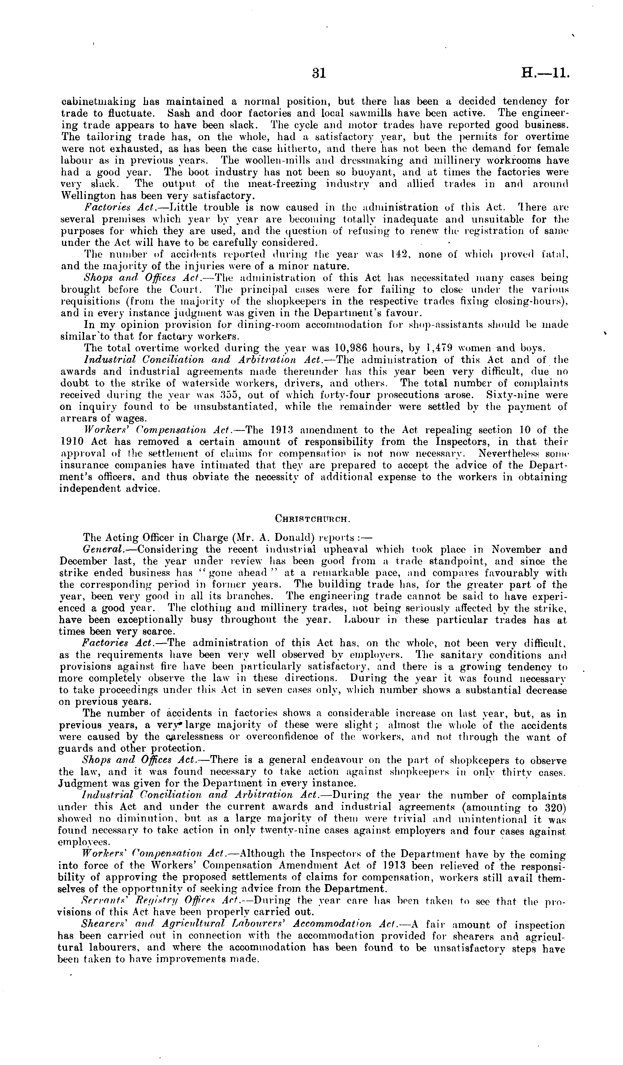 cabinetmaking has maintained a normal position, but there has been a decided tendency for trade to fluctuate. Sash and door factories and local sawmills have been active. The engineering trade appears to have lieen slack. The cycle and motor trades have reported good business. The tailoring trade has, on the whole, hail a satisfactory year, but the permits for overtime were not exhausted, as has been the: case hitherto, and there has not been the demand for female labour as in previous years. The woollen-mills and dressmaking ami millinery workrooms have had a good year. The boot industry has not been so buoyant, and at times the factories were very slack. The output of the meat-freezing industry and allied trades in and around Wellington has been very satisfactory. Factories Act. —Little trouble is now caused in the administration of this Act. 'I here are several premises which year by year are becoming totally inadequate and unsuitable for the purposes for which they are used, ami the question of refusing to renew the registration of same under the Act will have to be carefully considered. The number of accidents reported during 'he year was I 12. none of which proved fatal. and the majority of the injuries were of a minor nature. Shops anil Offices Act. The administration of this Act has necessitated many eases being brought before the Court. The principal eases were for failing to close under the various requisitions (from the majority of the shopkeepers in the respective trades fixing closing-hours), and in every instance judgment was given in the Department's favour. In my opinion provision for dining-room accommodation for shop assistants should be made similar to that for factory workers. The total overtime worked during the year was 10,986 hours, by 1.479 women and boys. Industrial Conciliation and Arbitration Act. —The administration of this Act and of the awards and industrial agreements made thereunder has this year been very difficult, due no doubt to the strike of waterside workers, drivers, and others. The total number of complaints received during the year was 355, out of which forty-four prosecutions arose. Sixty-nine were on inquiry found to be unsubstantiated, while the remainder were settled by the payment of arrears of wages. Workers' Compensation Art. The 1913 amendment to the Act repealing section 10 of the 1910 Act has removed a certain amount of responsibility from the Inspectors, in that their approval of the settlement oi claims I'm- compensatior !■• not now necessary. Nevertheless Borne insurance companies have intimated thai they are prepared to accept the advice of the Department's officers, and thus obviate the necessity of additional expense to the workers in obtaining independent advice. ChRISTCHUHCH. The Acting Officer in Charge (Mr. A. Donald.) reports : — General. —Considering the recent industrial upheaval which took place in November and Decemlxu- last, the year under review has been good from a trade standpoint, and since the strike ended business has "gone ahead" at a remarkable pace, and compares favourably with the corresponding period in former years. The building trade has, for the greater part of the year, been very good in all its branches. The engineering trade cannot be said to have experienced a good year. The clothing and millinery trades, not being seriously affected by the strike. have been exceptionally busy throughout the year. Labour in these particular trades has at times been very scarce. Factories Act. —The administration of this Act has. on the whole, not been very difficult. as the requirements have l>een very well observed by employers. The sanitary conditions and provisions against fire have been particularly satisfactory, and there is a growing tendency to more completely observe the law in these directions. During the year it was found necessary to take proceedings under this Act in seven cases only, which number shows a substantial decrease on previous years. The number of accidents in factories shows a considerable increase on last year, but. as in previous years, a veryflarge majority of these were slight; almost the whole of the accidents wore caused by the carelessness or overconlidence of the workers, and not through the want of guards and other protection. Shops ami Offices Act. —There is a general endeavour on the part of shopkeepers to observe the law, and it was found necessary to take action against shopkeepers in only thirty eases. Judgment was given for the Department in every instance. Iml ust rial Conciliation anil Arbitration Act. —During the year tin number of complaints under this Act and under the current awards and industrial agreements (amounting to 320) showed no diminution, but as a large majority of them were trivial and unintentional it was found necessary to take action in only twenty-nine cases against employers and four eases against employers. Workers' Compensation Act. —Although tin; Inspectors of the Department have by the coming into force of the Workers' Compensation Amendment Act id' 1913 been relieved of the responsibility of approving the proposed settlements of claims for compensation, workers still avail themselves of the opportunity of seeking advice from the Department. Servants' Registry Offices Act. —During the year care has been taken to see that the provisions of this Act have been properly carried out. Shearers' ami Agricultural labourers' Accommodation Art. A fair amount of inspection has been carried out in connection with the accommodation provided for shearers and agricultural labourers, and where the accommodation has been found to be unsatisfactory steps have been taken to have improvements made.