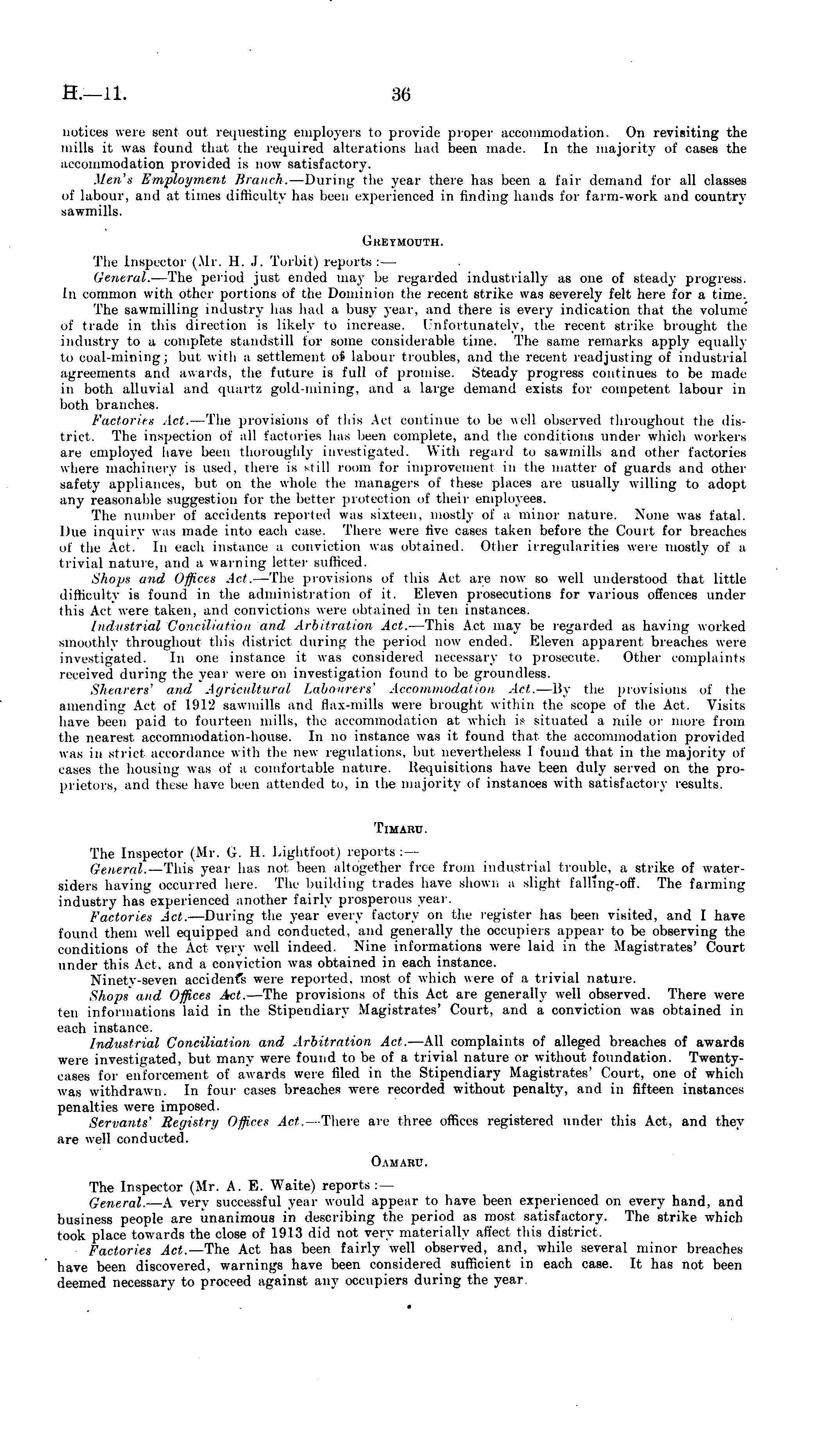 notices were sent out requesting employers to provide proper accommodation. On revisiting the mills it was found that the required alterations had been made. In the majority of cases the accommodation provided is now satisfactory. Mill's Employment Branch. — During the year there has been a fair demand for all classes of labour, and at times difficulty has been experienced in finding hands for farm-work and country sawmills. Greymouth. The Inspector (Mr. 11. .1. Torbit) reports:— General. —The period just ended may be regarded industrially as one of steady progress. In common with other portions of the Dominion the recent strike was severely felt here for a time. The sawmilling industry has had a busy year, and there is every indication that the volume of trade in this direction is likely to increase. Unfortunately, the recent, strike brought the industry to a complete standstill tor some considerable time. The same remarks apply equally to coal-mining; but with a settlement oi labour troubles, and the recent readjusting of industrial agreements ami awards, the future is full of promise. Steady progress continues to be made in both alluvial and quartz gold-mining, and a large demand exists for competent labour in both branches. Factories Act. — The provisions of this Act continue to be well observed throughout the district. The inspection of all factories has been complete, and the conditions under which workers an employed have been thoroughly investigated. With regard to sawmills ami other factories where machinery is used, there is -till room for improvement in the matter of guards and other safety appliances, but on the whole the managers of these places are usually willing to adopt any reasonable suggestion for the better protection of their employees. The number of accidents reported was sixteen, mostly of a minor nature. None was fatal. Due inquiry was made into each case. There were five cases taken before the Court for breaches of the Aci. In each instance a conviction was obtained. Other irregularities were mostly of a trivial nature, ami a warning letter sufficed. Shops anil Offices Act. —The provisions of this Act are now so w 7 ell understood that little difficulty is found in the administration of it. Eleven prosecutions for various offences under this Act were taken, and convictions were obtained in ten instances. Iml ust rial Conciliation ami Arbitration Act. —This Act may be regarded as having worked smoothly throughout this district during the period now ended. Eleven apparent breaches were investigated. In one instance it was considered necessary to prosecute. Other complaints received during the year were on investigation found to be groundless. Shearers' ami Agricultural Labourers' Accommodation Act. —By the provisions of the amending Act of 1912 sawmills and Sax-mills were brought within the scope of the Act. Visits have been paid to fourteen mills, the accommodation at which i* situated a mile or more from the nearest accommodation-house. In no instance was it found that the accommodation provided was in strict accordance with the new regulations, hut nevertheless I found that in the majority of cases the housing was of a comfortable nature. Requisitions have been duly served on the proprietors, and these Save been attended to, in the majority of instances with satisfactory results. TIMARU. The Inspector (Mr. C. U. Lightfoot) reports:— General. —This year has not been altogether free from industrial trouble, a strike of watersiders having occurred here. The building trades have shown a slight falling-off. The farming industry has experienced another fairly prosperous year. Factories Act. —During the year every factory on the register has been visited, and I have found them well equipped and conducted, and generally the occupiers appear to be observing the conditions of the Act very well indeed. Nine informations were laid in the Magistrates' Court under this Act, and a conviction was obtained in each instance. Ninety-seven accident's were reported, most of which were of a trivial nature. Shops and Offices Act. —The provisions of this Act are generally well observed. There were ten informations laid in the Stipendiary Magistrates' Court, and a conviction was obtained in each instance. Industrial Conciliation and Arbitration Act. —All complaints of alleged breaches of awards were investigated, but many were found to be of a trivial nature or without foundation. Twentycases for enforcement of awards were filed in the Stipendiary Magistrates' Court, one of which was withdrawn. In four cases breaches were recorded without penalty, and in fifteen instances penalties were imposed. Servants' Registry Offices Act. —There are three offices registered under this Act. and they are well conducted. 0 AMARU. The Inspector (Mr. A. E. Waite) reports: — General. —A very successful year would appear to have been experienced on every hand, and business people are unanimous in describing the period as most satisfactory. The strike which took place towards the close of 1913 did not very materially affect this district. Factories Act. —The Act has been fairly well observed, and, while several minor breaches have been discovered, warnings have been considered sufficient in each case. It has not been deemed necessary to proceed against any occupiers during the year.