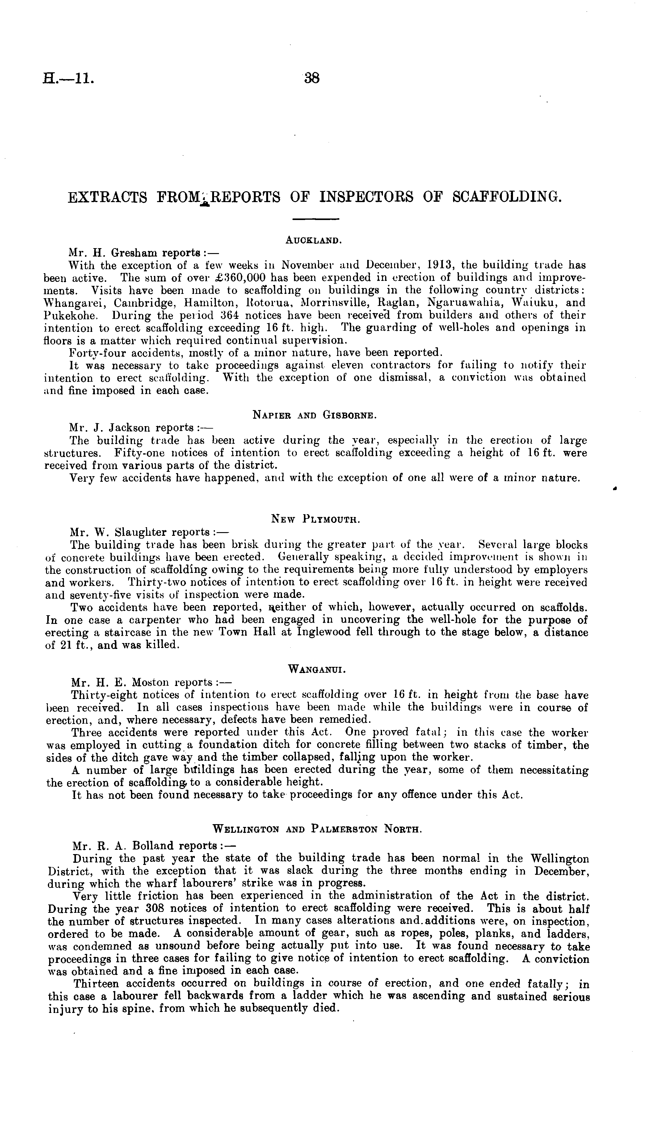 EXTRACTS FROM. REPORTS OF INSPECTORS OF SCAFFOLDING. mm Auckland. Mr. H. Gresham reports : — With the exception of a few weeks in November and December, 1913, the building trade has been active. The sum of over £360,000 has been expended in erection of buildings and improvements. Visits have been made to scaffolding on buildings in the following country districts: Whangarei, Cambridge, Hamilton, Rotorua, Morrinsville, Raglan, Ngaruawahia, Waiuku, and Pukekohe. During the period 364 notices have been received from builders and others of their intention to erect scaffolding exceeding 16 ft. high. The guarding of well-holes and openings in floors is a matter which required continual supervision. Forty-four accidents, mostly of a minor nature, have been reported. It was necessary to take proceedings against eleven contractors for failing to notify their intention to erect scaffolding. With the exception of one dismissal, a conviction was obtained and fine imposed in each case. Napier and Gisborne. Mr. J. Jackson reports : — The building trade has been active during the year, especially in the erection of large structures. Fifty-one notices of intention to erect scaffolding exceeding a height of 16 ft. were received from various parts of the district. Very few accidents have happened, and with the exception of one all were of a minor nature. New Plymouth. Mr. W. Slaughter reports: — The building trade has been brisk during the greater part of the year. Several large blocks in concrete buildings have been erected. Generally speaking, a decided improvement is shown in the construction of scaffolding owing to the requirements being more fully understood by employers and workers. Thirty-two notices of intention to erect scaffolding over 16 ft. in height were received and seventy-five visits of inspection were made. Two accidents have been reported, neither of which, however, actually occurred on scaffolds. In one case a carpenter who had been engaged in uncovering the well-hole for the purpose of erecting a staircase in the new Town Hall at Inglewood fell through to the stage below, a distance of 21 ft., and was killed. Wanganui. Mr. H. E. Moston reports : — Thirty-eight notices of intention to erect scaffolding over 16 ft. in height from the base have been received. In all eases inspections have been made while the buildings were in course of erection, and, where necessary, defects have been remedied. Three accidents were reported under this Act. One proved fatal; in this case the worker was employed in cutting a foundation ditch for concrete filling between two stacks of timber, the sides of the ditch gave way and the timber collapsed, falling upon the worker. A number of large brfildings has been erected during the year, some of them necessitating the erection of scaffolding, to a considerable height. It has not been found necessary to take proceedings for any offence under this Act. Wellington and Palmerston North. Mr. R. A. Bolland reports : — During the past year the state of the building trade has been normal in the Wellington District, with the exception that it was slack during the three months ending in December, during which the wharf labourers' strike was in progress. Very little friction has been experienced in the administration of the Act in the district. During the year 308 notices of intention to erect scaffolding were received. This is about half the number of structures inspected. In many cases alterations and additions were, on inspection, ordered to be made. A considerable amount of gear, such as ropes, poles, planks, and ladders, was condemned as unsound before being actually put into use. It was found necessary to take proceedings in three cases for failing to give notice of intention to erect scaffolding. A conviction was obtained and a fine imposed in each case. Thirteen accidents occurred on buildings in course of erection, and one ended fatally; in this case a labourer fell backwards from a ladder which he was ascending and sustained serious injury to his spine, from which he subsequently died.