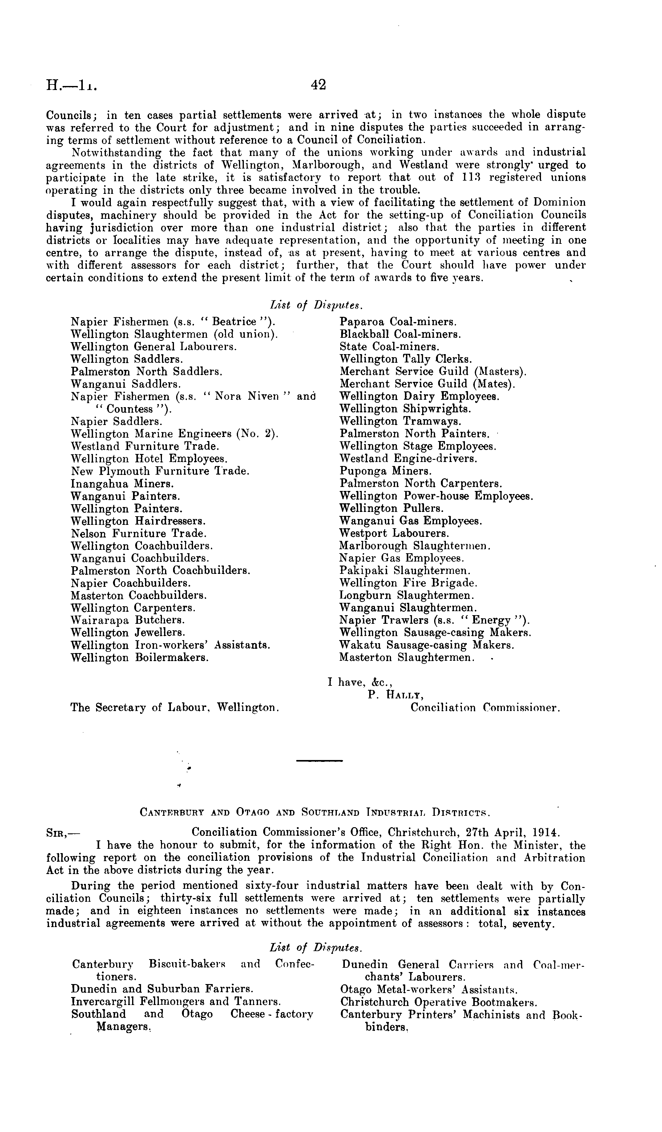 Councils; in ten cases partial settlements were arrived at; in two instances the whole dispute was referred to the Court for adjustment; and in nine disputes the parties succeeded in arranging terms of settlement without reference to a Council of Conciliation. Notwithstanding the fact that many of the unions working under awards and industrial agreements in the districts of Wellington, Marlborough, and Westland were strongly" urged to participate in the late strike, it is satisfactory to report that out of 113 registered unions operating in the districts only three became involved in the trouble. I would again respectfully suggest that, with a view of facilitating the settlement of Dominion disputes, machinery should be provided in the Act for the setting-up of Conciliation Councils having jurisdiction over more than one industrial district; also that the parties in different districts or localities may have adequate representation, and the opportunity of meeting in one centre, to arrange the dispute, instead of, as at present, having to meet at various centres and with different assessors for each district; further, that the Court should have power under certain conditions to extend the present limit of the term of awards to five years. List of Disputes. Napier Fishermen (s.s. " Beatrice "). Paparoa Coal-miners. Wellington Slaughtermen (old union). Blackball Coal-miners. Wellington General Labourers. State Coal-miners. Wellington Saddlers. Wellington Tally Clerks. Palmerston North Saddlers. Merchant Service Guild (Masters). Wanganui Saddlers. Merchant Service Guild (Mates). Napier Fishermen (s.s. " Nora Niven " and Wellington Dairy Employees. " Countess "). Wellington Shipwrights. Napier Saddlers. Wellington Tramways. Wellington Marine Engineers (No. 2). Palmerston North Painters. Westland Furniture Trade. Wellington Stage Employees. Wellington Hotel Employees. Westland Engine-drivers. New Plymouth Furniture Trade. Puponga Miners. Inangahua Miners. Palmerston North Carpenters. Wanganui Painters. Wellington Power-house Employees. Wellington Painters. Wellington Pullers. Wellington Hairdressers. Wanganui Gas Employees. Nelson Furniture Trade. Westport Labourers. Wellington Coachbuilders. Marlborough Slaughtermen. Wanganui Coachbuilders. Napier Gas Employees. Palmerston North Coachbuilders. Pakipaki Slaughtermen. Napier Coachbuilders. Wellington Fire Brigade. Masterton Coachbuilders. Longburn Slaughtermen. Wellington Carpenters. Wanganui Slaughtermen. Wairarapa Butchers. Napier Trawlers (s.s. " Energy "). Wellington Jewellers. Wellington Sausage-casing Makers. Wellington Iron-workers' Assistants. Wakatu Sausage-casing Makers. Wellington Boilermakers. Masterton Slaughtermen. I have, &c, P. Hally, The Secretary of Labour, Wellington. Conciliation Commissioner,
