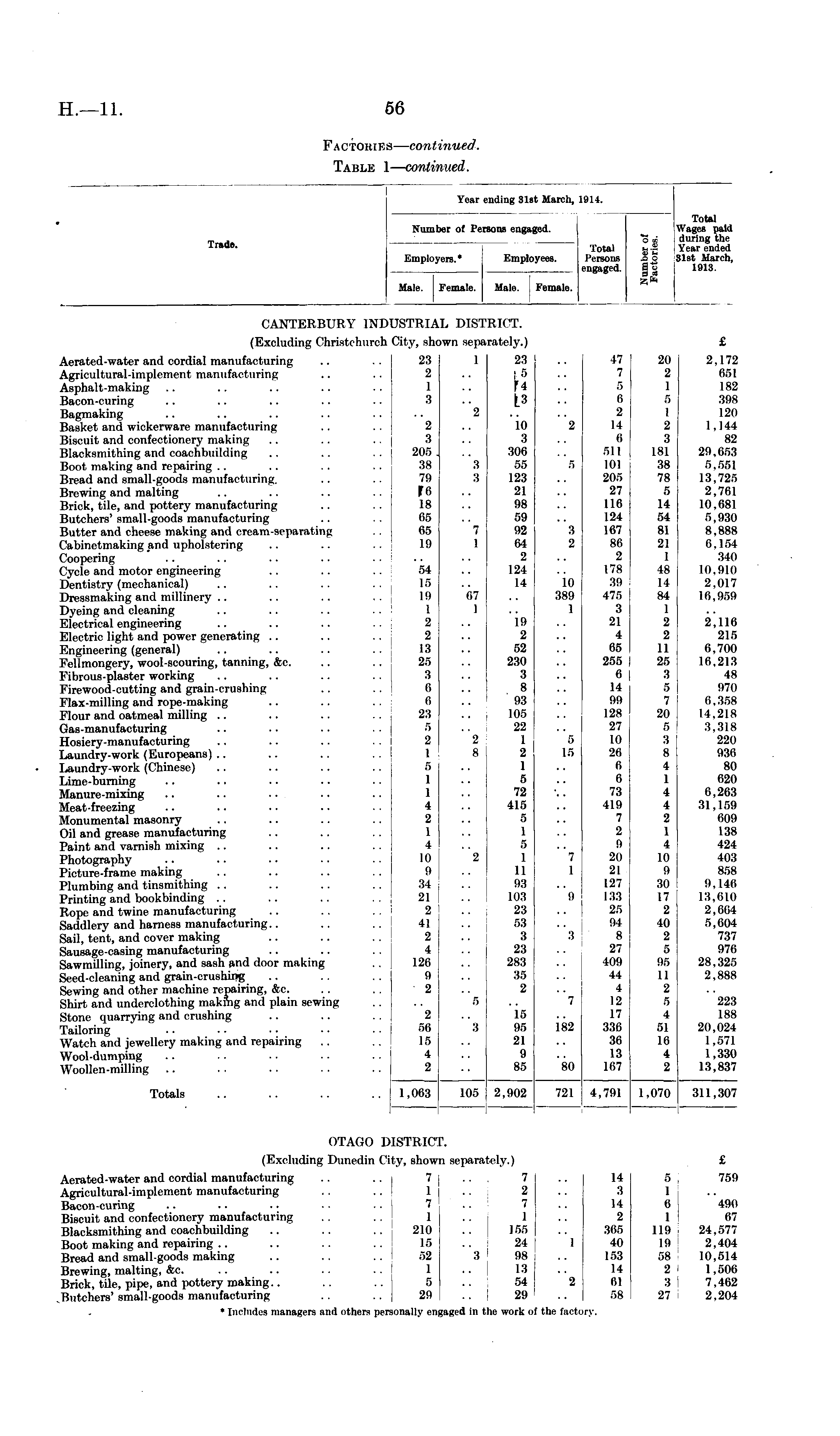 Trade. Year ending 31st March, 1914. Total Number of Persons engaged. Wages paid *o u- during the Total u -2 Year ended Imployers. , Employees. Persons .do 81st March, engaged. S 0 1913. SS tie. Female. Male. Female. Employers.* Male. Female. CANTERBURY INDUSTRIA rSTRIA L DIS r RIOT. (Excluding Christehurch City, she Sty, she iwn sep :ately.) £ Aerated-water and cordial manufacturing .. .. 23 Agricultural-implement mannfaoturing .. .. 2 Asphalt-making .. .. . . .. .. 1 Bacon-curing .. .. .. .. .. 3 Bagmaking Basket and wickerware manufacturing .. .. 2 Biscuit and confectionery making .. .. .. 3 Blacksmithing and ooachbuilding .. .. .. 205 . Bool making and repairing .. .. .. .. 38 Bread and small-goods manufacturing. .. .. 79 Brewing and malting .. .. .. .. F6 Brick, tile, and pottery manufacturing .. .. 18 Butchers' small-goods manufacturing .. .. 65 Butter and cheese making and cream-separating .. 65 Cabinetmaking and upholstering .. .. .. 19 Coopering Cycle and motor engineering .. .. .. 54 Dentistry (mechanical) .. .. .. .. 15 Dressmaking and millinery .. .. .. .. 10 Dyeing and cleaning .. .. .. .. 1 Electrical engineering .. .. .. .. 2 Electric light and power generating .. .. . . 2 Engineering (general) .. .. .. .. 13 Fellmongery, wool-scouring, tanning, &e. .. . . 25 Fibrous-plaster working .. .. .. .. 3 Firewood-cutting and grain-orushing .. .. 6 Flax-milling and rope-making .. .. .. 6 Flour and oatmeal milling .. .. .. .. 23 Gas-manufacturing .. .. .. .. 5 Hosiery-manufacturing .. .. .. .. 2 Laundry-work (Europeans) .. .. .. .. I Laundry-work (Chinese) .. .. .. .. 5 Lime-burning .. .. .. .. 1 Manure-mixing .. .. .. .. .. 1 Meat-freezing .. .. .. .. .. 4 Monumental masonry .. .. .. .. 2 Oil and grease manufacturing .. .. .. 1 Paint and varnish mixing .. .. .. .. 4 Photography .. . • • • .. . • 10 Picture-frame making .. .. .. .. 9 Plumbing and tinsmithing .. .. .. .. 34 Printing and bookbinding .. .. .. .. 21 Elope and twine manufacturing .. .. .. 2 Saddlery and harness manufacturing.. .. .. 41 Sail, tent, and cover making .. .. . . 2 Sausage-casing manufacturing .. .. .. 4 Sawmilling, joinery, and sash and door making . . 126 Seed-cleaning and grain-crushing .. .. .. 9 Sewing and other machine repairing, &c. .. .. 2 Shirt and underclothing makmg and plain sewing Stone quarrying and crushing .. . . .. 2 Tailoring .. • • ■ • • • • • •>•' Watch and jewellery making and repairing .. .. 15 Wool-dumping .. .. .. .. .. 4 Woollen-milling .. .. .. .. .. 2 23 2 1 3 1 23 [5 N 13 47 7 5 6 2 14 6 61] 101 205 27 116 124 167 86 2 178 39 475 3 21 4 65 255 6 14 mi 128 27 10 26 ii l> 73 till 7 2 9 20 21 127 1 33 25 94 8 27 409 44 4 12 17 336 36 13 1(17 I'll 2 1 5 I 2 3 181 38 78 6 14 54 81 21 1 48 14 84 1 2 2 11 25 3 5 7 20 5 3 8 4 1 4 4 2 1 4 10 9 30 17 2 40 2 5 96 11 2 5 4 51 16 4 2 2,172 861 182 398 120 1,144 82 29.11;-,:! 5,661 I :i. 725 2.701 10,681 6,930 8,888 6,154 340 10.910 2,017 16,969 "2 2 3 206 38 79 re 18 65 65 19 10 3 306 55 123 21 98 59 92 64 2 124 14 2 3 3 5 "7 1 "3 2 54 15 19 1 2 2 13 25 3 6 c> 23 6 2 1 5 1 1 4 2 1 4 10 9 34 21 2 41 2 4 126 9 2 67 1 "2 8 1!) 2 52 230 3 8 93 105 22 1 2 1 5 72 415 5 1 5 1 11 93 103 23 53 3 23 283 36 2 10 389 1 "5 16 2,116 215 (i.700 16,213 48 970 6,368 14,218 3,318 220 936 80 (120 6,263 31,159 (ill!) 138 424 403 858 9.146 13,610 2,604 6,604 7:s7 976 28.325 2,888 2 "7 1 "9 "3 6 "7 223 188 20,024 1,571 1,330 13,837 2 .-,(1 15 4 2 ":i 15 95 21 9 85 i82 80 Totals .. .. .. .. 1,063 1,063 105 2,902 721 4,791 1,070 311,307 OTAGO DISTRICT (Excluding Dunedin City, showi i separately.) £ Aerated-water and cordial manufacturing .. .. 7 Agricultural-implement manufacturing .. .. 1 Bacon-curing .. .. .. .. .. 7 Bisouit and confectionery manufacturing .. .. 1 Blacksmithing and coachbuilding .. .. .. 210 Boot making and repairing .. .. .. 16 Bread and small-goods making .. .. .. f>2 Brewing, malting, &c. .. .. . . .. 1 Brick, tile, pipe, and pottery making.. .. .. 5 .Butchers' small-goods manufacturing .. .. 2!) i 155 24 3 98 13 54 29 I 14 3 14 2 366 40 153 14 (11 58 5 1 6 i 1 ll'l l<) 58 2 :i 27 75ft "490 07 24,577 2,404 10,614 l ,506 7,462 2.204 "2 • Includes managers and others personally en| [aged in the work i the facti try.