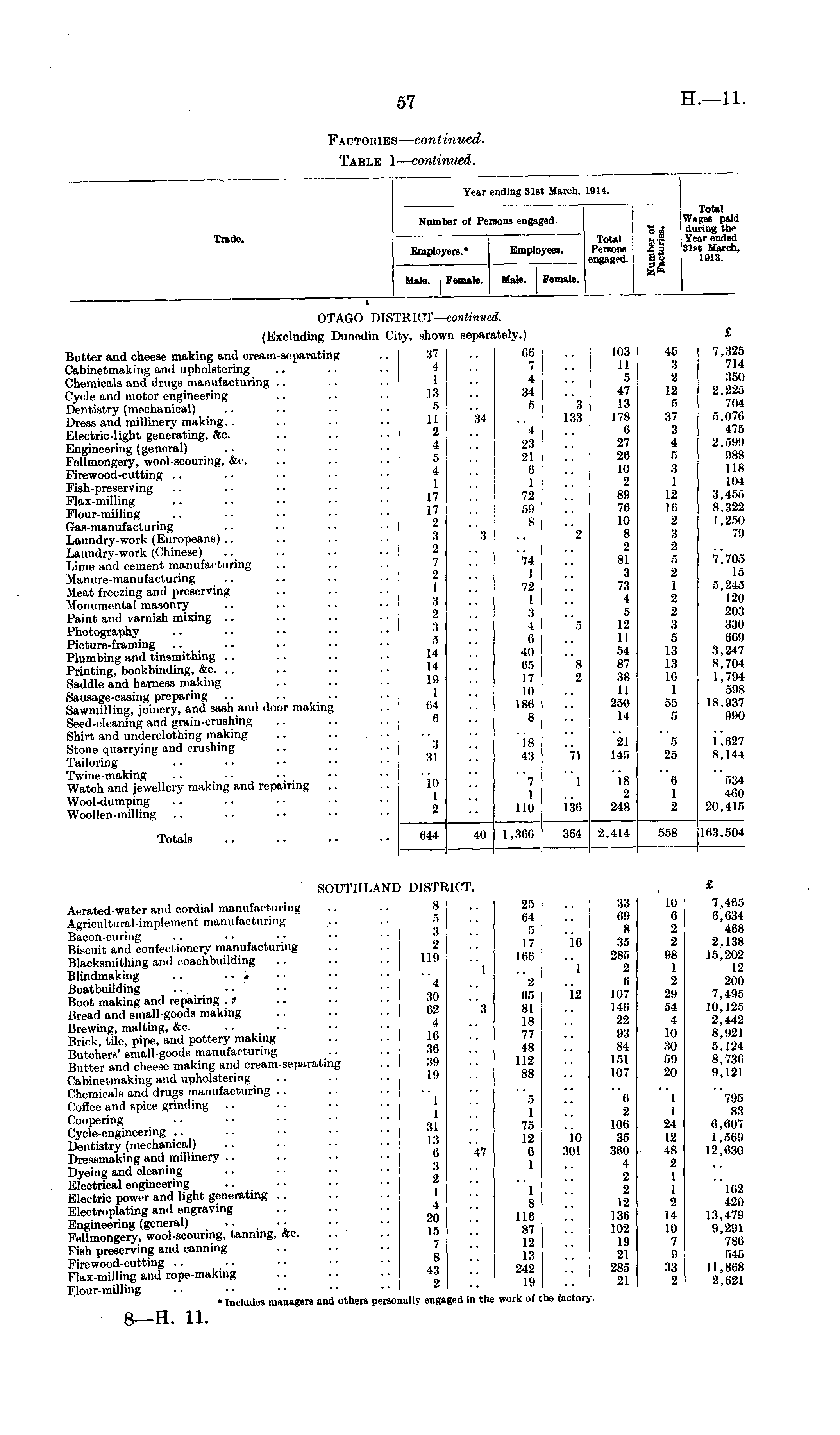 Number of Persons engaged. Year ending 31st March, 1914. i 11 Total Wa Res paid during the Year ended 31st March, 1913. Trade. Employers.* Employees. Total Persons engaged. Male. Female. Hale. I Female. s« — % OTAGO 1)1 SI ■i:kt ■continue I. (Excluding Danedin Ci ;y, shoi 'n separi itely.) £ Butter and cheese making and cream -separating Cabinetmaking and upholstering Chemicals and drugs manufacturing Cycle and motor engineering Dentistry (mechanical) Dress and millinery making.. Electric-light generating, &c. Engineering (general) I'YIlmongery, wool-scouring, Sec. Firewood-outting Fish-preserving Flax-milling Flour-milling Gas-manufacturing Laundry-work (Europeans).. Laundry-work (Chinese) Lime and cement manufacturing Manure-manufacturing Meat freezing and preserving Monumental masonry Paint and varnish mixing Photography Picture-framing Plumbing and tinsmithing Printing, bookbinding, &0. Saddle and harness making Sausage-casing preparing .. .. Sawmilling, joinery, and sash and door making Seed-cleaning and grain-orushing Shirt and underclothing making .. .. Stone quarrying and crashing Tailoring Twine-making Watch and jewellery making and repairing Wool-dumping Woollen-nulling 37 4 1 13 5 II 2 4 ."> 4 I 17 17 2 3 2 7 2 1 3 2 3 5 14 14 19 1 04 6 34 06 7 4 34 5 4 23 21 6 1 72 59 8 3 133 103 11 5 47 13 ITS 6 27 26 10 2 89 7(i 10 8 2 81 3 73 4 .-) 12 11 54 87 :ss 11 250 14 45 3 2 12 r> 37 3 4 6 3 1 12 10 2 3 2 ."> 2 1 2 2 3 5 13 13 16 1 .->.", r> 7,325 714 350 2,225 704 5,076 475 2,599 988 118 104 3,466 8,322 1,250 79 ":{ 2 74 I 72 I 3 4 0 40 66 17 10 186 8 ".-> 7,705 15 5,245 120 203 330 l>0!) 3.247 8,704 1,794 .->!IS IS. 1137 990 "s 2 31 18 4:i 71 21 146 f> 25 I .1127 8,144 l() 1 2 7 1 110 1 18 2 248 0 1 2 .->:!4 400 20,415 i36 Totals 044 41) 1,366 :SG4 2,414 558 163,504 SOUTHLANE £ 1)1 STR tCT. Aerated-water and cordial manufacturing Agricultural-implement manufacturing Bacon-curing Biscuit and confectionery manufacturing Blacksmithing and coachbuikling Blindmaking .. • • » Boatbuilding Boot making and repairing . ? Bread and small-goods making Brewing, malting, &c. Brick, tile, pipe, and pottery making Butchers' small-goods manufacturing Butter and cheese making and cream-separating Cabinetmaking and upholstering Chemicals and drugs manufacturing Coffee and spier grinding Coopering Cycle-engineering Dentistry (mechanical) Dressmaking and millinery Dyeing and cleaning Electrical engineering Electric power and light generating .. Electroplating and engra\ ing Engineering (general) .. • • Fellmongery, wool-scouring, tanning, &c. Fish preserving and canning Firewood-cutting Flax-milling and rope-making Flour-milling * Includes managers and others persoi 8 5 3 2 11!) 4 30 62 4 ll> :>!) I!) "l 25 04 5 17 100 2 05 81 18 77 48 112 88 10 "l 12 33 69 8 36 285 2 6 107 146 22 93 84 151 107 10 6 2 2 98 1 2 29 54 4 10 30 r>; i 20 7,466 6,634 468 2.138 15,202 12 200 7,406 10,126 2,442 8,92] r>. 124 8,736 0.121 "3 l i 31 13 6 3 2 1 4 20 15 7 8 43 2 "it 5 I 75 12 6 1 1 8 116 87 12 13 242 19 io 301 6 2 106 35 300 4 2 2 12 136 102 19 21 285 21 1 1 24 12 48 2 1 1 2 14 10 7 9 :s:s 2 795 83 6,607 1,56!) 12,630 162 420 13,479 9,291 786 S46 11,868 2,621 illy engm ged in thi work of ie factor;