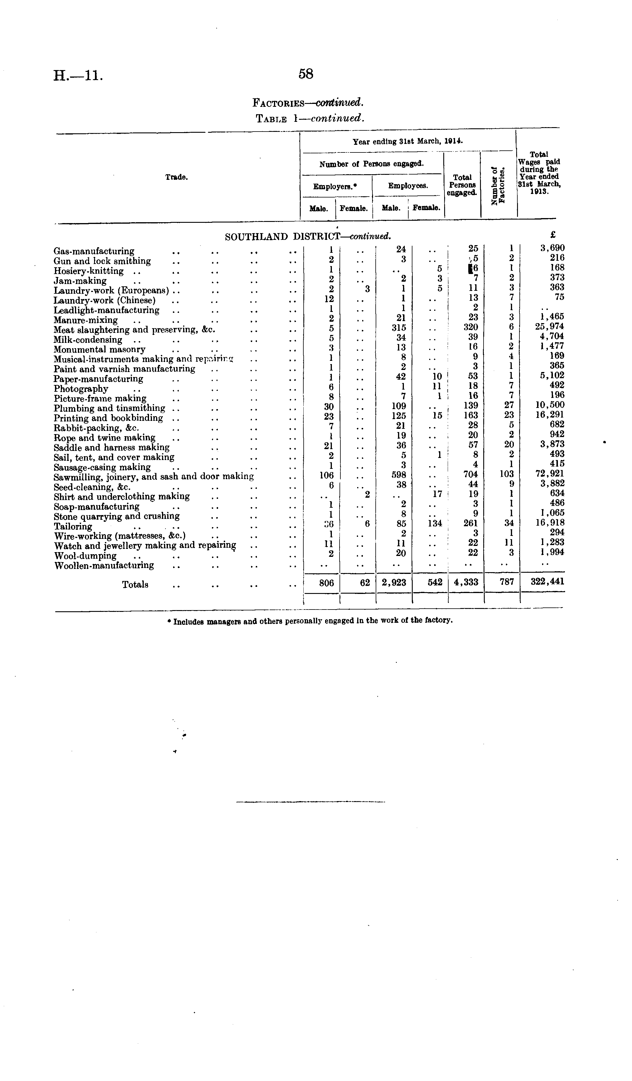 Trade. Year ending 31at March, 19H. Number of Persons engaged. - " Total a I Employers • Employees. Persons o o engaged. | g Male. Female. Male. : Female. Year ending 31st March, 19H. Total Wages paid during the Year ended 31st March, 1913. Employers. , SOUTHLAND D 8TRIC 1 — contim ',ed. £ Gas-manufacturing Gun and lock smithing Hosiery-knitting Jam-making Laundry-work (Europeans) .. Laundry-work (Chinese) Leadlight-rnanufacturing Manure-mixing Meat slaughtering and preserving, &c. Milk-condensing Monumental masonry Musical-instruments making and repairing Paint and varnish manufacturing Paper-manufacturing Photography Picture-frame making Plumbing and tinsmithing Printing and bookbinding Rabbit-packing, &c. Rope and twine making Saddle and harness making Sail, tent, and cover making Sausage-oaring making .. .. .. Sawmilling, joinery, and sash and door making Seed-cleaning, &e. Shirt and underclothing making Soap-manufacturing Stone quarrying and crushing Tailoring .. Wire-working (mattresses, &c.) Watch and jewellery making and repairing Wool-dumping Woollen-manufacturing I 2 1 2 2 12 1 2 5 5 :s 1 1 1 6 8 30 23 7 1 21 2 1 106 6 24 3 2 1 1 1 21 315 34 13 8 2 42 1 7 109 125 21 19 36 r> 3 598 38 "e 3 6 * * io n i 15 I 1 17 184 25 .5 11 13 2 23 320 39 16 9 3 53 18 16 139 163 28 20 57 8 4 704 44 19 3 9 261 3 22 22 1 2 1 2 3 7 1 3 6 1 2 4 1 1 7 7 27 23 5 2 20 2 1 103 9 1 1 1 34 1 11 3 3,690 216 168 373 363 75 "3 1,465 25,974 4,704 1,477 169 365 5.1(12 492 196 10,500 16,291 082 942 3,873 493 415 72,921 3,882 634 486 1,065 16,918 294 1,283 1,994 "2 2 8 85 2 11 20 1 1 :;•> 1 11 2 6 Totals 806 62 2,923 542 4,333 787 322,441 * Includes managers and others persoi illy engi ged in the work of ;he factory.