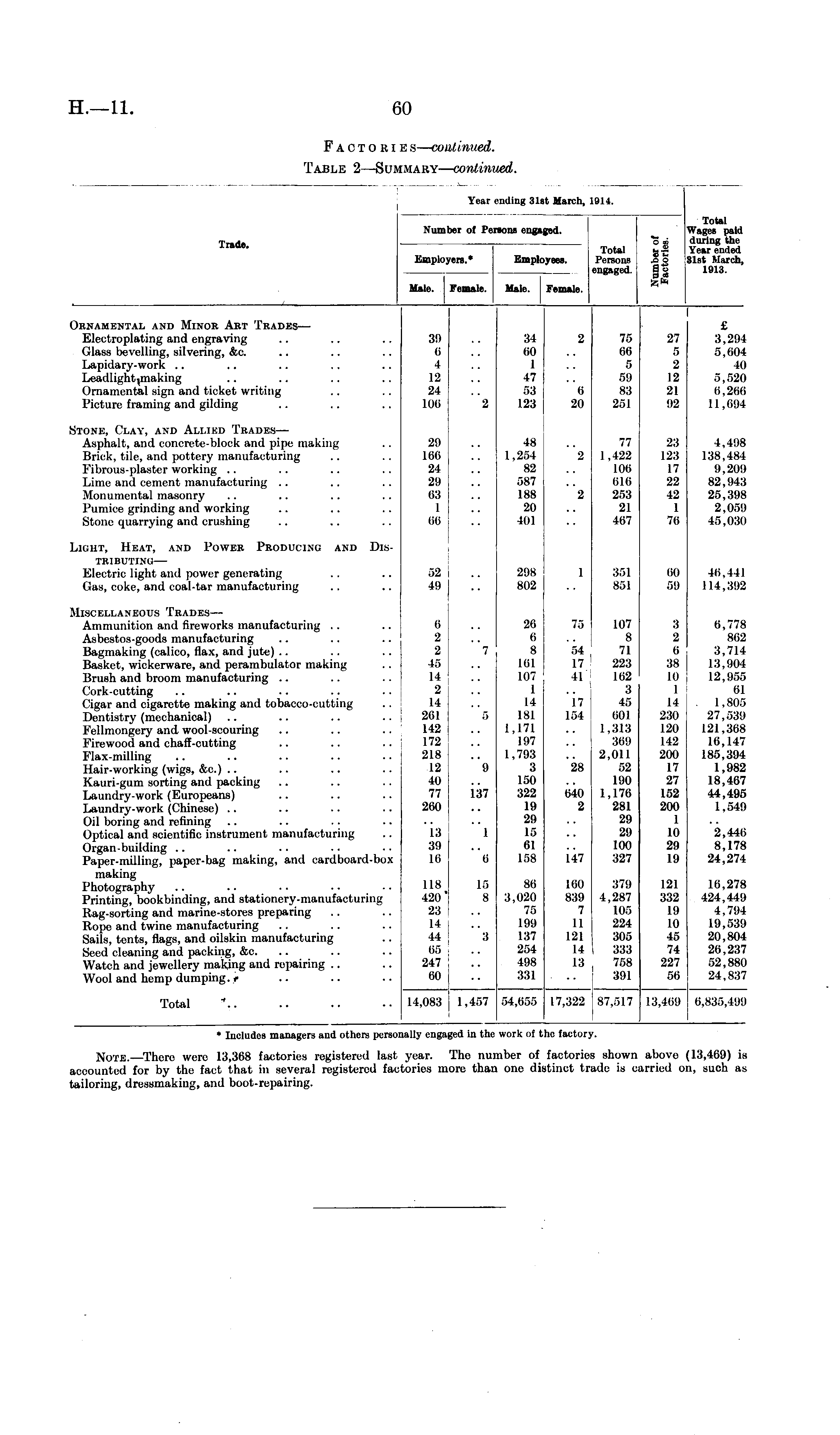 Year ending 31st March, 1914. Trade. Number of Persons engaged. Employers. , Employees Male. Female. Male. Fen Employees. Total ss-2 Persona x> o sngaged. g g Total Wages paid during the Year ended 31st March, 1913. Male. Female. Jrnamental and Minor Art Trades— Electroplating and engraving Glass bevelling, silvering, &c. Lapidary-work .. Leadlightwnaking Ornamental sign and ticket writing Picture framing and gilding 39 0 4 12 24 100 34 00 1 47 53 123 2 75 66 5 59 83 251 27 5 2 12 21 !)2 £ 3,294 5,004 40 5,520 0,266 I I ,<>!)» 2 20 Stone, Clay, and Allibd Trades — Asphalt, and concrete-block and pipe making Brick, tile, and pottery manufacturing Fibrous-plaster working .. Lime and cement manufacturing Monumental masonry I'11 mice grinding and working Stone quarrying and crushing 29 100 24 2!) 03 1 Bβ 48 1,254 82 587 188 20 401 "2 77 1,422 106 (>li> 2.-,:: 21 407 23 123 17 22 42 1 7(i 4,4'.)8 138,484 9,209 82,943 2.->.:i'.ts 2. (15! I Iβ, 030 2 LiuHT, Heat, and Power Producing and Distributing— Eleotrio light and power generating Gas, coke, and coal-tar manufacturing 298 802 :s.->i S.JI Hi.Ill H4.::!i2 52 49 1 00 59 Miscellaneous Trades — Ammunition and fireworks manufacturing Asbestos-goods manufacturing B&gmaking (calico, flax, and jute) Basket, wickerware, and perambulator making Brush and broom manufacturing Cork-cutting Cigar and cigarette making and tobacco-cutting Dentistry (mechanical) KrIlmongery and wool-scouring Kiirwood and chaff-cutting Flax-milling Hair-working (wigs, &c.) Kauri-gum sorting and packing Laundry-work (Europeans) Laundry-work (Chinese) Oil boring and refining Optical and scientific instrument manufacturing Organ-building Paper-milling, paper-bag making, and cardboard-box making Photography Printing, bookbinding, and stationery-manufacturing Rag-sorting and marine-stores preparing Rope and twine manufacturing Sails, tents, flags, and oilskin manufacturing Seed cleaning and packing, &c. Watch and jewellery making and repairing Wool and hemp dumping, r 6 2 2 4.") 14 2 14 201 142 172 218 12 40 77 260 "l 5 "9 137 20 0 8 Iβ] 107 1 14 181 1.171 197 1,793 3 150 322 l<) 2!l 1.-. 61 158 7.") 54 17 41 17 154 28 040 2 107 8 71 223 182 3 45 mil 1,313 :ii>!i 2,011 52 190 1,170 281 29 29 100 327 3 2 (i 38 10 1 14 230 120 142 200 17 27 152 200 1 10 29 19 0,778 862 3,714 13,1)04 12,955 01 . 1,805 27,539 121,368 16,147 185,394 1,982 18,467 44,495 I..5111 13 39 16 1 2,440 8,178 24,274 0 147 118 420 23 14 44 05 247 00 15 8 80 3,020 75 199 137 254 498 331 Kid 839 7 II 121 14 13 ;;7!i 4,287 Kir, 224 ;so.-> 333 758 391 121 332 19 10 45 74 227 56 lli.27S 424,449 4,7!J4 19,539 20,804 26,237 52,880 24,837 3 Total 14,083 1,457 54,055 17,322 87,517 13,409 0,835,49'J ♦ Includes managers and others personally engaj ;cd In tbe work of the factory Note. —There were 13,308 factories registered last year, .ccounted for by the fact that in several registered factories mi ailoriug, dressmaking, and boot-repairing. The nui ire that nber of factories . one distinct tr. shown above 1 kIc is carried 01 13,469) is 1, such as