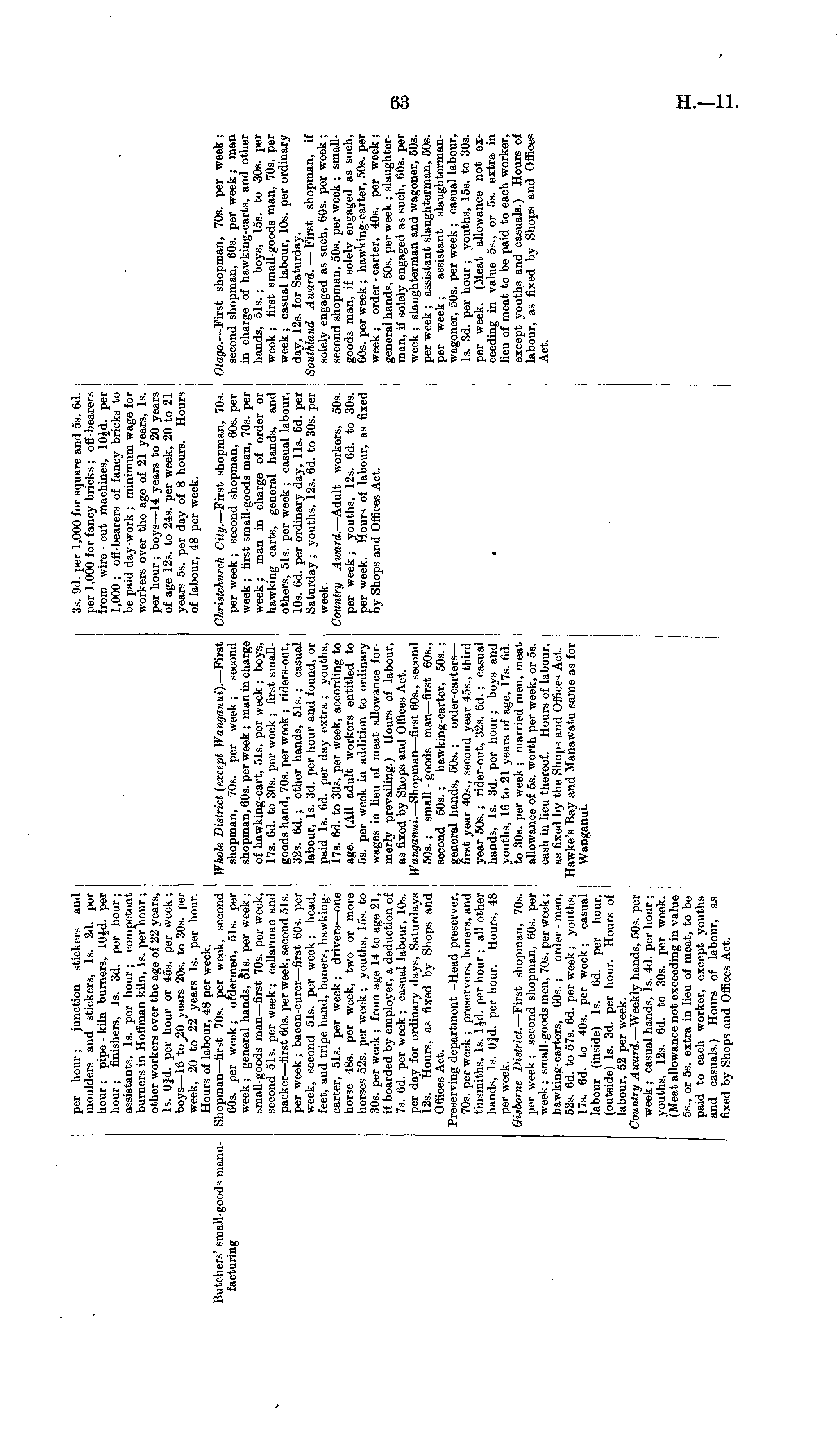 Butchers' small-goods manufacturing per hour; junction stickers and moulders and stickers, Is. 2d. per hour ; pipe - kiln burners, lOJd. per hour; finishers, Is. 3d. per hour; assietante, La per hour; competent burners in Hoffman kiln, Is. per hour ; other workers over the age of 22 years, l>. Ojd. per hour or 45s. per week; boys — 10 years 20s. to 30b. per week, 20 to 22 years Is. per hour. Hours of labour, 48 per week. Shopman —first 70s. per week, second 60s. per week; ofdermen, ols. per week ; general hands, ols. per week ; small-goods man —first 70s. per week, second ols. per week-; cellarman and packer —first 60s. per week, second 51s. per week ; bacon-curer —first 60s. per week, second 51s. per week; head, feet, and tripe hand, boners, hawkingcarter, 51s. per week ; drivers —one horse 48s. per week, two or more horse> .">2s. pel week ; youths, 15s. to 30s. per week ; from ago 14 to age 21, if boarded by employer, a deduction of 7s. 6d. per week ; casual labour, 10s. per day for ordinary days, Saturdays 12s. Hours, as fixed by Shops and Offices Act. Preserving department —Head preserver, 70s. per week ; preservers, boners, and tinsmiths, Is. lid. per hour ; all other hands, Is. Ofd. per hour. Hoots, 48 per week. Gisborne. District. —First shopman, 70s. per week ; second shopman, 60s. per week; small-goods men, 70s. per week ; hawking-carters, 60s. ; order - men, 52s. 6d. to 57s. 6d. per week ; youths, 17s. 6d. to 40s. per week; casual labour (inside) Is. 6d. per hour, (outside) Is. 3d. per hour. Hours of labour, 52 per week. Country Award. —Weekly hands, 50s. per week ; oaeoa] hands, Is. 4d. per hour ; youths, 12s. 6d. to 30s. per week. (Meat allowance not exceeding in value os., or extra in lieu of meat, to be paid to each worker, except youths and casuals.) Hours of labour, as fixed by Shops and Offices Act. Whole District [except Wanganui). —First shopman, 70s. per week; second shopman, 60s. per week ; man in charge of hawking-cart, ols. per week ; boys, 17s. 6d. to 30s. per week ; first smallgoods hand, 70s. per week ; riders-out, 32s. 6d. ; other hands, ols. ; casual labour, Is. 3d. per hour and found, or paid Is. 6d. per day extra ; youths, 17s. 6d. to 30s. per week, according to age. (All adult workers entitled to 5s. per week in addition to ordinary wages in lieu of meat allowance formerly prevailing.) Hours of labour, as fixed by Shops and Offices Act. Wanganui.— -Shopman —first 60s., second 50s. ; small - goods man —first tiOs., second 50s. ; hawking-carter, 50s. ; general hands, 50s. ; order-carters — first year 40s., second year 45s., third year 50s. ; rider-out, 32s. 6d. ; casual hands, 1 s. 3d. per hour; boys and youths, 16 to 21 years of age, 17s. (id. to 30s. per week ; married men, meat allowance of 5s. worth per week, or 5s. cash in lieu thereof. Hours of Labour, as fixed by the Shops and Offices Act. Hawke's Bay and Manawatu same as for Wanganui. 3s. 9d. per 1,000 lor square and 5s. 6d. per 1,000 for fancy bricks ; off-bearers from wire - cut machines, 10£d. per 1,000 ; off-bearers of fancy bricks to be paid day-work ; minimum wage for workers over the age of 21 years, Is. per hour ; boys — 14 years to 20 years of age 12s. to 24s. per week, 20 to 21 years 5s. per day of 8 hours. Hours of labour, 48 per week. Christchurch City. —First shopman, 70s. Otaijo. —First shopman, 70s. per week ; per week ; second shopman, 60s. per second shopman, 60s. per week ; man week ; first small-goods man, 70s. per in charge of hawking-carts, and other week ; man in charge of order or hands, 51s. ; boys, 15s. to 30s. per hawking carts, general hands, and week ; first small-goods man, 70s. per others, 51s. per week ; casual labour, week ; casual labour, 10s. per ordinary 10s. 6d. per ordinary day, 11s. 6d. per day, 12s. for Saturday. Saturday ; youths, 12s. 6d. to 30s. per Southland Award. —First shopman, if week. solely engaged as such, 60s. per week ; Country Award. —Adult workers, 50s. second shopman. 50s. per week ; smallper week ; youths, 12s. 0d. to 30s. goods man, if solely engaged as such, per week. Hours of labour, as fixed 60s. per week ; hawking-carter, 50s. per by Shops and Offices Act. week ; order - carter, 40s. per week ; general hands, 50s. per week ; slaughterman, if solely engaged as such, 60s. per week ; slaughterman and wagoner, 50s. per week ; assistant slaughterman, 50s. per week; assistant slaughtermanwagoner, 50s. per week ; casual labour, Is. 3d. per hour ; youths, 15s. to 30s. per week. (Meat allowance not ex- • ceeding in value 5s., or 5s. extra in lieu of meat to be paid to each worker, except youths and casuals.) Hours of labour, as fixed by Shops and Offices Act.