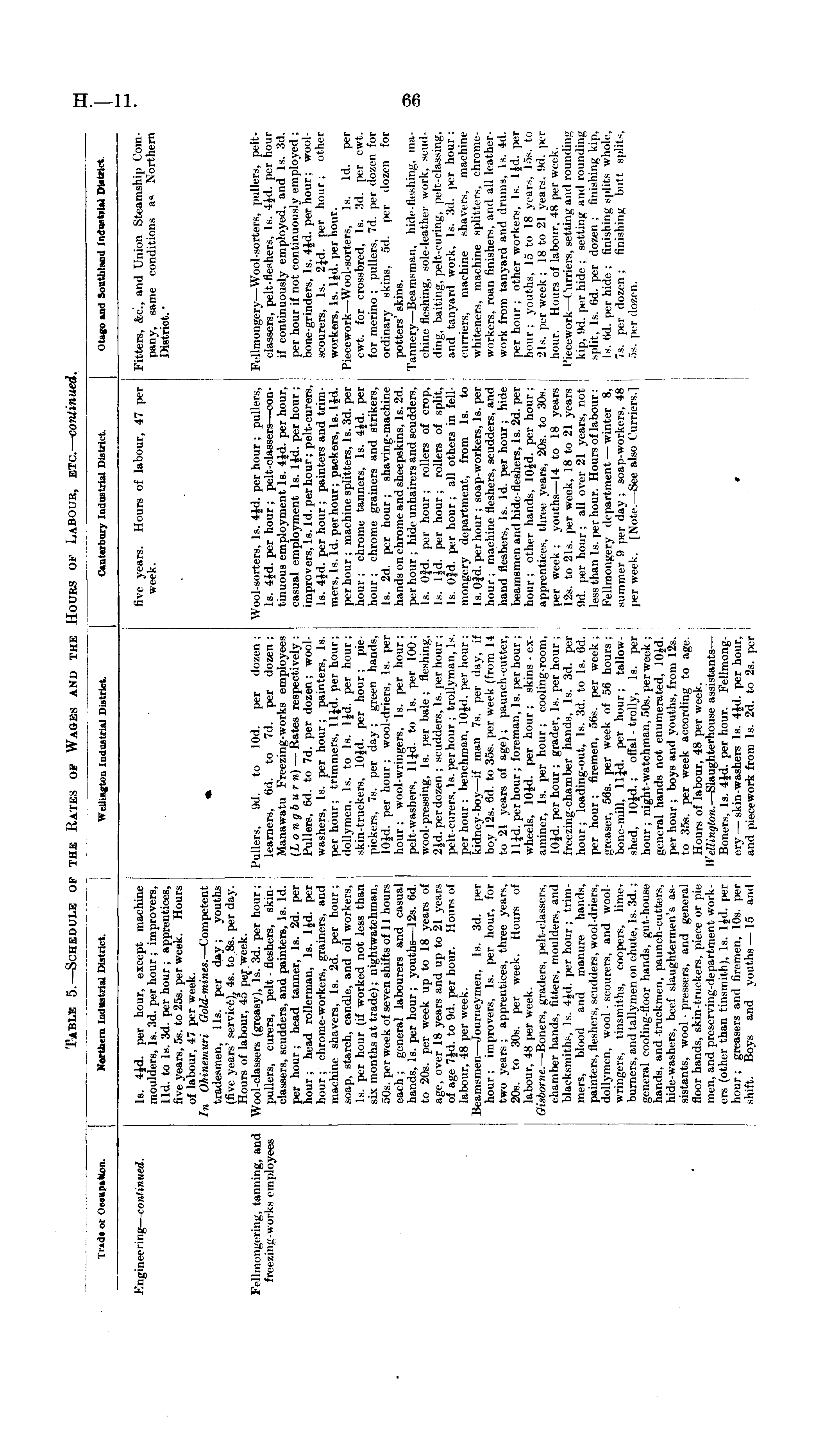 Tnda or OcoupiNon. Northirn Industrie District. Wellington Industrial District. Canterbury Industrial District. Otago and Southland Industrial District. Kngineering — continued. Is. 4£d. per hour, except machine moulders, Is. 3d. per hoar; improvers, lid. to Is. 3d. per hour; apprentices, five years, 5s. to 25s. per week. Hours of labour, 47 per week. In Ohinemuri Gold-mines. —Competent tradesmen, 11s. per day; youths (five years' service), 4s. to 8s. per day. Hours of labour, 4o per week. Wool-classers (greasy), Is. 3d. per hour ; pullers, curers, pelt - fleshers, skinclassers, scudders, and painters, Is. Id. per hour; head tanner, Is. 2d. per hour; head rollerman, Is. ljd. per hour ; chrome-workers, grainers, and machine shavers, Is. 2d. per hour; soap, starch, candle, and oil workers, Is. per hour (if worked not less than six months at trade); nightwatehman, 50s. per week of seven shifts of 1 1 hours each ; general labourers and casual hands, Is. per hour; youths —12s. 6d. to 20s. per week up to 18 years of age, over 18 years and up to 21 years of age 7Jd. to 9d. per hour. Hours of labour, 48 per week. Beamsmen — Journeymen, Is. 3d. per hour; improvers, Is. per hour, for two years ; apprentices, three years, 20s. to 30s. per week. Hours of labour, 48 per week. Gisbonie. —Boners, graders, pelt-classers. chamber hands, fitters, moulders, and blacksmiths, Is. 4Jd. per hour; trimmers, blood and manure hands, painters, tlcshers, scudders, wool-driers, dollymen, wool - scourers, and woolwringers, tinsmiths, coopers, limeburners, and tallymen on chute, Is. 3d.; general cooling-floor hands, gut-house hands, and truckmen, paunch-cutters, hide-washers, beef slaughtermen's assistants, wool - pressers, and general floor hands, skin-truckers, piece or pie men, and preserving-department workers (other than tinsmith), Is. ljd. per hour ; greasers and firemen, 10s. per shift. Boys and youths — 15 and rive years. Hours of labour, 47 ]kt Fitters, &c, and Union Steamship Coinweek, panv, same conditions as Northern District. Fellmongering, tanning, and freezing-works employees « Pullers, ltd. to IOd. per dozen : learners, tid. to 7d. per dozen : Manawatu Freezing- works employees (Long burn) — Rates respectively : Pullers, (id. to 7d. per dozen; woolwashers, Is. per hour; painters, l>. per hour; trimmers, lljd. per hour; dollymen. Is. to Is. ljd. per hour; skin-truckers, lojd. per hour; piepickers. 7s. per day; green hands, 10£d. per hour ; wool-driers, Is. per hour ; wool-wringers. 1 s. \>er hour ; ; pelt-washers, lljd. to Is. per 100; wool-pressing, Iβ. per bale; fleshing, 2Jd. per dozen ; scudders, Is. per hour : pelt-curers. Is. per hour : trotlyman, Is. per hour : benehman, 10'd. per hour ; kidney-boy — if man 7s. per day. if boy 12s. 6d. to 35s. per week (from 14 i to 21 years of age); paunch-cutter, lljd. per hour; foreman, Is. per hour ; wheels, 10£d. per hour ; skins - examiner, Is. per hour; cooling-room, lOJd. per hour ; grader, Is. per hour ; freezing-chamber hands, Is. 3d. per i hour; loading-out, Is. 3d. to Is. 6d. ; per hour; firemen, 56s. per week; j greaser, 56s. per week of 50 hours ; bone-mill, 11 jd. per hour; tallowshed, lOJd. ; offal - trolly, Is. per [ hour ; night-watchman, 50s. per week ; general hands not enumerated, lOJd. per hour ; boys and youths, from 12s. to 35s. per week according to age. Hours of labour, 48 per week. Wellington. —Slaughterhouse assistants — Boners, Is. 4£d. per hour. Fellmongery — skin-washers Is. 4$d. per hour, and piecework from Is. 2d. to 2s. per Wool-sorters. Is. 4Jd. per hour ; pullers, Fellmongery —Wool-sorters, pullers, peltIs. 4Jd. per hour; pelt-classers —con- elassers, pelt -fleshers. Is. 4jd. per hour tinuous employment Is. 4Jd. per hour, if continuously employed, and Is. 3d. casual employment Is. 1 Jd. per hour ; per hour if not continuously employed ; improvers. Is. Id.per hour; pelt-curers, bone-grinders, Is. 4Jd. per hour: woolIs. 41d. per hour ; painters and trim- scourers, Is. 2Jd. per hour; other mere, Iβ. Id. per hour; packers. Is. ljd. workers, Is. ljd. per hour. per hour ; machine splitters, Is. 3d. per Piecework —Wool-sorters. Is. Id. per hour ; chrome tanners, Is. 4Jd. per cwt. for crossbred, Is. 3d. per ewt. hour; chrome grainen and strikers. for merino; pullers, 7d. per dozen for Is. 2d. per hour ; shaving-machine ordinary skins, Sd. per dozen for hands on chrome and sheepskins, Is. 2d. potters' skins. per hour; hide unhaircrs and scudders, Tannery — Beameman, hide-fleshing, male. Ofd. per hour; rollers of crop, chine fleshing, sole-leather work. scadIs. I jd. per hour; rollers of split, ding, baiting, pelt-curinfi. pelt-classing, Is. 0|d. per hour; all others in fell- and lanyard work, Is. 3d. |kt hour: mongerv department, bom Is. to curriers, machine shavers, machine Iβ. Ojd. per hour ; soap- workers, Is. per whiteners, machine splitters, chromehour : machine fleshers. scudders. and workers, roan finishers, and all leatherhand fleshers. Is. Id. per hour; hide work from tanyard and drums. Is. 4d. beamsmen and hide-rleshers, Is. 2d. per per hour ; other workers. Is. lid. per hour; other hands, lOJd. per hour: hour; youths. 15 to 18 years, I5e. to apprentices, three years, 20s. to 30s. 21s. per week ; 18 to 21 years. 9d. per per week ; youths — 14 to 18 years hour. Hours of labour, 48 per week. 12s. to 21s. per week, 18 to 21 years Piecework — Curriers, setting and rounding 9d. per hour; all over 21 years, not kip, ltd. per hide ; setting and rounding less than Is. per hour. Hours of labour: split, Is. (id. per dozen; finishing kip, Fellmongerv department — winter 8. Iβ. ed. per hide ; finishing splits whole. summer !l per day : soap-workers, 48 7s. ]ier dozen ; finishing butt splits, per week. [Note. —See also Curriers.] ">s. per dozen. 9