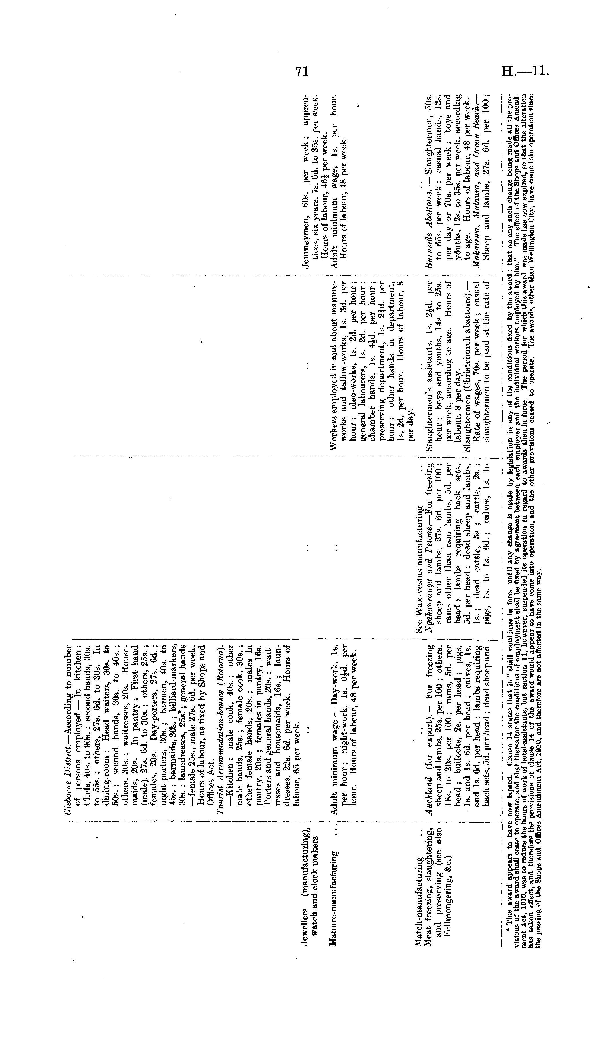 Jewellers (manufacturing), watch and clock makers Oisbome District. —According to number of persons employed — In kitchen: Chefs, 40s. to 90s. ; second hands. 30e. to ~)5s. ; others. 27s. 6d. to 30s. In dining-room : Head waiters, 30s. to 50s. : second hands, :(0s. to 40s. ; others, 30s. ; waitresses, 20s. Housemaids, 2()s. In pantry : First hand (male), 27s. (id. to 30s. ; others, 26e. : females. 20s. Day-porters, 27s. (id. : night-porters, 30s. ; barmen, 40s. to 46s. : barmaids, 30fc. ; billiard-markers, 30s. j laundresses. 2os*; general hands —female 2.5s., male 27s. (id. per week. Hours of labour, as fixed by Shops and " Offices Act. Tourist Arrommodation-houeet (Rotorua). —Kitchen : male cook, 40s. ; other male hands, 25s. ; female cook, 30s. ; other female hands, 20s. ; males in pantry, 20s. ; females in pantry, 16s. Porters and general hands, 20s. : waitresses and housemaids, 16s. ; laundresses, 22s. 6d. per week. Hours of labour, (>•"> per week. Journeymen, 60s. per week: apprentices, six years, 7s. (id. to .'!">s. per week. Hours of labour. 40J per week. Adult minimum wage — Day-work, Is. .. Workers employed in and about manure- Adult minimum wage, Iβ. per hour. per hour; night-work, Is. OJd. per works and tallow-works, Is. 3d. per Hours of labour. 48 per week. hour. Hours of labour, 48 per week. hour; oleo-works, Is. 2d. per hour; general labourers. Is. 2d. per hour; chamber hands. Is. 4Jd. per hour; preserving department. Is. 2}d. per hour ; other hands in department. Is. 2d. per hour. Hours of labour. S per day. Manure-manufacturing -Match-manufacturing Meat freezing, slaughtering, and preserving (see also Fellmongering, &c.) See Wax-vestas manufacturing Auckland (for export). — For freezing Ngahauranga mid Petone. —For freezing Slaughtermen's assistants, Is. 21d. per Burnside Abattoirs. — Slaughtermen, 50s. shee]) and lambs, 25s. per 100 ; others, sheep and lambs. 27s. (id. per 100; hour; boys and youths. 14s. to 2~>s. to (i."is. per week: casual hands. 12s. 18s. to 20s. per 100; rams, 5d. per ranis other than ram lambs. 5d. per per week, according to age. Hours of per day or 70s. per week: boys and head; bullocks, 2s. per head; pigs, bead > lambs requiring back sets. labour, 8 per day. youths. 12s. to 36e. per week, according ■ Is. and Is. (id. per head ; calves, Is. ">d. per head ; dead sheep and lambs. Slaughtermen (Chrietchurch abattoirs).- to age. Hours of labour. 48 per week. and Is. (id. per head ; lambs requiring Is. ; dead cattle. 5s. ; cattle, 2s. ; Rate of wages. 70s. per week : casual Mnhirt ini. Mataura, and Oreiin Bench. — back sets, 6d. per head; dead sheep and pigs. '*• to Iβ. (id.; calves, Is. to slaughtermen to be paid at the rate of Sheep and lambs, 27s. (id. per 100; * This award appears to liavt visions of the award shall cease to c ment Act, 1910, was to reduce the 1 has taken effect, and therefore the the passing of the Shops and Offices ! now lapsed. Clause 14 states that it " shall continue in force until any change is made by legislation in any of the conditions fixed by the award: that on any such change being made all the proiperate, and that thereafter the conditions of employment shall be fixed by agreement between each employer and the individual workers employed by him." Tlie effect of the Shops and Offices Amendlours of work of hotel-assistants, but section 11, however, suspended its operation in regard to awards then in force. The period for whieh this award was made lias now expired, so that the alteration t provisions of clause 14 of the award would appear to have come into operation, and the other provisions ceased to operate. The awards, other than Wellington City, have come into operation since i Amendment Act, 1910, and therefore are not affected in the same way.