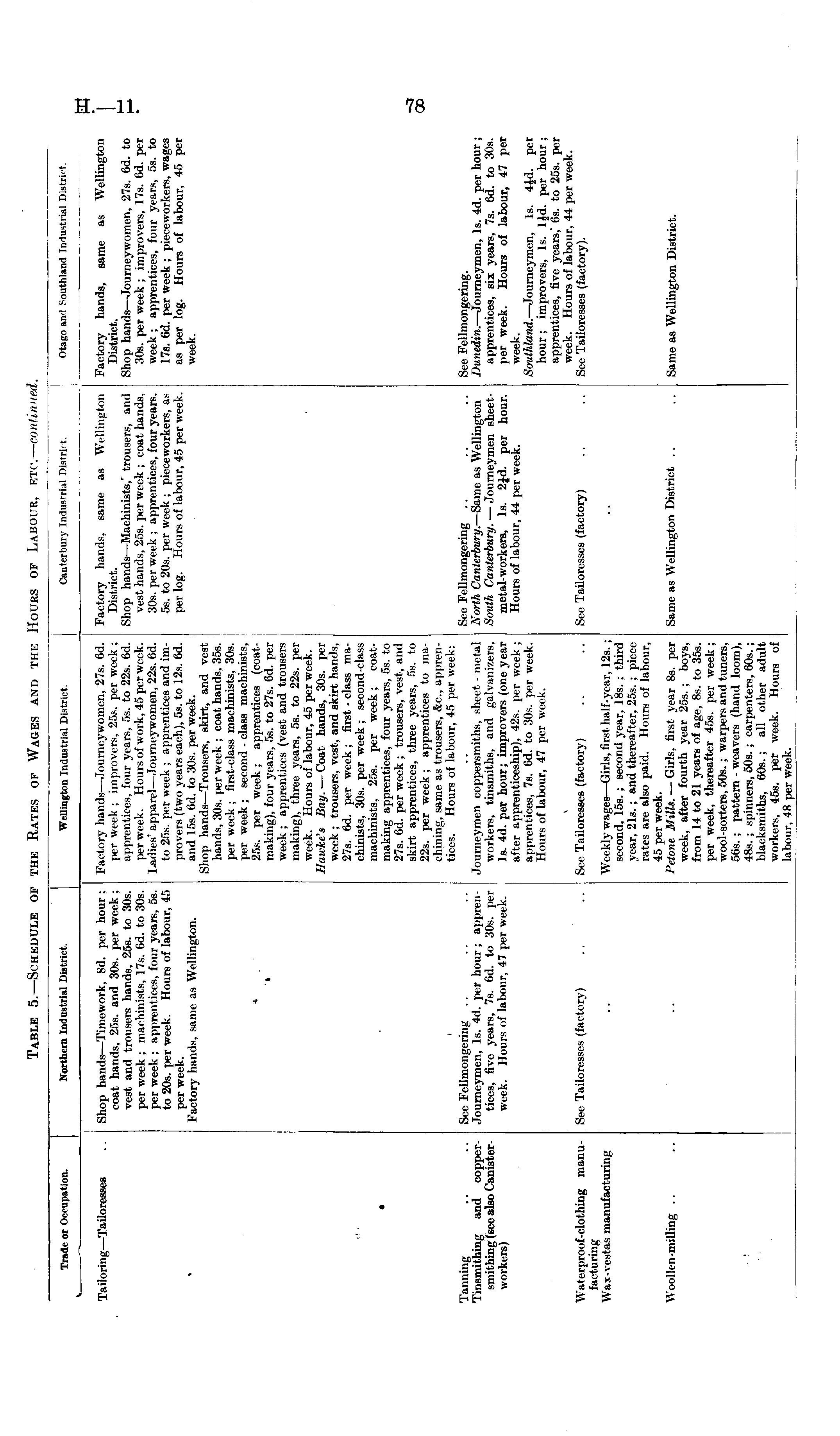 Trade or Occupation. Northern Industrial District. Wellington Industrial District. Canterbury Industrial Distri-t. Otago an'l Southland Industrial District. Tailoring —Tailoresses Shop hands —Timework, 8d. per hour : coat hands, 25s. and 30s. per week ; vest and trousers hands, 25s. to 30s. per week ; machinists, 17s. 6d. to 30s. per week : apprentices, four years, 5s. to 20s. per week. Hours of labour, 45 per week. Factor} , hands, same Bβ Wellington. Factory hands —Journeywomen, 27s. 6d. per week : improvers, 25s. per week : apprentices, four years, 5s. to 22s. 6d. per week. Hours of work. 4.j per week. Ladies' apparel —Journeywomen, 22s. 6d. to 2">s. per week ; apprentices and improvers (two years each), 5s. to 12s. (id. and 15s. 6d. to 30s. per week. Shop hands —Trousers, skirt, and vest hands, 30s. per week ; coat hands, 35s. per week : first-class machinists, 308. per week ; second - class machinists, 2.V. per week : apprentices (coatmaking), four years, 5s. to 27s. (id. per week ; apprentices (vest and trousers making), three years, 5s. to 22s. per week. Hours of labour, 45 per week. Howie's Bay. — Coat hands, 30s. per week ; trousers, vest, and skirt hands, 27s. 6d. per week : first - class machinists. 80s. per week : second-class machinists. 2Se, per week; coatmaking apprentices, four years, 5s. to 27s. 6d. per week ; trousers, vest, and skirt apprentices, three years, r>s. to 22s. per week ; apprentices to machining, same as trousers, tus., apprentices. Hours of labour, 45 per week: Factory hands, same as Wellington District. Shop hands —Machinists,' trousers, and vest hands, 25s. per week ; coat hands. 30s. per week ; apprentices, four years. 5s. to 20s. per week ; pieceworkers, as per log. Hours of labour, 45 per week. Factory hands, same as Wellington District. Shop hands —.Journeywomen, 27s. 6d. to 30s. per week ; improvers, 17s. 6d. per week ; apprentices, four years, 5s. to 17s. 6d. per week ; pieceworkers, wages as per log. Hours of labour, 45 per week. a % « Tanning Tinsmitliing and coppersmithing (see also Canisterworkers) See Fellmongering Journeymen, Is. 4d. per hour ; apprentices, five years, 7s. 6d. to 30s. per week. Hours of labour, 47 per week. Journeymen coppersmiths, sheet - metal worker.-, tinsmiths, and galvanizers, Is. 4d. per hour; improvers (one year after apprenticeship), 42s. per week ; apprentices. 7s. 6d. to 30s. per week. Hours of labour, 47 per week. See Fellmongering . . North Canterbury. —Same as Wellington South Canterbury. — Journeymen sheet-metal-workers, Is. 2Jd. per hour. Hours of labour, 44 per week. See Fellmongering. Dunedin.— Journeymen, Is. 4d. per hour ; apprentices, six years, 7s. 6d. to 30s. per week. Hours of labour, 47 per week. Southland. —Journeymen, Is. 4Jd. per hour; improvers, Is. ljd. per hour; apprentices, five years,' 6s. to 25s. per week. Hours of labour, 44 per week. See Tailoresses (factory). Waterproof-clothing manufacturing Wax-vestas manufacturing See Tailoresses (factory) Sec Tailoresses (factory) See Tailoresses (factory) Woollen-milling .. Weekly wages —Girls, first half-year, 12s. ; second, i~>s. ; second year, 18s. ; third year. 21s. ; and thereafter. 2.~>s. ; piece rates are also paid. Hours of labour, 45 per week. Petone Mills. — Girls, first year 8s. per week, after fourth year 25s. ; boys, from 14 to 21 years of age, 8s. to 35s. per week, thereafter 45s. per week ; wool-sorters, 50s. ; warpers and tuners. 56s.; pattern - weavers (hand loom), 48s. ; spinners, 50s. ; carpenters. 60s. ; blacksmiths, 60s. ; all other adult workers, 45s. per week. Hours of labour, 48 per week. Same as Wellington District Same as Wellington District.