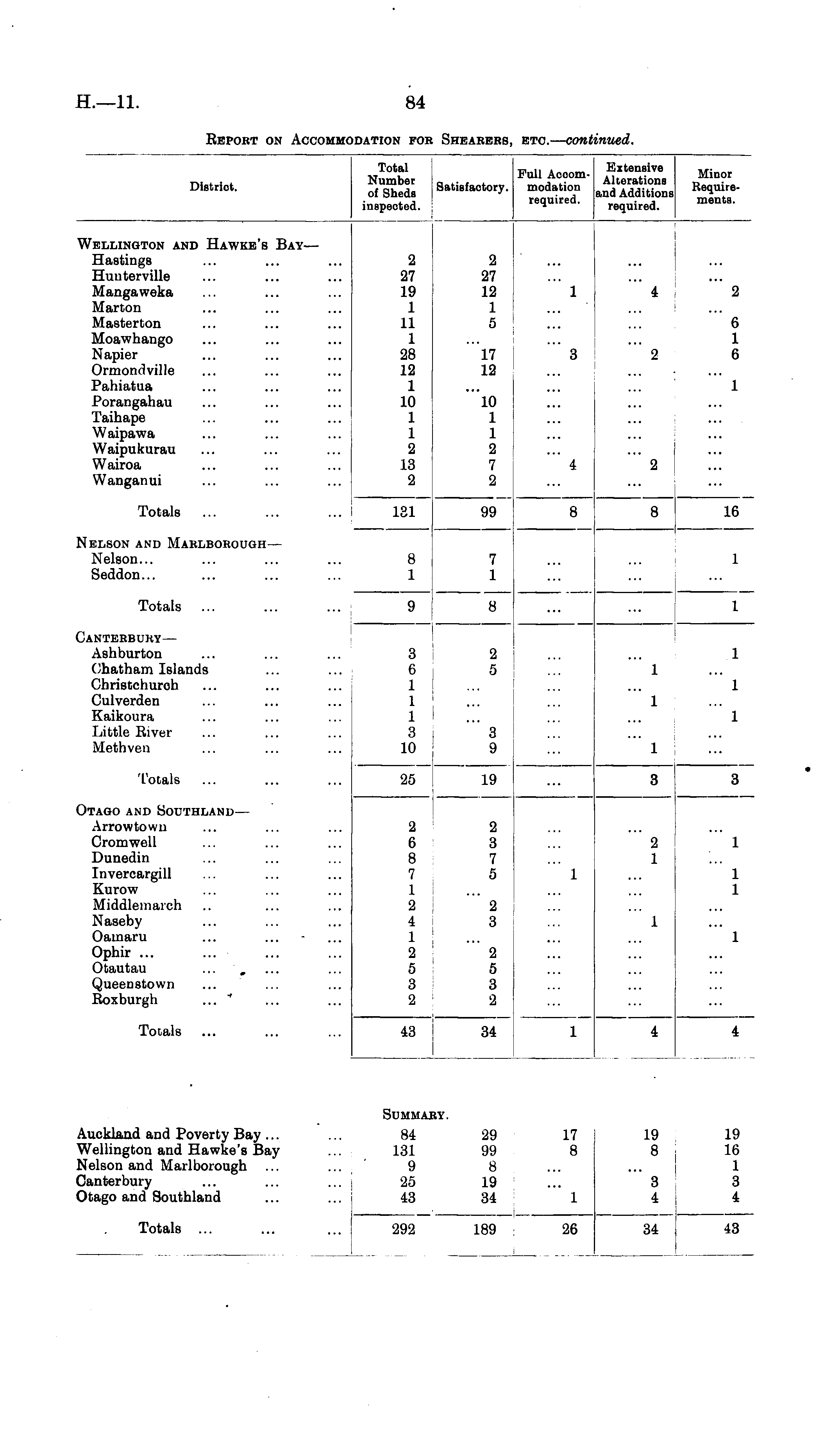 District. Total Number of Sheds inspected. Satisfactory. Pull Acoommodation required. Extensive Alterations and Additions required. Minor Requirements. Wellington and Hawke's Bay— Hastings Hunterville Manga weka Marton Masterton Moawhango Napier Ormondville Pahiatua Porangahau Taihape Waipawa Waipukurau Wairoa Wanganui 2 27 19 1 11 1 28 12 1 10 1 1 2 13 2 2 27 19 1 11 1 28 12 1 10 1 1 2 13 2 2 27 12 1 5 17 12 "lO 1 1 2 7 2 2 27 12 1 5 17 12 " 1 " 3 " 4 1 3 4 " 2 - 2 6 1 6 ' 1 10 1 1 2 7 2 4 2 Totals ... 131 131 99 1)9 8 16 Nelson and Maelborough— Nelson... Seddon... 8 1 8 1 7 1 7 1 1 Totals ... 9 8 Canterbury— Ashburton Chatham Islands Christchurch Culverden Kaikoura Little River Methven 3 6 1 ! 2 5 " 3 9 2 5 1 1 1 1 ... 1 3 9 1 Totals 25 25 19 19 Otago and Southland — Arrowtown Cromwell Dunedin Invercargill Kurow Middleniarch Naseby Oainaru Ophir ... Otautau ... , Queenstown Roxburgh ... ' 2 6 8 7 1 2 4 1 2 5 3 2 2 6 H 7 1 2 4 1 2 5 3 •2 2 3 7 5 2 3 " 2 5 3 2 2 3 7 5 2 3 1 1 2 1 1 1 1 1 1 2 5 3 2 Totals ... 43 43 34 34 1 4 4 SUMMABY. 19 8 " 3 4 19 16 1 3 4 Auckland and Poverty Bay ... Wellington and Hawke's Bay Nelson and Marlborough Canterbury Otago and Southland 84 131 9 25 43 29 99 8 19 34 17 8 ' 1 Totals ... 292 292 189 189 26 26 34 43