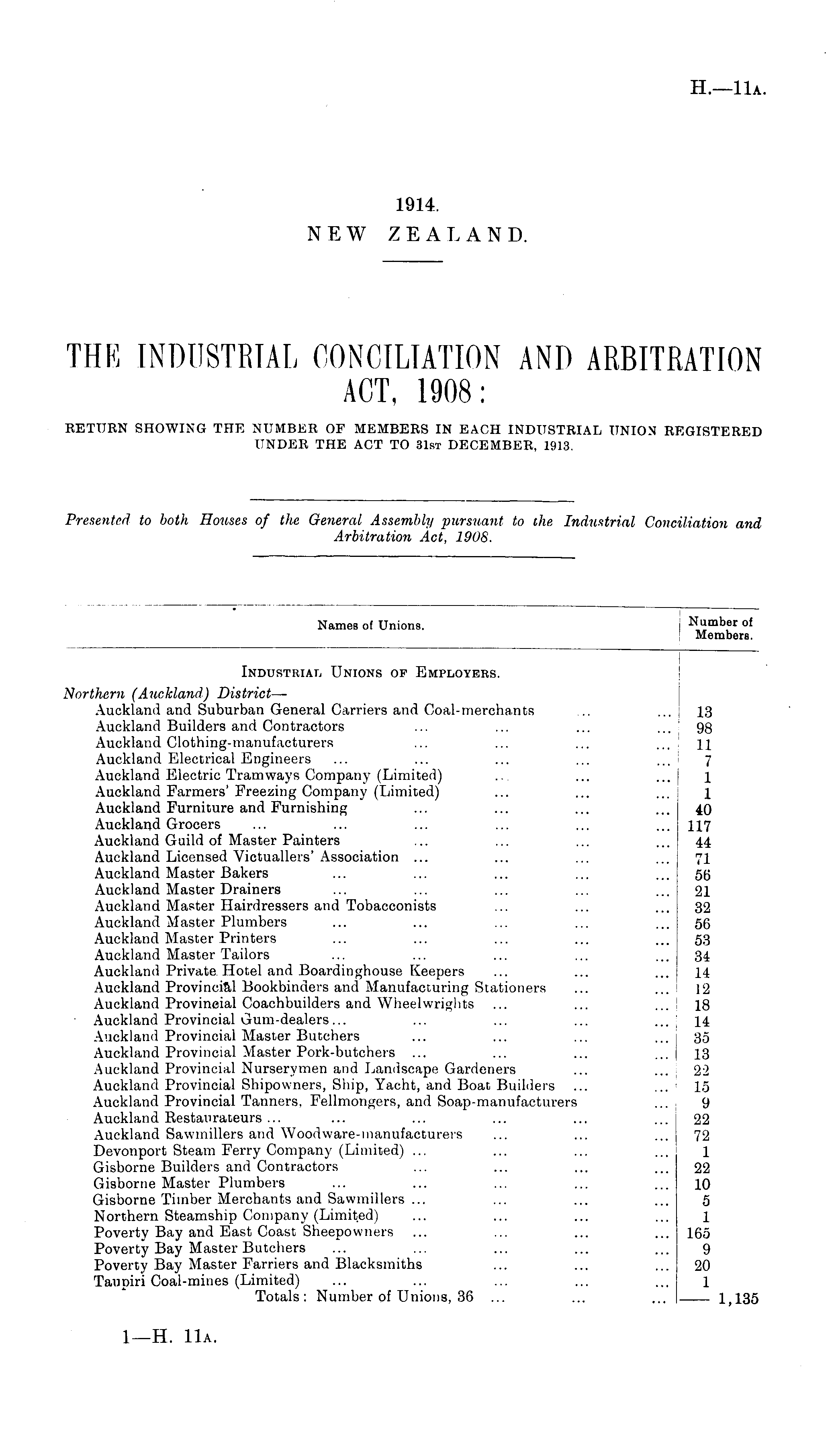 THE INDUSTRIAL CONCILIATION AND ARBITRATION ACT, 1908: RETURN SHOWING THE NUMBER OF MEMBERS IN EACH INDUSTRIAL UNION REGISTERED UNDER THE ACT TO 31st DECEMBER, 1913.