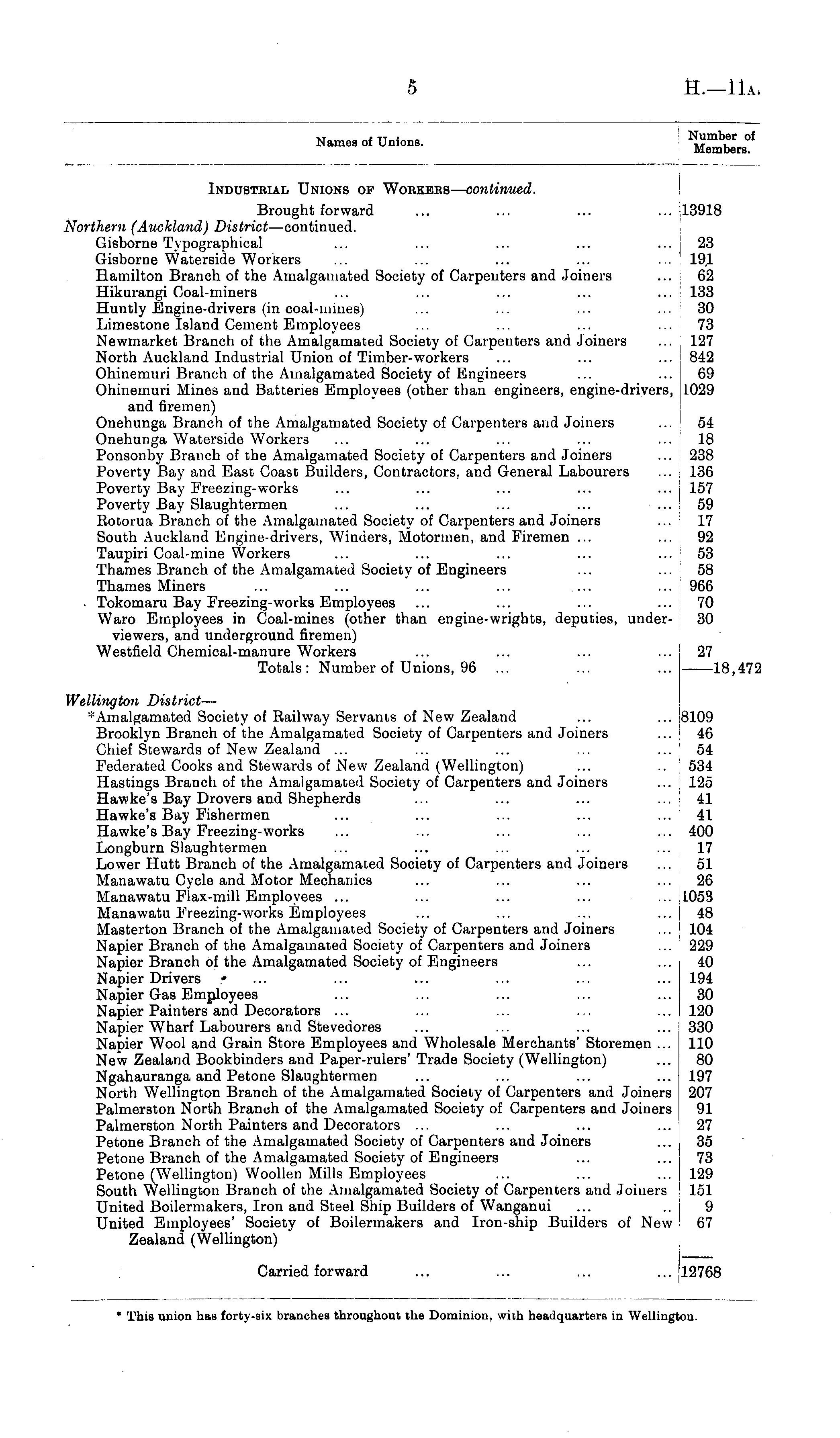 Names of Unions. Number ol Members. Industrial Unions op Workers— continued. Brought forward Northern (Auckland) District —continued. Gisborne Typographical Gisborne Waterside Workers Hamilton Branch of the Amalgamated Society of Carpenters and Joiners ... j Hikurangi Goal-miners ... ... ... ... ... Huntly Engine-drivers (in coal-mines) Limestone Island Cement Employees Newmarket Branch of the Amalgamated Society of Carpenters and Joiners North Auckland Industrial Union of Timber-workers ... ... ... Ohinemuri Branch of the Amalgamated Society of Engineers Ohiuemuri Mines and Batteries Employees (other than engineers, engine-drivers, and firemen) Onehunga Branch of the Amalgamated Society of Carpenters and Joiners ... Onehunga Waterside Workers Ponsonby Branch of the Amalgamated Society of Carpenters and Joiners Poverty Bay and East Coast Builders, Contractors, and General Labourers ... Poverty Bay Freezing-works ... ... ... ... ... Poverty Bay Slaughtermen ... ... ... ... ■ ... Eotorua Branch of the Amalgamated Society of Carpenters and Joiners ... South Auckland Engine-drivers, Winders, Motormen, and Firemen ... ... Taupiri Coal-mine Workers ... ... ... ... ... Thames Branch of the Amalgamated Society of Engineers Thames Miners ... ... ... ... ... ... ■ Tokomaru Bay Freezing-works Employees Waro Employees in Coal-mines (other than engine-wrights, deputies, underviewers, and underground firemen) Westfield Chemical-manure Workers Totals: Number of Unions, 96 13918 23 19.1 62 133 30 73 127 842 69 1029 54 18 238 136 157 59 17 92 53 58 966 70 30 27 18,472 Wellington District — * Amalgamated Society of Railway Servants of New Zealand ... ... I Brooklyn Branch of the Amalgamated Society of Carpenters and Joiners ... Chief Stewards of New Zealand ... Federated Cooks and Stewards of New Zealand (Wellington) ... .. j Hastings Branch of the Amalgamated Society of Carpenters and Joiners Hawke's Bay Drovers and Shepherds Hawke's Bay Fishermen Hawke's Bay Freezing-works Longburn Slaughtermen Lower Hutt Branch of the Amalgamated Society of Carpenters and Joiners Manawatu Cycle and Motor Mechanics Manawatu Flax-mill Employees ... ... ... ... ... Manawatu Freezing-works Employees ... ... ... ... : Masterton Branch of the Amalgamated Society of Carpenters and Joiners Napier Branch of the Amalgamated Society of Carpenters and Joiners Napier Branch of the Amalgamated Society of Engineers Napier Drivers * Napier Gas Employees Napier Painters and Decorators ... Napier Wharf Labourers and Stevedores Napier Wool and Grain Store Employees and Wholesale Merchants' Storemen ... New Zealand Bookbinders and Paper-rulers' Trade Society (Wellington) Ngahauranga and Petone Slaughtermen North Wellington Branch of the Amalgamated Society of Carpenters and Joiners Palmerston North Branch of the Amalgamated Society of Carpenters and Joiners ! Palmerston North Painters and Decorators ... ... ... ... Petone Branch of the Amalgamated Society of Carpenters and Joiners Petone Branch of the Amalgamated Society of Engineers Petone (Wellington) Woollen Mills Employees South Wellington Branch of the Amalgamated Society of Carpenters and Joiners United Boilermakers, Iron and Steel Ship Builders of Wanganui United Employees' Society of Boilermakers and Iron-ship Builders of New Zealand (Wellington) 8109 46 54 534 125 41 41 400 17 51 26 1053 48 104 229 40 194 30 120 330 : 110 80 197 207 91 27 35 73 129 151 9 67 Carried forward ... ... ... ... ; 12768 * This union has forty-six branches throughout the Dominion, with headquarters in Wellingt( * This union has forty-six branches throughout the Dominion, wiih headi ;on.