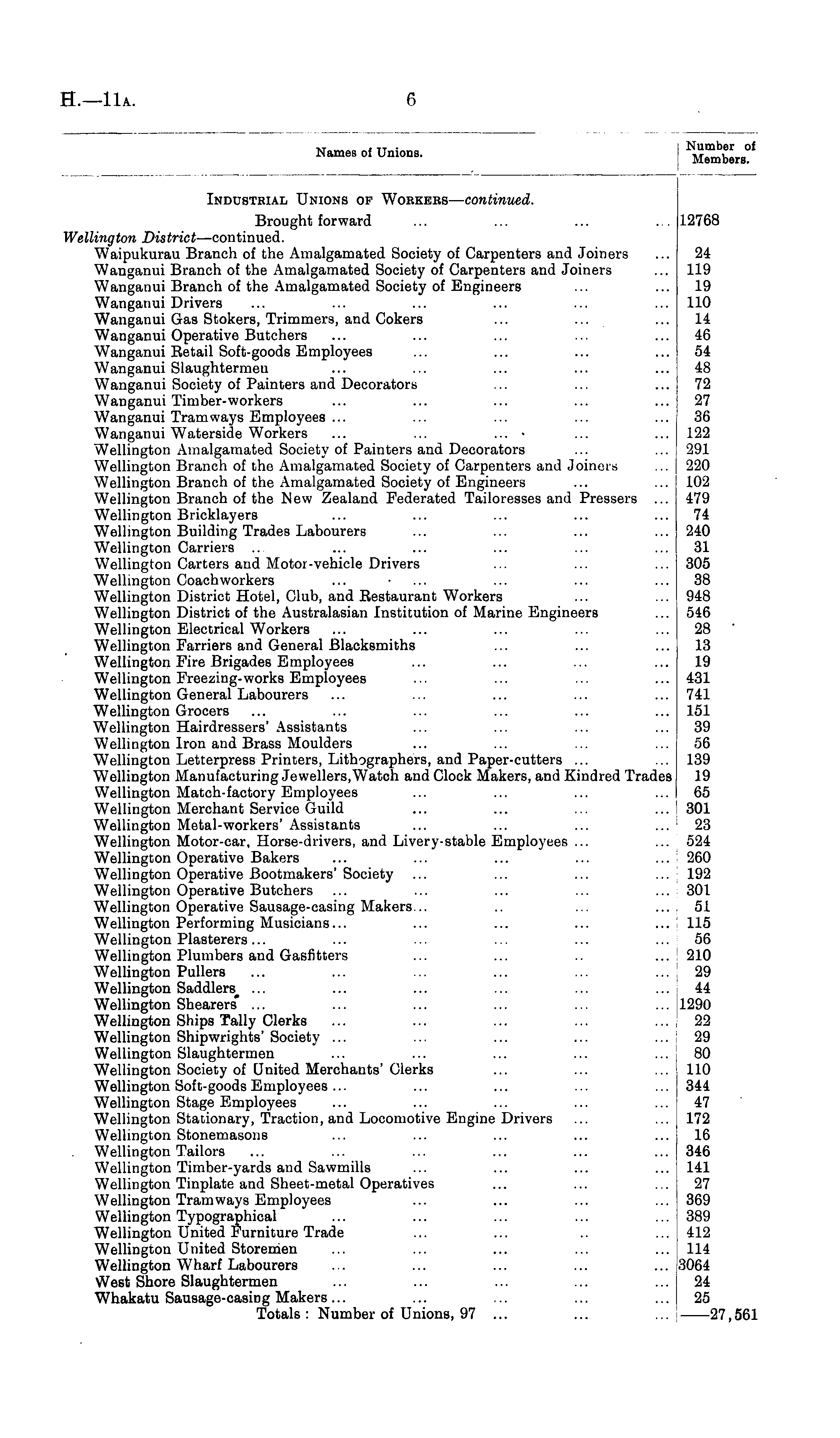 Names of Unions. dumber ol Members. Industrial Unions op Workers— continued. 1! Brought forward Wellington District —continued. Waipukurau Branch of the Amalgamated Society of Carpenters and Joiners Wanganui Branch of the Amalgamated Society of Carpenters and Joiners Wanganui Branch of the Amalgamated Society of Engineers Wanganui Drivers Wanganui Gas Stokers, Trimmers, and Cokers ... ... Wanganui Operative Butchers Wanganui Eetail Soft-goods Employees Wanganui Slaughtermen Wanganui Society of Painters and Decorators Wanganui Timber-workers Wanganui Tramways Employees ... Wanganui Waterside Workers ... ... ... • Wellington Amalgamated Society of Painters and Decorators Wellington Branch of the Amalgamated Society of Carpenters and Joinois Wellington Branch of the Amalgamated Society of Engineers Wellington Branch of the Mew Zealand Federated Tailoresses and Pressers ... Wellington Bricklayers Wellington Building Trades Labourers Wellington Carriers .. Wellington Carters and Motor-vehicle Drivers Wellington Coach workers ... • ... Wellington District Hotel, Club, and Eestaurant Workers Wellington District of the Australasian Institution of Marine Engineers Wellington Electrical Workers Wellington Farriers and General Blacksmiths Wellington Fire Brigades Employees Wellington Freezing-works Employees Wellington General Labourers Wellington Grocers Wellington Hairdressers' Assistants Wellington Iron and Brass Moulders Wellington Letterpress Printers, Lithographers, and Paper-cutters ... Wellington Manufacturing Jewellers,Watch and Clock Makers, and Kindred Trades Wellington Match-factory Employees Wellington Merchant Service Guild Wellington Metal-workers' Assistants Wellington Motor-car, Horse-drivers, and Livery-stable Employees ... Wellington Operative Bakers Wellington Operative Bootmakers'Society Wellington Operative Butchers Wellington Operative Sausage-casing Makers... Wellington Performing Musicians... Wellington Plasterers... Wellington Plumbers and Gasfitters Wellington Pullers Wellington ... Wellington Shearers ... Wellington Ships Tally Clerks Wellington Shipwrights' Society ... Wellington Slaughtermen Wellington Society of United Merchants' Clerks Wellington Soft-goods Employees ... Wellington Stage Employees Wellington Stationary, Traction, and Locomotive Engine Drivers Wellington Stonemasons Wellington Tailors Wellington Timber-yards and Sawmills Wellington Tinplate and Sheet-metal Operatives Wellington Tramways Employees Wellington Typographical Wellington United Furniture Trade Wellington United Storemen Wellington Wharf Labourers West Shore Slaughtermen Whakatu Sausage-casing Makers... Totals: Number of Unions, 97 ... 12768 24 119 19 110 14 46 54 48 72 27 36 122 291 220 L02 479 74 240 31 305 38 948 546 28 • 13 19 431 741 151 39 56 139 19 65 301 23 524 260 192 301 51 115 56 210 29 44 1290 22 29 80 110 344 47 172 16 346 141 27 369 389 412 114 3064 24 25 27,561