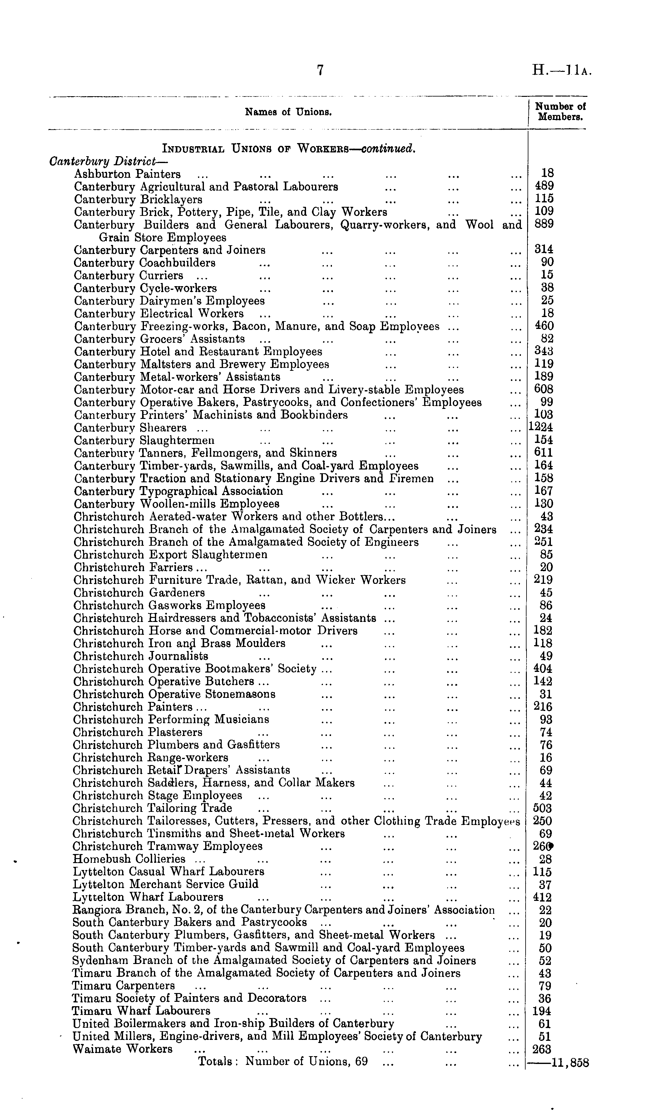 Names of Unions. Number of Members. Industrial Unions of Workers— continued. 'anterbury District — Ashburton Painters Canterbury Agricultural and Pastoral Labourers Canterbury Bricklayers Canterbury Brick, Pottery, Pipe, Tile, and Clay Workers Canterbury Builders and General Labourers, Quarry-workers, and Wool and Grain Store Employees Canterbury Carpenters and Joiners Canterbury Coachbuilders Canterbury Curriers ... Canterbury Cycle-workers Canterbury Dairymen's Employees Canterbury Electrical Workers Canterbury Freezing-works, Bacon, Manure, and Soap Employees ... Canterbury Grocers' Assistants Canterbury Hotel and Restaurant Employees Canterbury Maltsters and Brewery Employees Canterbury Metal-workers' Assistants Canterbury Motor-car and Horse Drivers and Livery-stable Employees Canterbury Operative Bakers, Pastrycooks, and Confectioners' Employees Canterbury Printers' Machinists and Bookbinders Canterbury Shearers ... Canterbury Slaughtermen Canterbury Tanners, Fellmongers, and Skinners Canterbury Timber-yards, Sawmills, and Coal-yard Employees Canterbury Traction and Stationary Engine Drivers and Firemen ... Canterbury Typographical Association Canterbury Woollen-mills Employees Christchurch Aerated-water Workers and other Bottlers... Christchurch Branch of the Amalgamated Society of Carpenters and Joiners ... Christchurch Branch of the Amalgamated Society of Engineers Christchurch Export Slaughtermen Christchurch Farriers ... Christchurch Furniture Trade, Rattan, and Wicker Workers Christchurch Gardeners Christchurch Gasworks Employees Christchurch Hairdressers and Tobacconists'Assistants ... Christchurch Horse and Commercial-motor Drivers Ohristchurch Iron and Brass Moulders Christchurch Journalists Christchurch Operative Bootmakers' Society ... Christchurch Operative Butchers ... Christchurch Operative Stonemasons Christchurch Painters ... Christchurch Performing Musicians Christchurch Plasterers Christchurch Plumbers and Gasfitters Christchurch Range-workers Christchurch Retail" Drapers' Assistants Christchurch Saddlers, Harness, and Collar Makers Christchurch Stage Employees Christchurch Tailoring Trade Christchurch Tailoresses, Cutters, Pressers, and other Clothing Trade Employees Christchurch Tinsmiths and Sheet-metal Workers Christchurch Tramway Employees Homebush Collieries ... Lyttelton Casual Wharf Labourers Lyttelton Merchant Service Guild Lyttelton Wharf Labourers Rangiora Branch, No. 2, of the Canterbury Carpenters and Joiners' Association South Canterbury Bakers and Pastrycooks ... South Canterbury Plumbers, Gasfitters, and Sheet-metal Workers ... South Canterbury Timber-yards and Sawmill and Coal-yard Employees Sydenham Branch of the Amalgamated Society of Carpenters and Joiners Timaru Branch of the Amalgamated Society of Carpenters and Joiners Timaru Carpenters Timaru Society of Painters and Decorators ... Timaru Wharf Labourers United Boilermakers and Iron-ship Builders of Canterbury United Millers, Engine-drivers, and Mill Employees' Society of Canterbury Waimate Workers Totals: Number of Unions, 69 18 489 115 109 889 314 90 15 38 25 18 460 82 343 119 189 608 99 103 1224 154 611 164 158 167 130 43 234 251 85 20 219 45 86 24 182 118 49 404 142 31 216 93 74 76 16 69 44 42 503 250 69 260 28 115 37 412 22 20 19 50 52 43 79 36 194 61 51 263 11,85!