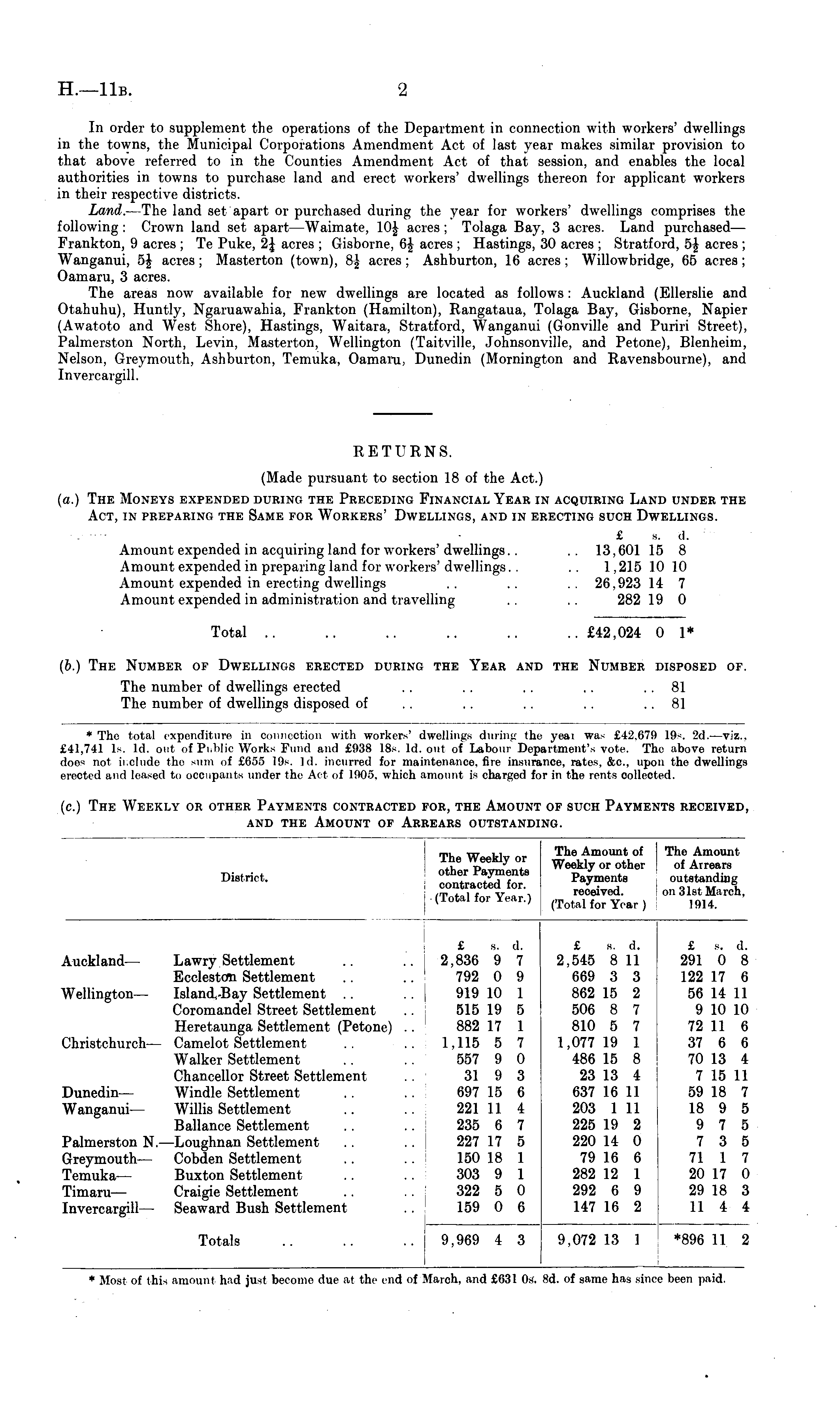 * The total expenditure in connection with workers' dwellings during the yeai was £42.679 19s. 2d. —viz., £41,741 Is. Id. out of Piiblic Works Fund and £938 18s. Id. out of Labour Department's vote. The above return does not include the. sum of £655 19s. Id. incurred for maintenance, fire insurance, rates, &c, upon the dwellings erected and leased to occupants under the Act of 1905, which amount is oharged for in the rents oollected.
