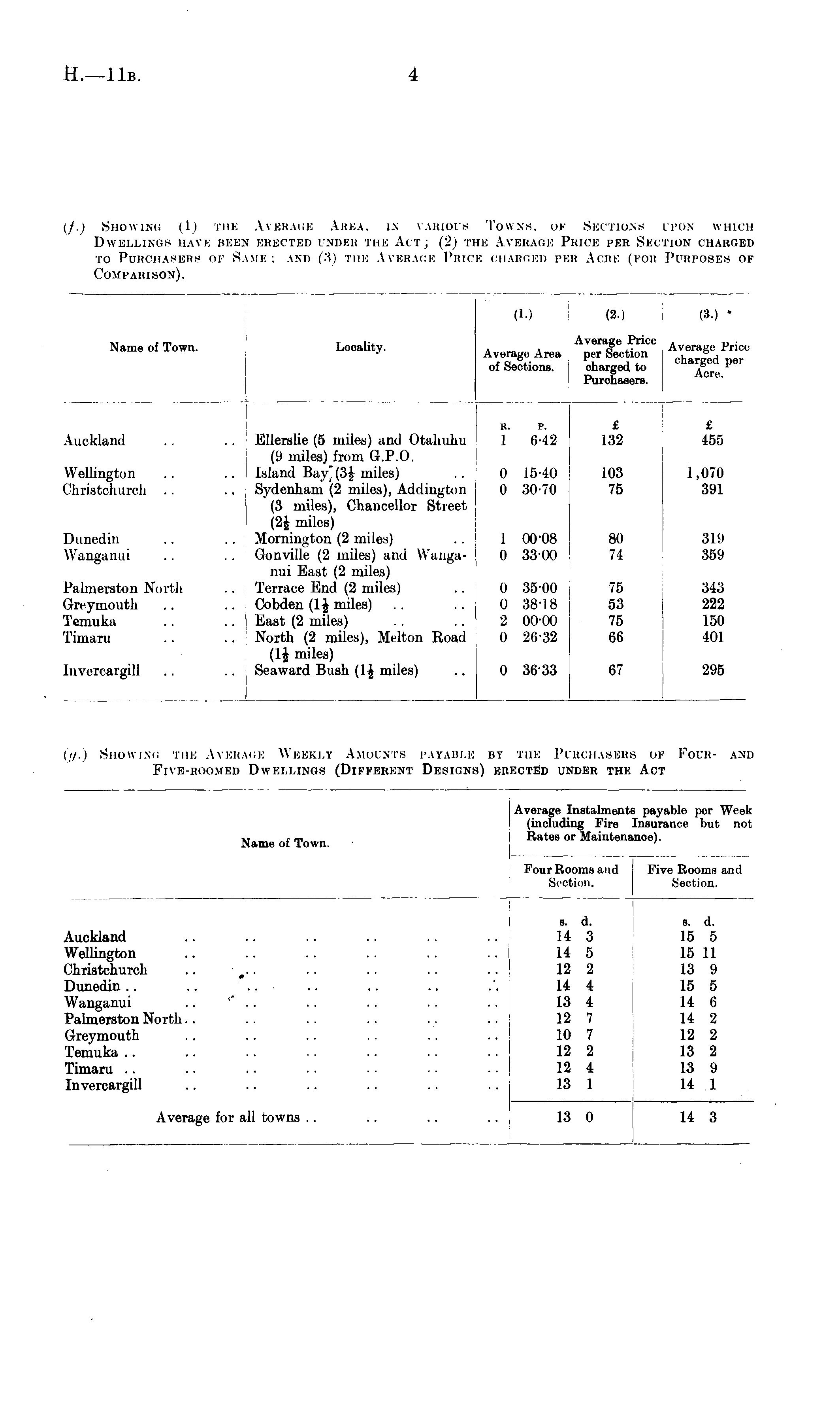 (f.) Showing (1) the Average Area, in various Towns, of Sections upon which Dwellings have been erected under the Act; (2) the Average Price per Section charged to Purchasers of Same; and (3) the Average Price charged per Acre (for Purposes of Comparison).