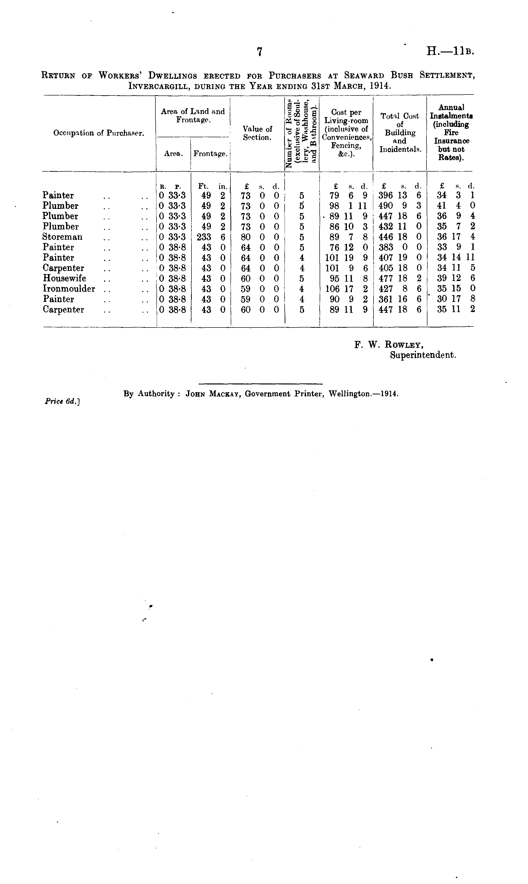 Return of Workers' Dwellings erected for Purchasers at Seaward Bush Settlement, Invercargill, during the Year ending 31st March, 1914.