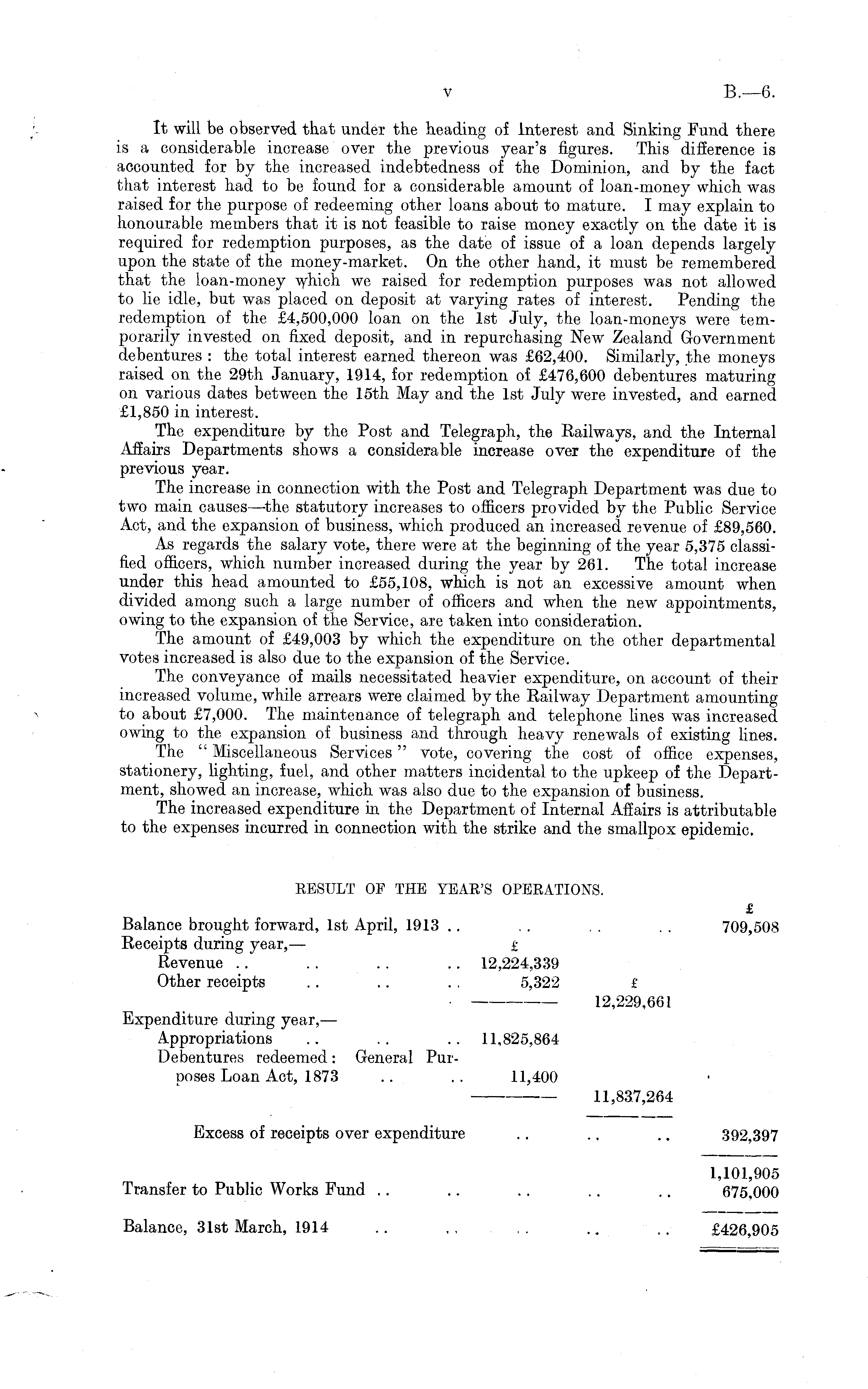 It will be observed that under the heading of Interest and Sinking Fund there is a considerable increase over the previous year's figures. This difference is accounted for by the increased indebtedness of the Dominion, and by the fact that interest had to be found for a considerable amount of loan-money which was raised for the purpose of redeeming other loans about to mature. I may explain to honourable members that it is not feasible to raise money exactly on the date it is required for redemption purposes, as the date of issue of a loan depends largely upon the state of the money-market. On the other hand, it must be remembered that the loan-money which we raised for redemption purposes was not allowed to lie idle, but was placed on deposit at varying rates of interest. Pending the redemption of the £4,500,000 loan on the Ist July, the loan-moneys were temporarily invested on fixed deposit, and in repurchasing New Zealand Government debentures : the total interest earned thereon was £62,400. Similarly, the moneys raised on the 29th January, 1914, for redemption of £476,600 debentures maturing on various dates between the 15th May and the Ist July were invested, and earned £1,850 in interest. The expenditure by the Post and Telegraph, the Railways, and the Internal Affairs Departments shows a considerable increase over the expenditure of the previous year. The increase in connection with the Post and Telegraph Department was due to two main causes —the statutory increases to officers provided by the Public Service Act, and the expansion of business, which produced an increased revenue of £89,560. As regards the salary vote, there were at the beginning of the year 5,375 classified officers, which number increased during the year by 261. The total increase under this head amounted to £55,108, which is not an excessive amount when divided among such a large number of officers and when the new appointments, owing to the expansion of the Service, are taken into consideration. The amount of £49,003 by which the expenditure on the other departmental votes increased is also due to the expansion of the Service. The conveyance of mails necessitated heavier expenditure, on account of their increased volume, while arrears were claimed by the Railway Department amounting to about £7,000. The maintenance of telegraph and telephone lines was increased owing to the expansion of business and through heavy renewals of existing lines. The " Miscellaneous Services" vote, covering the cost of office expenses, stationery, lighting, fuel, and other matters incidental to the upkeep of the Department, showed an increase, which was also due to the expansion of business. The increased expenditure in the Department of Internal Affairs is attributable to the expenses incurred in connection with the strike and the smallpox epidemic. RESULT OF THE YEAR'S OPERATIONS. £ Balance brought forward, Ist April, 1913 .. . . . . . . 709,508 Receipts during year,— £ Revenue .. .. . . .. 12,224,339 Other receipts . . .. . . 5,322 £ • 12,229,661 Expenditure during year, — Appropriations .. .. .. 11,825,864 Debentures redeemed : General Purposes Loan Act, 1873 .. .. 11,400 11,837,264 Excess of receipts over expenditure .. .. .. 392,397 1,101,905 Transfer to Public Works Fund .. .. . . .. .. 675,000 Balance, 31st March, 1914 .. , , , . .. ~ £426,905