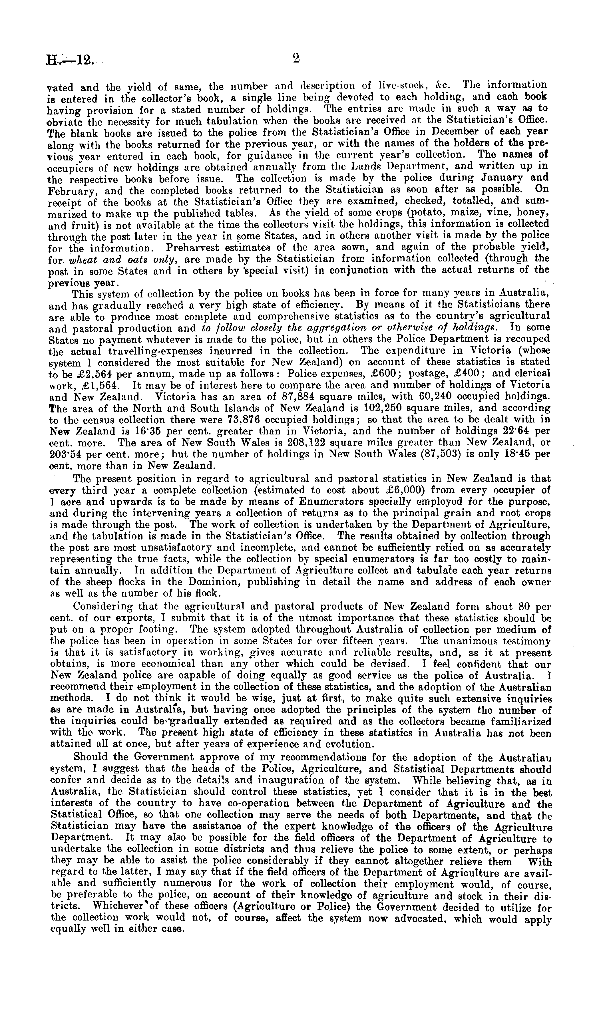 vated and the yield of same, the number and description of live-stock, &c. The information is entered in the collector's book, a single line being devoted to each holding, and each book having provision for a stated number of holdings. The entries are made in such a way as to obviate the necessity for much tabulation when the books are received at the Statistician's Office. The blank books are issued to the police from the Statistician's Office in December of each year along with the books returned for the previous year, or with the names of the holders of the previous year entered in each book, for guidance in the current year's collection. The names of occupiers of new holdings are obtained annually from the hands Department, and written up in the respective books before issue. The collection is made by the police during January and February, and the completed books returned to the Statistician as soon after as possible. On receipt of the books at the Statistician's Office they are examined, checked, totalled, and summarized to make up the published tables. As the yield of some crops (potato, maize, vine, honey, and fruit) is not available at the time the collectors visit the holdings, this information is collected through the post later in the year in some States, and in others another visit is made by the police for the information. Preharvest estimates of the area sown, and again of the probable yield, for wheat and oats only, are made by the Statistician from information collected (through the post in some States and in others by "special visit) in conjunction with the actual returns of the previous year. This system of collection by the police on books has been in force for many years in Australia, and has gradually reached a very high state of efficiency. By means of it the Statisticians there are able to produce most complete and comprehensive statistics as to the country's agricultural and pastoral production and to follow closely the aggregation or otherwise of holdings. In some States no payment whatever is made to the police, but in others the Police Department is recouped the actual travelling-expenses incurred in the collection. The expenditure in Victoria (whose system I considered the most suitable for New Zealand) on account of these statistics is stated to be £2,564 per annum, made up as follows: Police expenses, £600; postage, £400; and clerical work, £1,564. It may be of interest here to compare the area and number of holdings of Victoria and New Zealand. Victoria has an area of 87,884 square miles, with 60,240 occupied holdings. The area of the North and South Islands of New Zealand is 102,250 square miles, and according to the census collection there were 73,876 occupied holdings; so that the area to be dealt with in New Zealand is 16"35 per cent, greater than in Victoria, and the number of holdings 2264 per cent. more. The area of New South Wales is 208,122 square miles greater than New Zealand, or 20354 per cent, more; but the number of holdings in New South Wales (87,503) is only 18"45 per cent, more than in New Zealand. The present position in regard to agricultural and pastoral statistics in New Zealand is that every third year a complete collection (estimated to cost about £6,000) from every occupier of 1 acre and upwards is to be made by means of Enumerators specially employed for the purpose, and during the intervening years a collection of returns as to the principal grain and root crops is made through the post. The work of collection is undertaken by the Department of Agriculture, and the tabulation is made in the Statistician's Office. The results obtained by collection through the post are most unsatisfactory and incomplete, and cannot be sufficiently relied on as accurately representing the true facts, while the collection by special enumerators is far too costly to maintain annually. In addition the Department of Agriculture collect and tabulate each year returns of the sheep flocks in the Dominion, publishing in detail the name and address of each owner as well as the number of his flock. Considering that the agricultural and pastoral products of New Zealand form about 80 per cent, of our exports, I submit that it is of the utmost importance that these statistics should be put on a proper footing. The system adopted throughout Australia of collection per medium of the police has been in operation in some States for over fifteen years. The unanimous testimony is that it is satisfactory in working, gives accurate and reliable results, and, as it at present obtains, is more economical than any other which could be devised. I feel confident that our New Zealand police are capable of doing equally as good service as the police of Australia. I recommend their employment in the collection of these statistics, and the adoption of the Australian methods. Ido not think it would be wise, just at first, to make quite such extensive inquiries as are made in Australfa, but having once adopted the principles of the system the number of the inquiries could be-gradually extended as required and as the collectors became familiarized with the work. The present high state of efficiency in these statistics in Australia has not been attained all at once, but after years of experience and evolution. Should the Government approve of my recommendations for the adoption of the Australian system, I suggest that the heads of the Police, Agriculture, and Statistical Departments should confer and decide as to the details and inauguration of the system. While believing that, as in Australia, the Statistician should control these statistics, yet I consider that it is in the best interests of the country to have co-operation between the Department of Agriculture and the Statistical Office, so that one collection may serve the needs of both Departments, and that the Statistician may have the assistance of the expert knowledge of the officers of the Agriculture Department. It ma