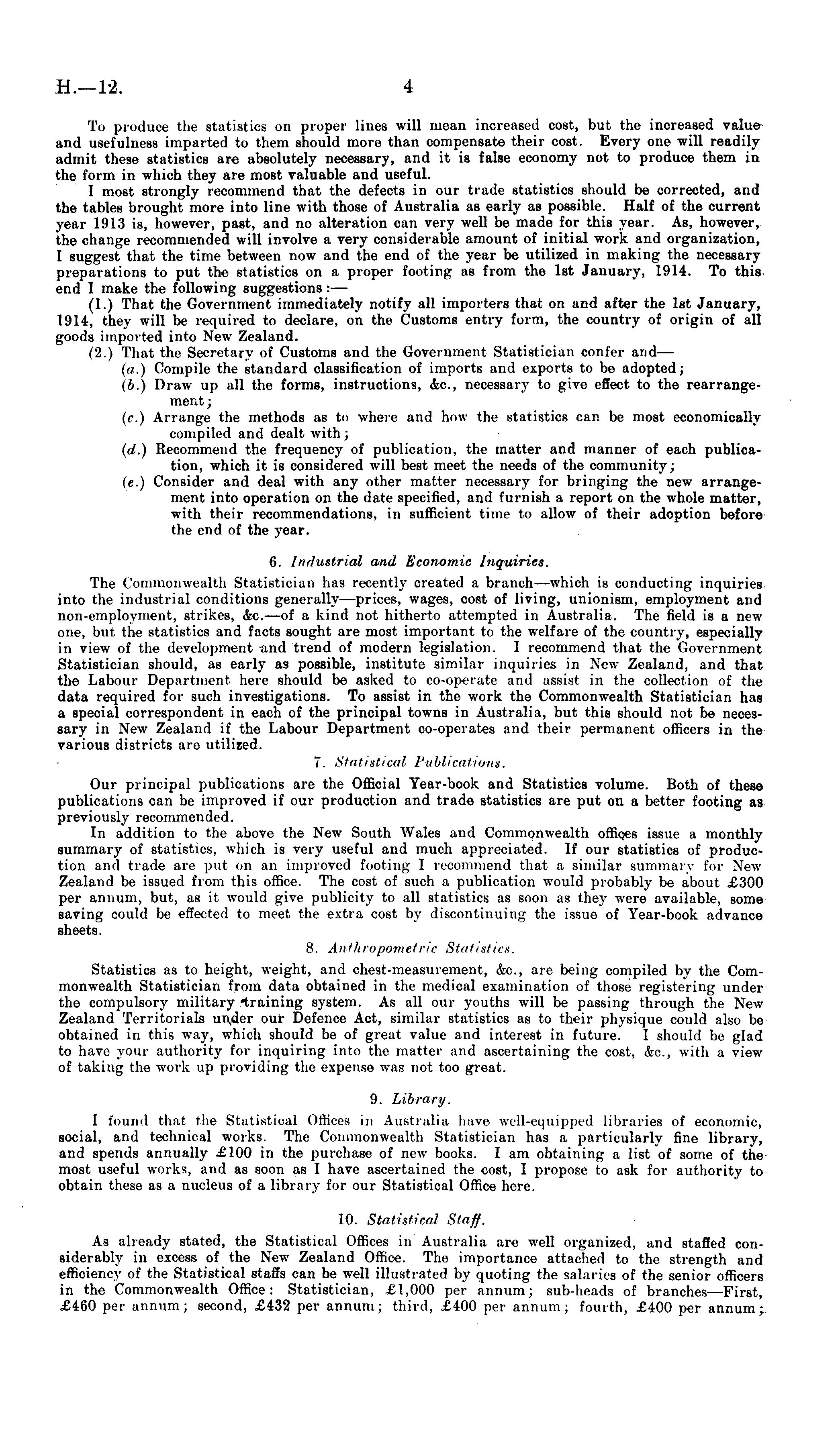 To produce the statistics on proper lines will mean increased cost, but the increased value and usefulness imparted to them should more than compensate their cost. Every one will readily admit these statistics are absolutely necessary, and it is false economy not to produce them in the form in which they are most valuable and useful. I most strongly recommend that the defects in our trade statistics should be corrected, and the tables brought more into line with those of Australia as early as possible. Half of the current year 1913 is, however, past, and no alteration can very well be made for this year. As, however, the change recommended will involve a very considerable amount of initial work and organization, I suggest that the time between now and the end of the year be utilized in making the necessary preparations to put the statistics on a proper footing as from the Ist January, 1914. To this end I make the following suggestions : — (1.) That the Government immediately notify all importers that on and after the Ist January, 1914, they will be required to declare, on the Customs entry form, the country of origin of all goods imported into New Zealand. (2.) That the Secretary of Customs and the Government Statistician confer and — (a.) Compile the standard classification of imports and exports to be adopted; (b.) Draw up all the forms, instructions, &c, necessary to give effect to the rearrangement ; (c.) Arrange the methods as to where and how the statistics can be most economically compiled and dealt with ; (d.) Recommend the frequency of publication, the matter and manner of each publication, which it is considered will best meet the needs of the community; (c.) Consider and deal with any other matter necessary for bringing the new arrangement into operation on the date specified, and furnish a report on the whole matter, with their recommendations, in sufficient time to allow of their adoption before the end of the year. 6. Industrial and Economic Inquiries. The Commonwealth Statistician has recently created a branch —which is conducting inquiries into the industrial conditions generally —prices, wages, cost of living, unionism, employment and non-employment, strikes, &c. —of a kind not hitherto attempted in Australia. The field is a new one, but the statistics and facts sought are most important to the welfare of the country, especially in view of the development and trend of modern legislation. I recommend that the Government Statistician should, as early as possible, institute similar inquiries in New Zealand, and that the Labour Department here should be asked to co-operate and assist in the collection of the data required for such investigations. To assist in the work the Commonwealth Statistician has a special correspondent in each of the principal towns in Australia, but this should not be necessary in New Zealand if the Labour Department co-operates and their permanent officers in the various districts are utilized. 7. Statistical Publications. Our principal publications are the Official Year-book and Statistics volume. Both of these publications can be improved if our production and trade statistics are put on a better footing a3 previously recommended. In addition to the above the New South Wales and Commonwealth offices issue a monthly summary of statistics, which is very useful and much appreciated. If our statistics of production and trade are put on an improved footing I recommend that a similar summary for New Zealand be issued from this office. The cost of such a publication would probably be about £300 per annum, but, as it would give publicity to all statistics as soon as they were available, some saving could be effected to meet the extra cost by discontinuing the issue of Year-book advance sheets. 8. Anthropometric Statistics. Statistics as to height, weight, and chest-measurement, &c., are being compiled by the Commonwealth Statistician from data obtained in the medical examination of those registering under the compulsory military -training system. As all our youths will be passing through the New Zealand Territorials under our Defence Act, similar statistics as to their physique could also be obtained in this way, which should be of great value and interest in future. I should be glad to have your authority for inquiring into the matter and ascertaining the cost, &c, with a view of taking the work up providing the expense was not too great. 9. Library. I found that the Statistical Offices in Australia have well-equipped libraries of economic, social, and technical works. The Commonwealth Statistician has a particularly fine library, and spends annually £100 in the purchase of new books. I am obtaining a list of some of the most useful works, and as soon as I have ascertained the cost, I propose to ask for authority to obtain these as a nucleus of a library for our Statistical Office here. 10. Statistical Staff. As already stated, the Statistical Offices in Australia are well organized, and staffed considerably in excess of the New Zealand Office. The importance attached to the strength and efficiency of the Statistical staffs can be well illustrated by quoting the salaries of the senior officers in the Commonwealth Office: Statistician, £1,000 per annum; sub-heads of branches—First, £460 per annum; second, £432 per annum; third, £400 per annum; fourth, £400 per annum;