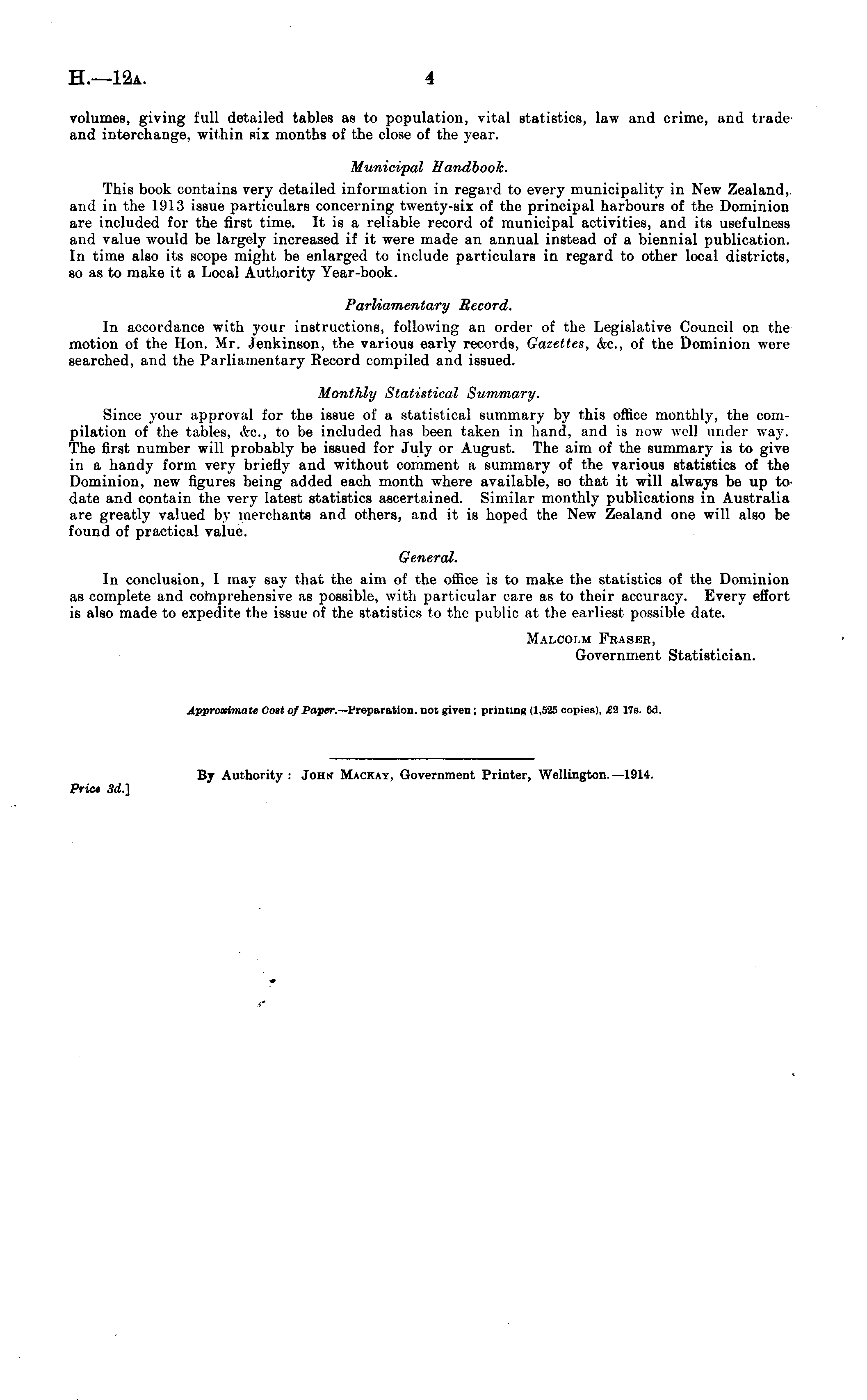 volumes, giving full detailed tables as to population, vital statistics, law and crime, and trade and interchange, within six months of the close of the year. Municipal Handbook. This book contains very detailed information in regard to every municipality in New Zealand, and in the 1913 issue particulars concerning twenty-six of the principal harbours of the Dominion are included for the first time. It is a reliable record of municipal activities, and its usefulness and value would be largely increased if it were made an annual instead of a biennial publication. In time also its scope might be enlarged to include particulars in regard to other local districts, so as to make it a Local Authority Year-book. Parliamentary Record. In accordance with your instructions, following an order of the Legislative Council on the motion of the Hon. Mr. Jenkinson, the various early records, Gazettes, &c, of the Dominion were searched, and the Parliamentary Record compiled and issued. Monthly Statistical Summary. Since your approval for the issue of a statistical summary by this office monthly, the compilation of the tables, &0., to be included has been taken in hand, and is now well under way. The first number will probably be issued for July or August. The aim of the summary is to give in a handy form very briefly and without comment a summary of the various statistics of the Dominion, new figures being added each month where available, so that it will always be up to date and contain the very latest statistics ascertained. Similar monthly publications in Australia are greatly valued by merchants and others, and it is hoped the New Zealand one will also be found of practical value. General. In conclusion, I may say that the aim of the office is to make the statistics of the Dominion as complete and comprehensive as possible, with particular care as to their accuracy. Every effort is also made to expedite the issue of the statistics to the public at the earliest possible date. Malcolm Fraser, Government Statistician.