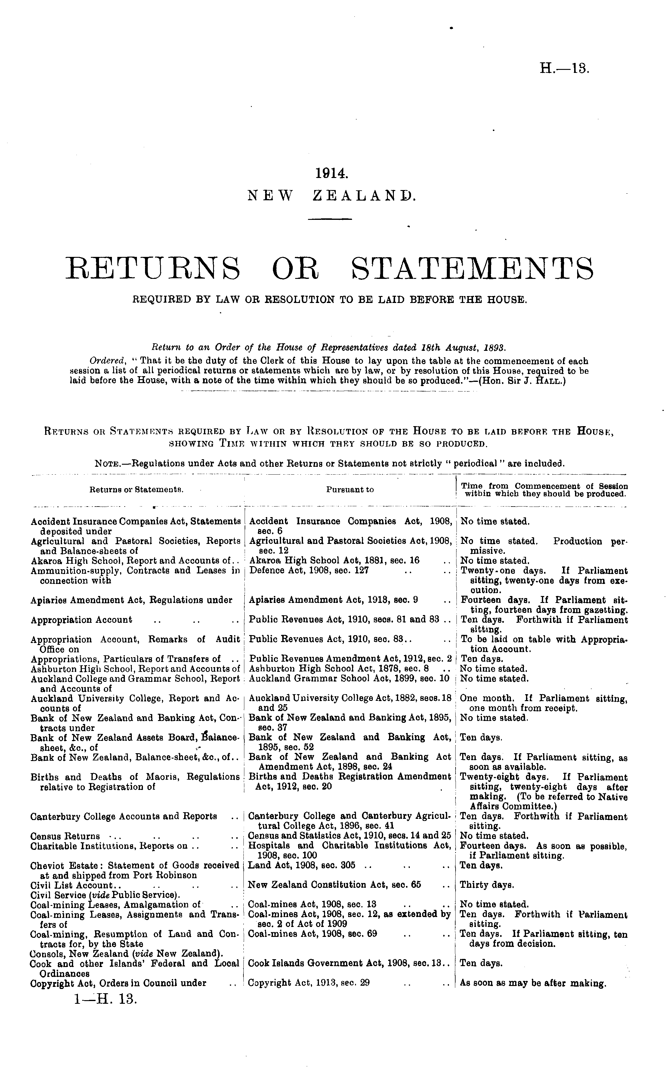 Note. —Regulations under Acts and other Returns or Statements not strictly " periodical" are included. Returns or Statements. • Pursuant to Time from Commencement of Session within which they should be produced. Acoident Insurance Companies Act, Statements Accident Insurance Companies Aot, 1908, deposited under sec. 6 Agricultural and Pastoral Societies, Reports Agricultural and Pastoral Societies Aot, 1908, and Balance-sheets of sec. 12 Akaroa High School, Report and Accounts of.. Akaroa High School Act, 1881, sec. 16 Ammunition-supply, Contracts and Leases in j Defence Aot, 1908, sec. 127 connection with No time stated. No time stated. Production permissive. No time stated. Twenty-one days. If Parliament sitting, twenty-one days from execution. Fourteen days. If Parliament sitting, fourteen days from gazetting. Ten days. Forthwith if Parliament sitting. To be laid on table with Appropriation Account. Ten days. No time stated. No time stated. Apiaries Amendment Act, Regulations under Apiaries Amendment Act, 1918, sec. 9 Appropriation Account .. .. .. Public Revenues Aot, 1910, seos. 81 and 83 .. Appropriation Acoount, Remarks of Audit Public Revenues Act, 1910, sec 83.. Office on Appropriations, Particulars of Transfers of .. Public Revenues Amendment Act, 1912, sec. 2 Ashburton High School, Report and Accounts of i Ashburton High School Act, 1878, sec. 8 Auckland College and Grammar School, Report Auckland Grammar School Aot, 1899, sec. 10 and Accounts of Auckland University College, Report and Ac- Auokland University College Act, 1882, sees. 18 counts of and 25 Bank of New Zealand and Banking Act, Con- Bank of New Zealand and Banking Act, 1895, tracts under sec. 37 Bank of New Zealand Assets Board, Balance- Bank of New Zealand and Banking Aot, sheet, &c, of - 1895, sec 52 Bank of New Zealand, Balance-sheet, &c, of.. Bank of New Zealand and Banking Act Amendment Act, 1898, sec. 24 Births and Deaths of Maoris, Regulations Births and Deaths Registration Amendment relative to Registration of Act, 1912, sec. 20 One month. If Parliament sitting, one month from receipt. No time stated. Ten days. Canterbury College Accounts and Reports .. Canterbury College and Canterbury Agricultural College Act, 1896, sec. 41 Census Returns ■.. .. .. .. Census and Statistics Act, 1910, sees. 14 and 25 Charitable Institutions, Reports on .. .. Hospitals and Charitable Institutions Act, 1908, sec 100 Cheviot Estate: Statement of Goods received Land Act, 1908, sec. 305 .. at and shipped from Port Robinson Civil List Account.. .. .. . . New Zealand Constitution Act, sec 65 Civil Servioe (wide Public Service). Coal-mining Leases, Amalgamation of .. Coal-mines Aot, 1908, sec. 13 Coal-mining Leases, Assignments and Trans- Coal-mines Act, 1908, sec. 12, as extended by fers of sec 2 of Act of 1909 Coal-mining, Resumption of Land and Con- Coal-mines Act, 1908, sec. 69 tracts for, by the State Consols, New Zealand (vide New Zealand). Cook and other Islands' Federal and Local Cook Islands Government Act, 1908, sec 13.. Ordinances Copyright Aot, Orders in Council under .. Copyright Act, 1913, see. 29 Ten days. If Parliament sitting, as soon as available. Twenty-eight days. If Parliament sitting, twenty-eight days after making. (To be referred to Native Affairs Committee.) Ten days. Forthwith if Parliament sitting. No time stated. Fourteen days. As soon as possible, if Parliament sitting. Ten days. Thirty days. No time stated. Ten days. Forthwith if Parliament sitting. Ten days. If Parliament sitting, ten days from decision. Ten days. As soon as may be after making.